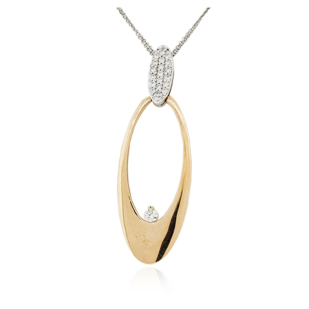 One electronically tested 14KT rose and white gold Ladies die struck & assembled pendant & chain 18.0" long, light open cable link with a lobster claw clasp with a bright polish finish. Identified with markings of "14K". Condition is excellent. Containing: One prong set round brilliant cut diamond, measuring 3.60 - 3.60 x 2.40mm (depth est.) approximate weight of 0.19ct. Clarity of SI-2, Color of H. Nineteen bead set round brilliant cut diamonds, measuring 1.80 - 1.80 x 1.08mm (depth est.) approximate total weight of 19 Stones = 0.43ct. Clarity of SI-2 to I-1, Color of H - I. Total Weight of Diamonds 0.62ct. Total Weight of Pendant & Chain 15.20gm. GGL Appraised at $4,492.00.