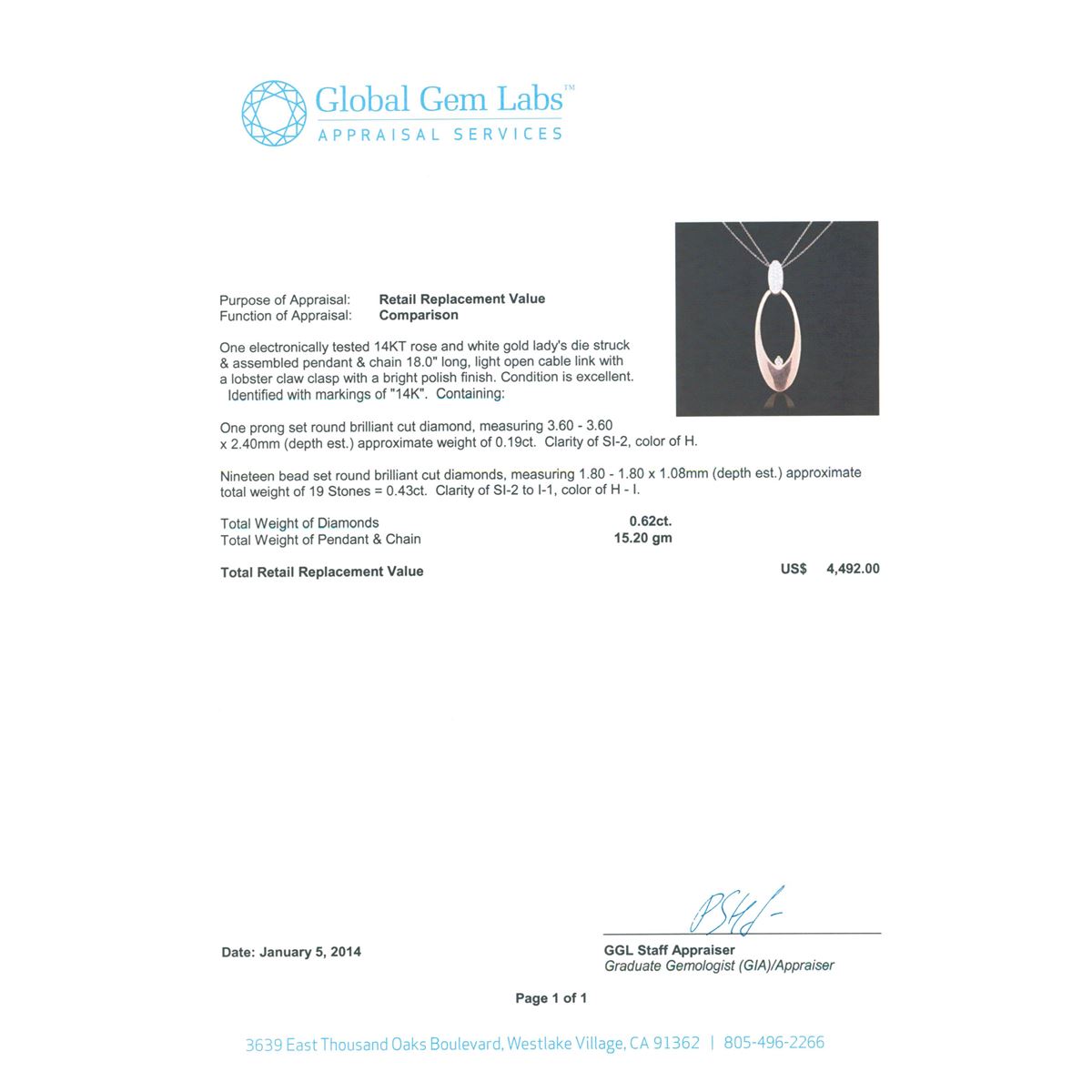 One electronically tested 14KT rose and white gold Ladies die struck & assembled pendant & chain 18.0" long, light open cable link with a lobster claw clasp with a bright polish finish. Identified with markings of "14K". Condition is excellent. Containing: One prong set round brilliant cut diamond, measuring 3.60 - 3.60 x 2.40mm (depth est.) approximate weight of 0.19ct. Clarity of SI-2, Color of H. Nineteen bead set round brilliant cut diamonds, measuring 1.80 - 1.80 x 1.08mm (depth est.) approximate total weight of 19 Stones = 0.43ct. Clarity of SI-2 to I-1, Color of H - I. Total Weight of Diamonds 0.62ct. Total Weight of Pendant & Chain 15.20gm. GGL Appraised at $4,492.00.