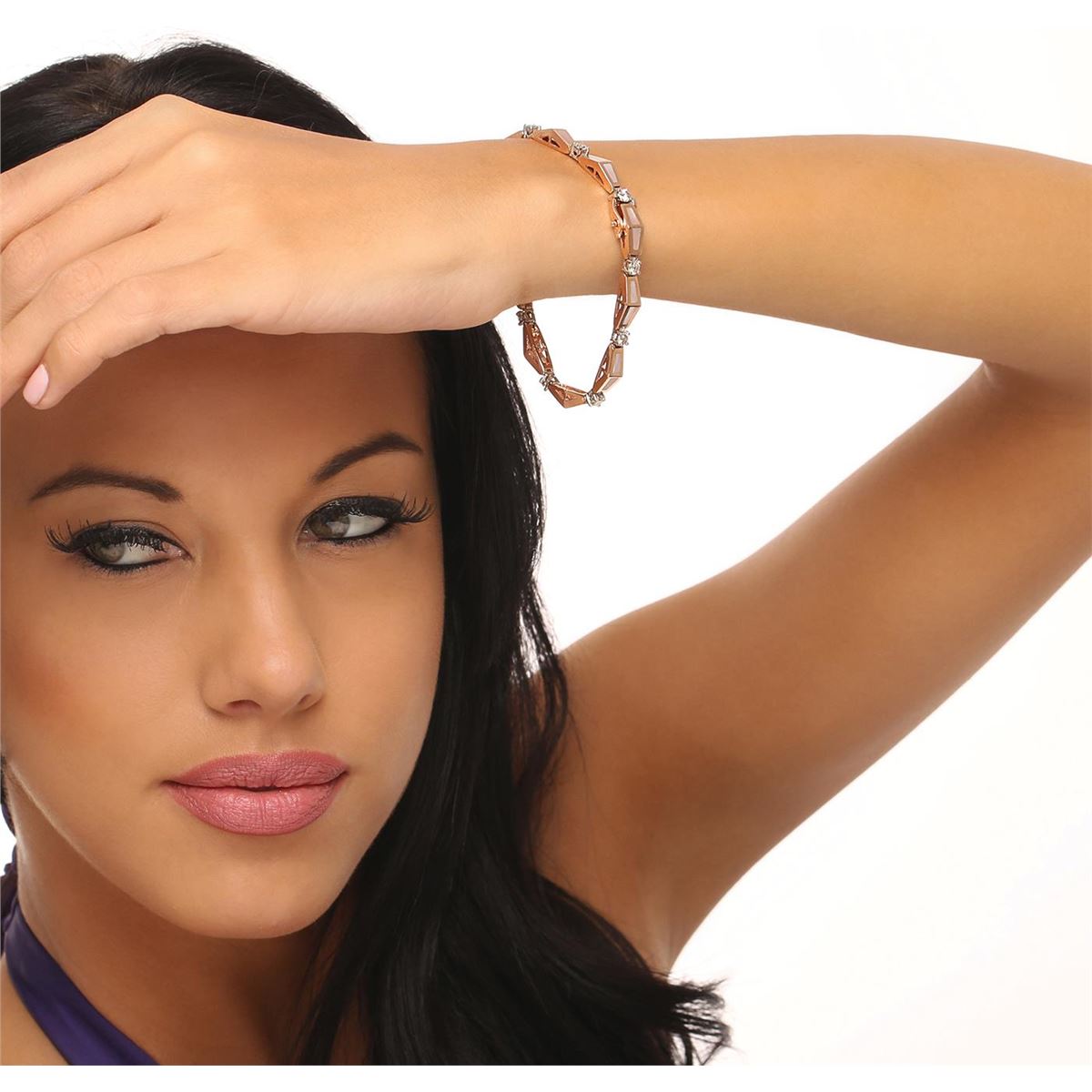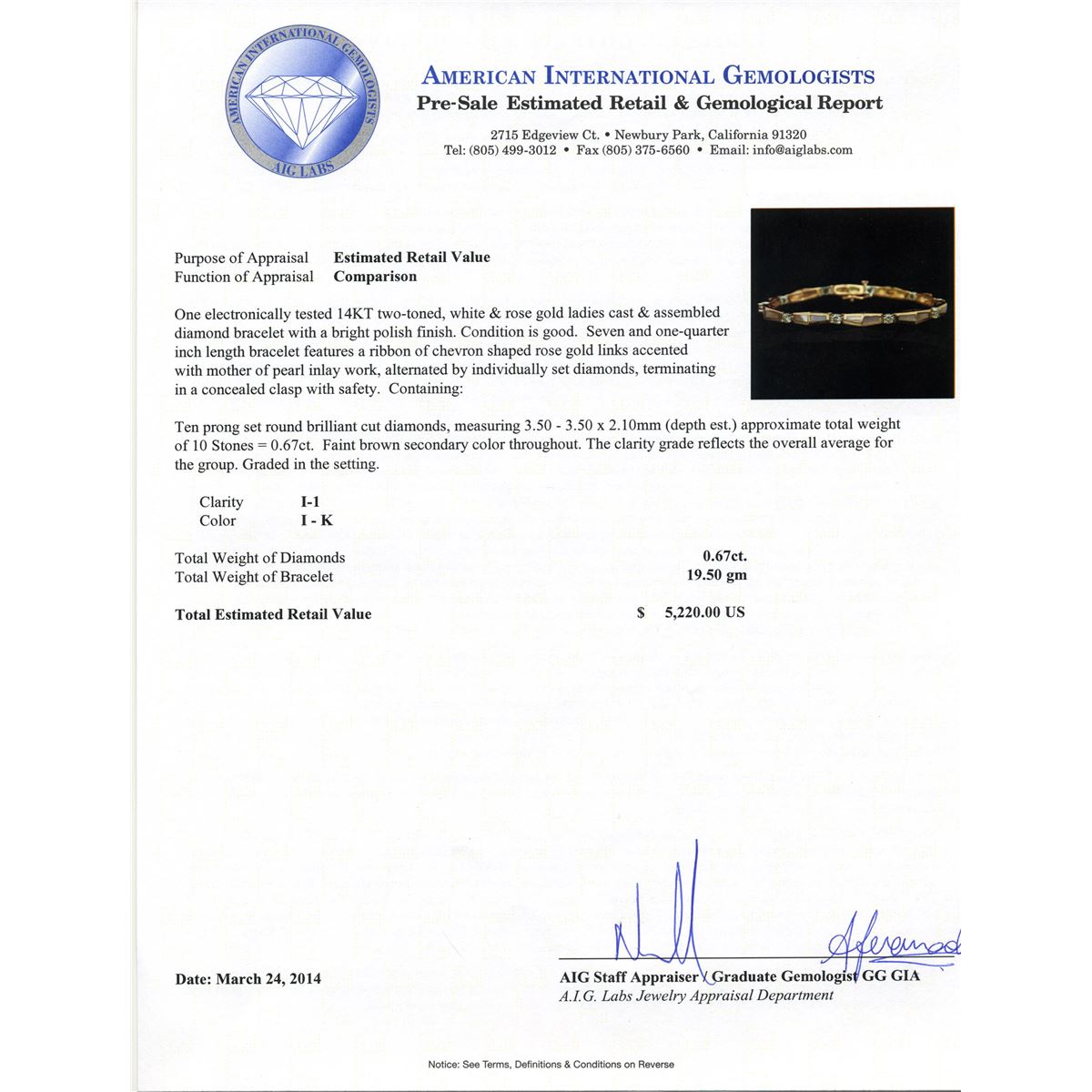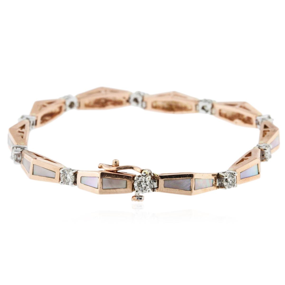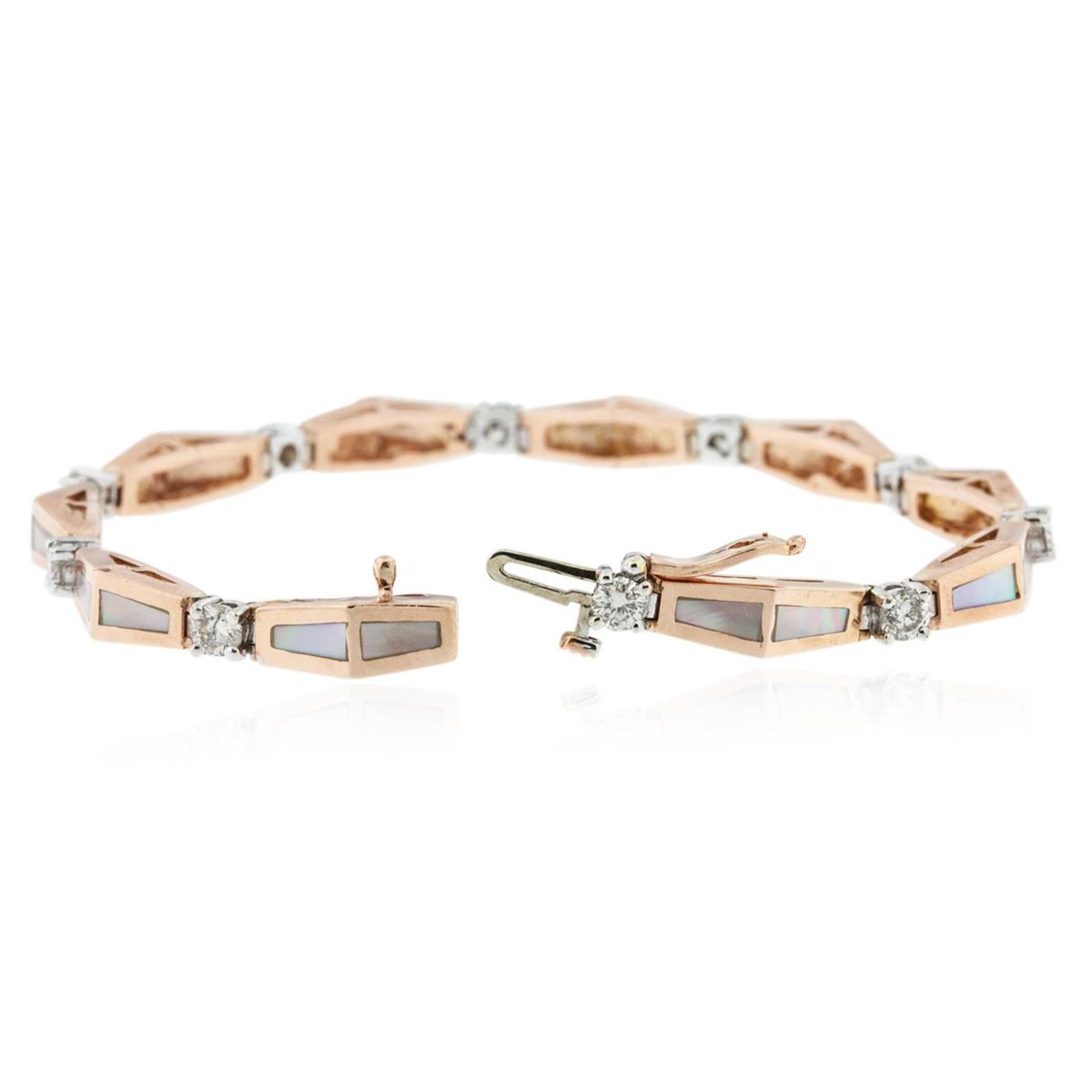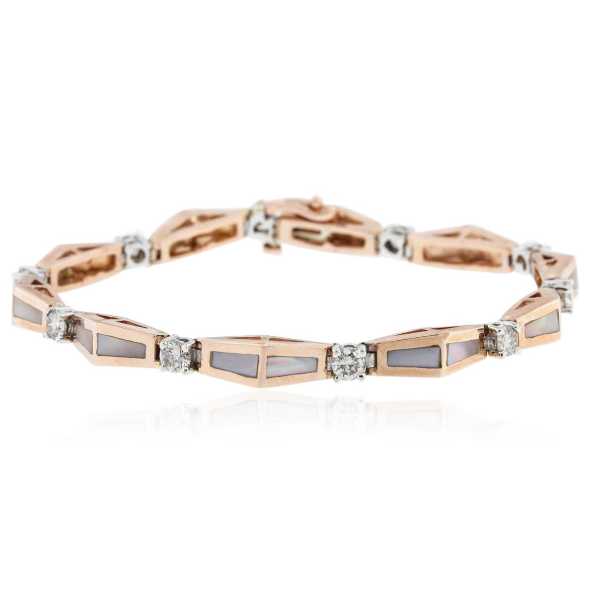 One electronically tested 14KT two-toned white and gold ladies cast and assembled diamond bracelet with a bright polish finish. Condition is good. Seven and one quarter inch length bracelet features a ribbon of chevron shaped rose gold links accented with mother or pearl inlay work, alternated by individually set diamonds, terminating in a concealed clasp with safety. Containing: Ten prong set round brilliant cut diamonds, measuring 3.50 - 3.50 x 2.10mm (depth est) approximate total weight of 10 stones = 0.67ct. Faint brown secondary color throughout. The clarity grade reflects the overall average for the group. Graded in the setting. Clarity I-1 Color I-K. Total weight of diamonds 0.67ct. Total weight of bracelet 19.50 grams. AIG Appraised at $5,220.00.