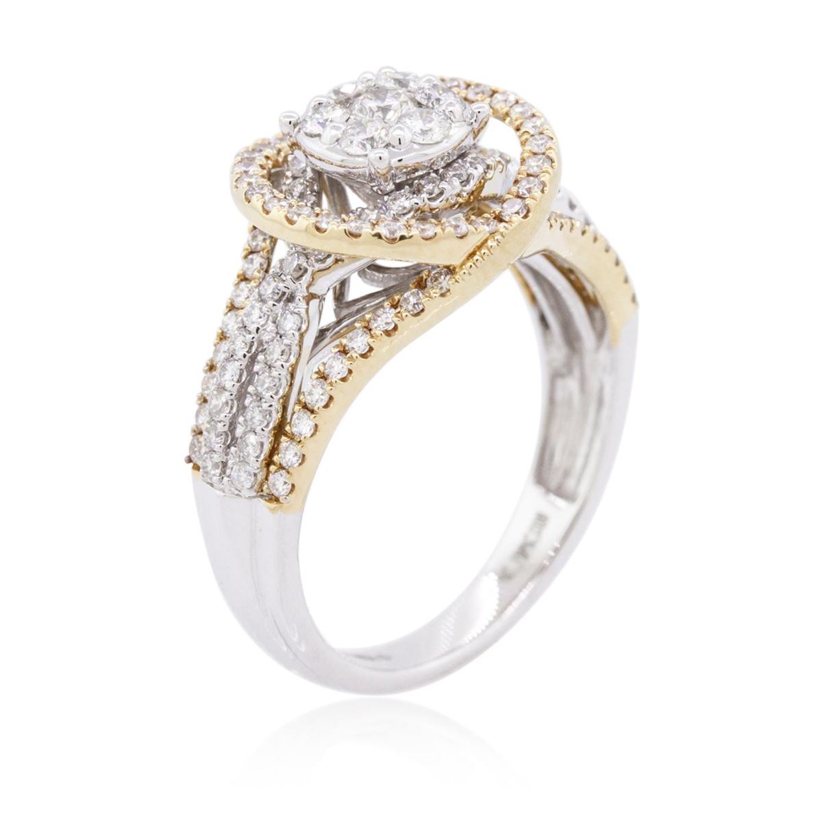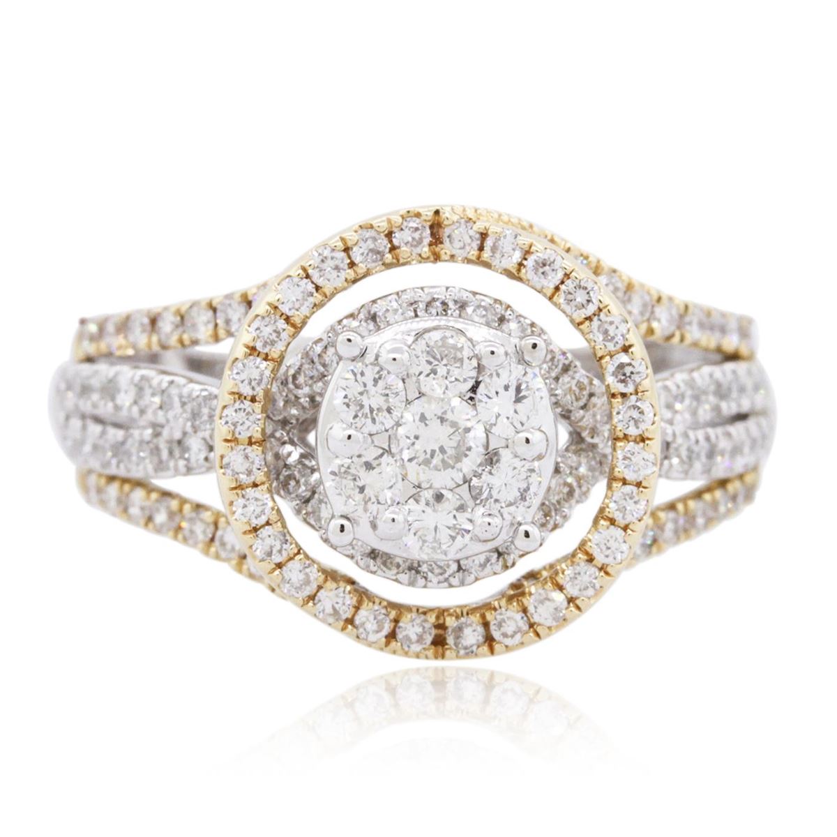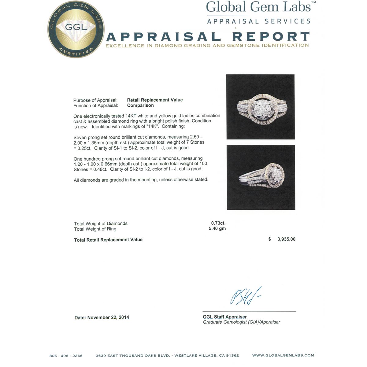 One electronically tested 14KT white and yellow gold ladies combination cast & assembled diamond ring with a bright polish finish. Identified with markings of "14K". Condition is new. Containing: Seven prong set round brilliant cut diamonds, measuring 2.50 - 2.00 x 1.35mm (depth est.) approximate total weight of 7 Stones = 0.25ct. Clarity: SI-1 to SI-2. Color: I - J, Cut is Good. One Hundred prong set round brilliant cut diamonds, measuring 1.20 - 1.00 x 0.66mm (depth est.) approximate total weight of 100 Stones = 0.48ct. Clarity: SI-2 to I-2. Color: I - J, Cut is Good. All diamonds are graded in the mounting, unless otherwise stated. Total Weight of Diamonds 0.73ct. Total Weight of Ring 5.40 grams. GGL Appraised at $3,935.00.