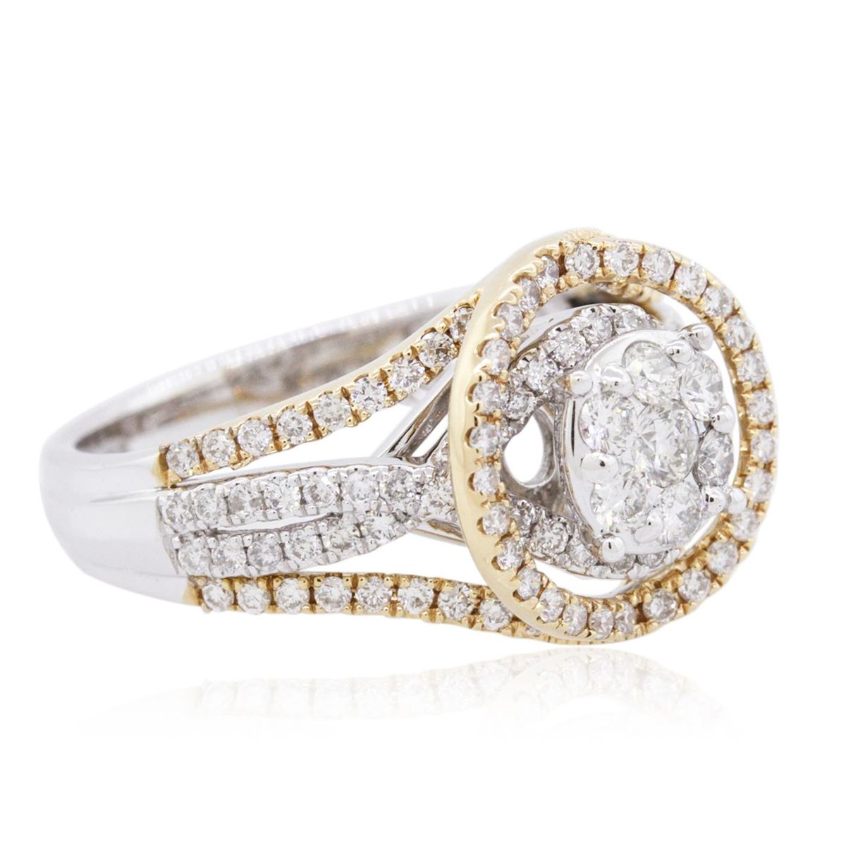 One electronically tested 14KT white and yellow gold ladies combination cast & assembled diamond ring with a bright polish finish. Identified with markings of "14K". Condition is new. Containing: Seven prong set round brilliant cut diamonds, measuring 2.50 - 2.00 x 1.35mm (depth est.) approximate total weight of 7 Stones = 0.25ct. Clarity: SI-1 to SI-2. Color: I - J, Cut is Good. One Hundred prong set round brilliant cut diamonds, measuring 1.20 - 1.00 x 0.66mm (depth est.) approximate total weight of 100 Stones = 0.48ct. Clarity: SI-2 to I-2. Color: I - J, Cut is Good. All diamonds are graded in the mounting, unless otherwise stated. Total Weight of Diamonds 0.73ct. Total Weight of Ring 5.40 grams. GGL Appraised at $3,935.00.
