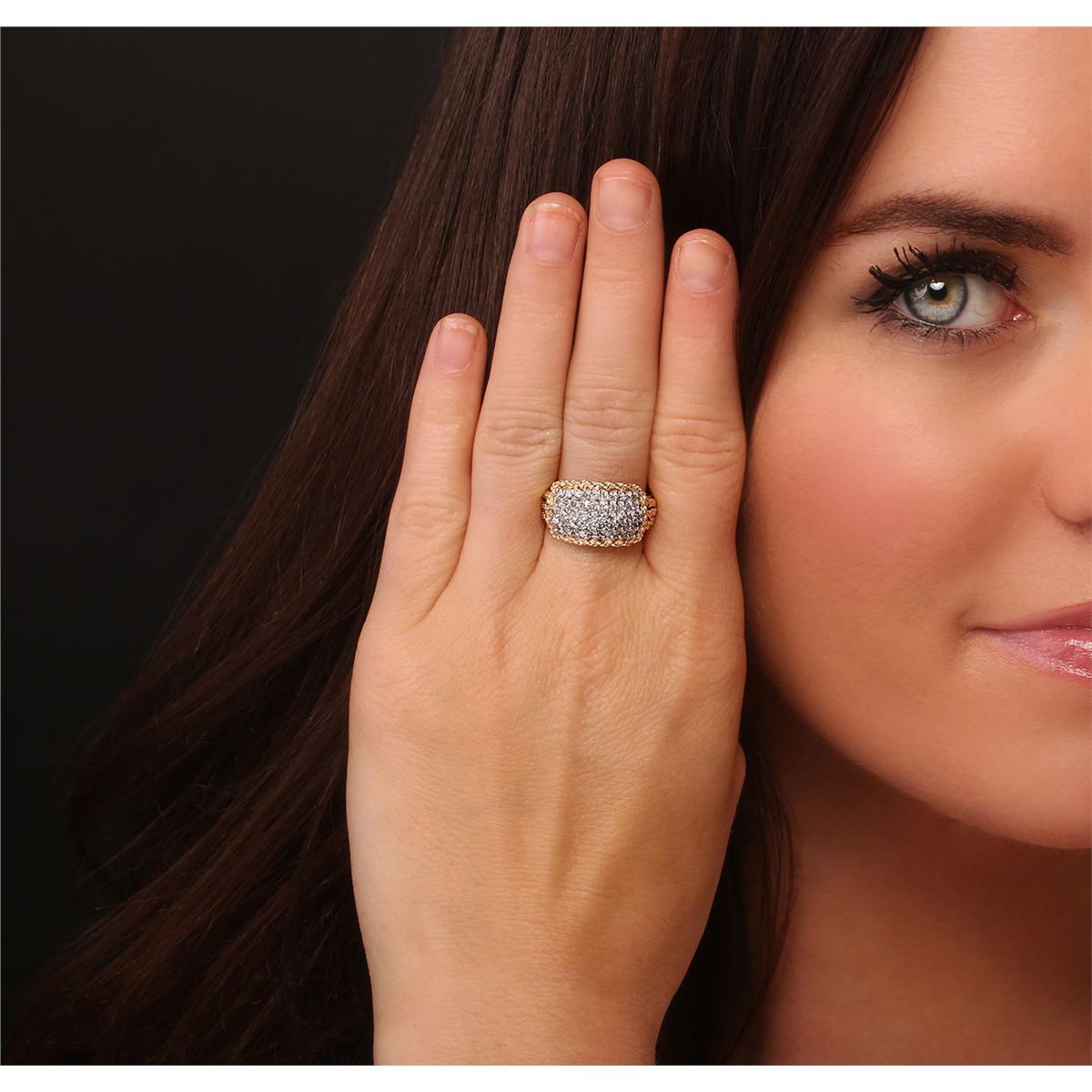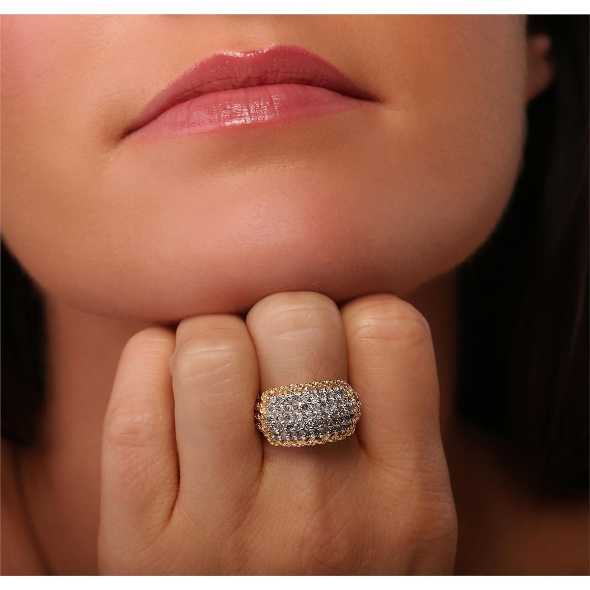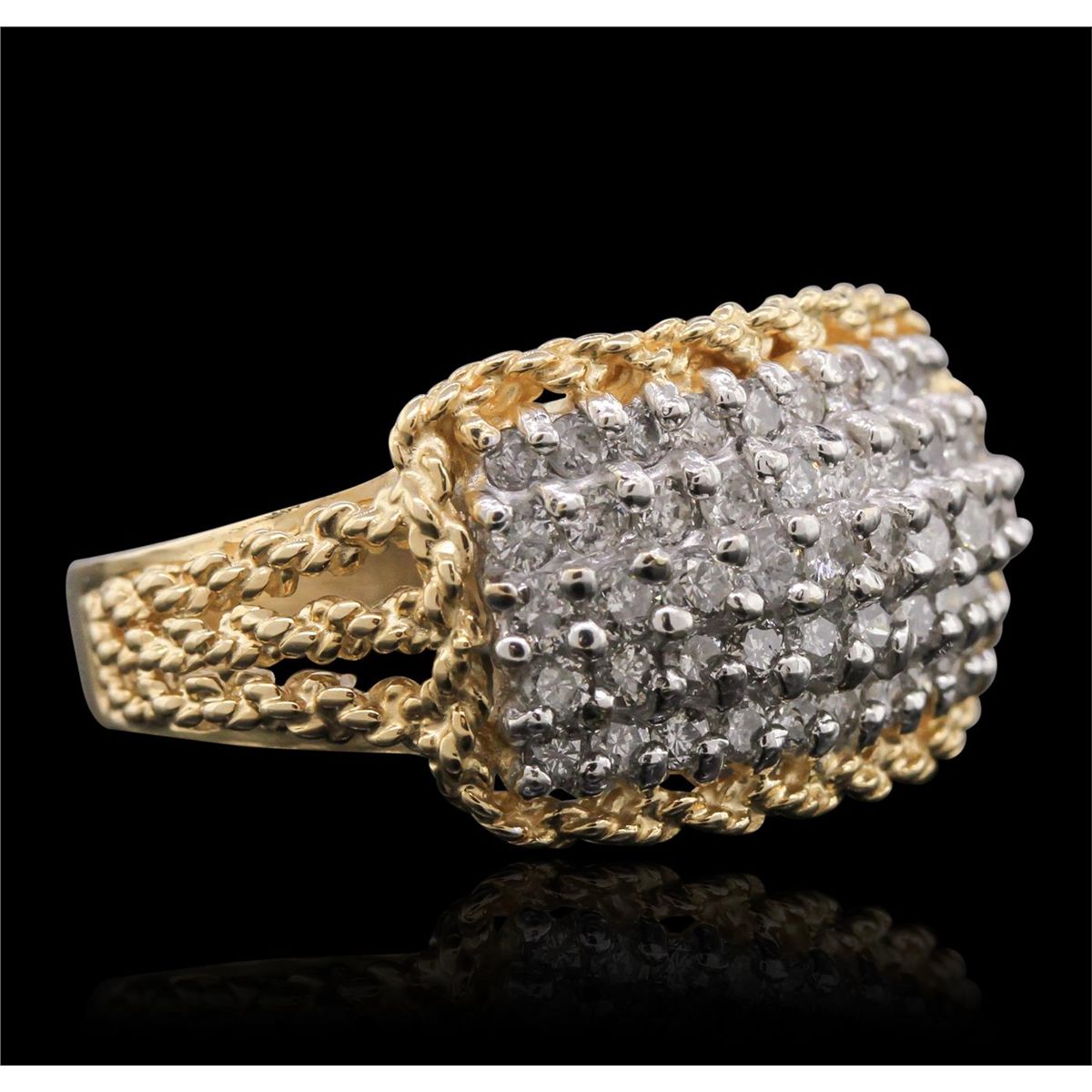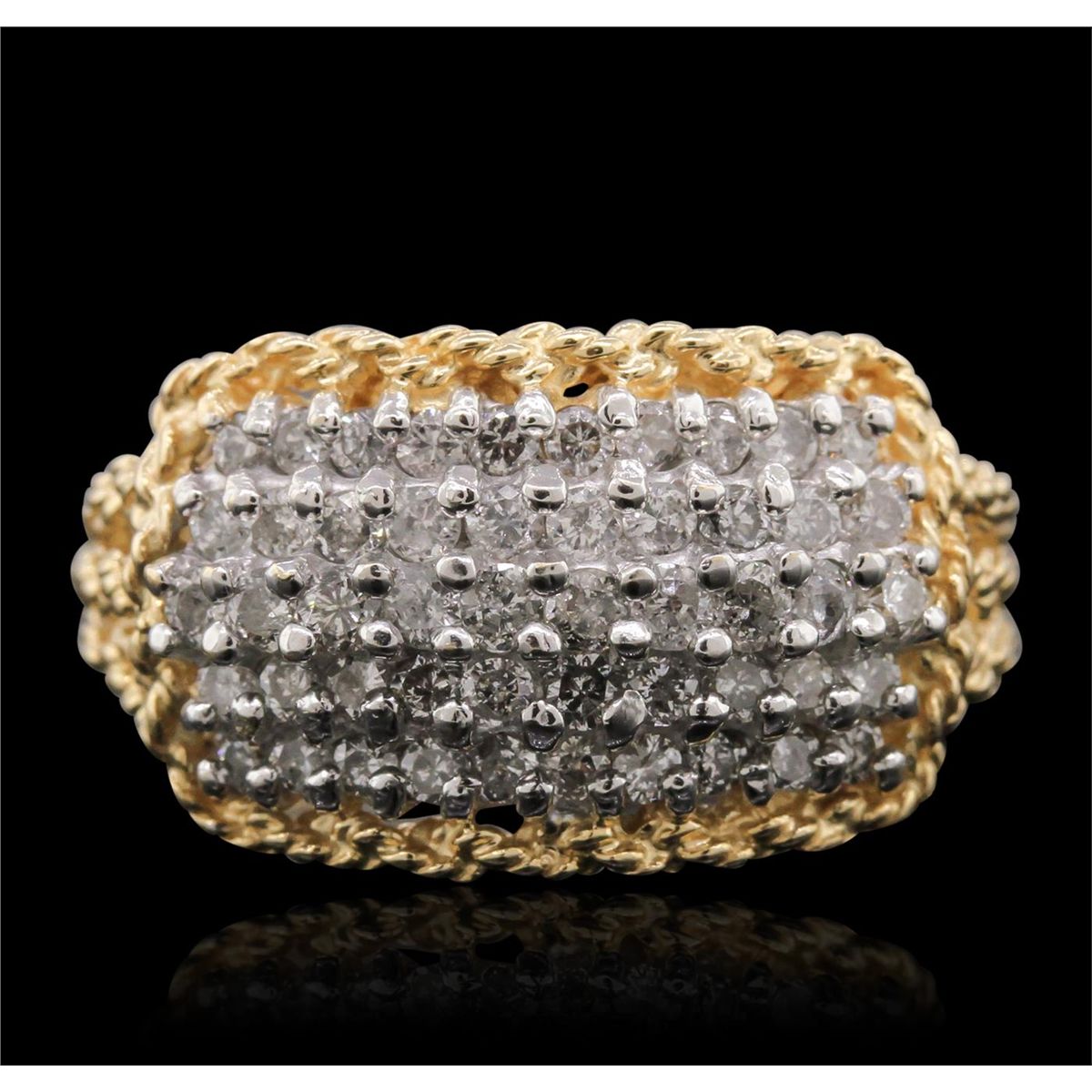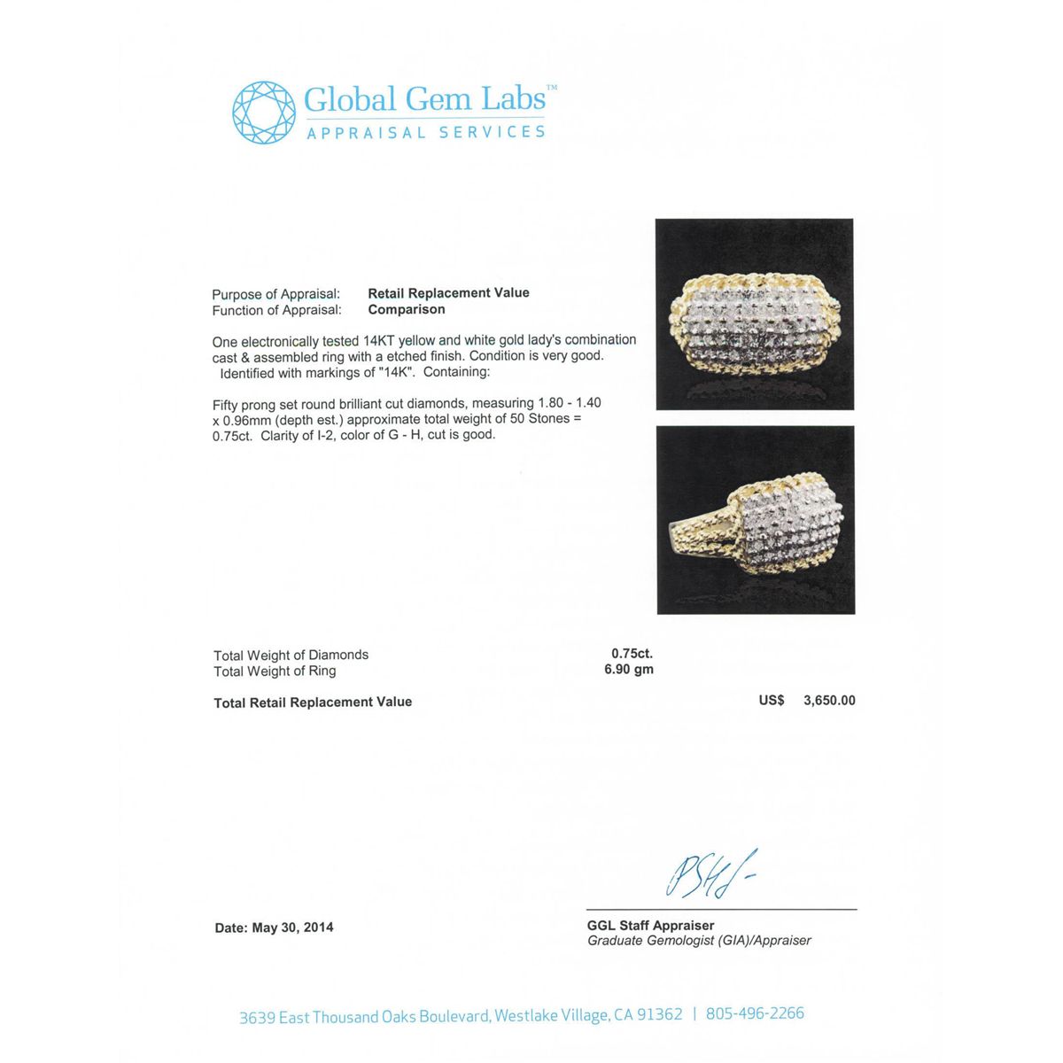 One electronically tested 14KT yellow and white gold Ladies combination cast & assembled ring with a etched finish. Condition is very good. Identified with markings of "14K". Containing: Fifty prong set round brilliant cut diamonds, measuring 1.80 - 1.40 x 0.96mm (depth est.) approximate. Total Weight of 50 Stones = 0.75ct. Clarity: I-2. Color: G - H, Cut is Good. Total Weight of Diamonds 0.75ct. Total Weight of Ring 6.90 grams. GGL Appraised at $3,650.00.
