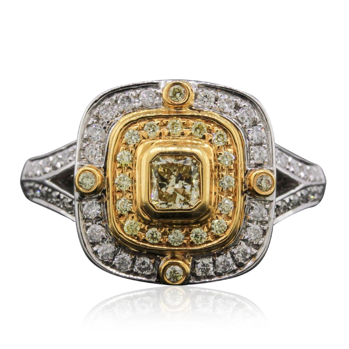 One electronically tested 14KT white and yellow gold ladies combination cast & assembled engagement ring with a split shank with a bright polish finish. Identified with markings of "14K". Condition is new. Containing: One bezel set radiant shaped cut diamond, measuring 3.80 x 3.80 x 2.85mm (depth est.) approximate weight of 0.34ct. Clarity: VS-2, Cut is Good. Four bezel set round brilliant cut diamonds, measuring 1.40 - 1.40 x 0.84mm (depth est.) approximate total weight of 4 Stones = 0.04ct. Clarity: SI-1 to SI-2, Cut is Good. Sixteen prong set round brilliant cut diamonds, measuring 1.30 - 1.30 x 0.78mm (depth est.) approximate total weight of 16 Stones = 0.13ct. Clarity: SI-1 to SI-2, Cut is Good. Forty-Four prong set round brilliant cut diamonds, measuring 1.20 - 1.20 x 0.72mm (depth est.) approximate total weight of 44 Stones = 0.28ct. Clarity: SI-2 to I-1. Color: H - I, Cut is Good. All diamonds are graded in the mounting, unless otherwise stated. Total Weight of Diamonds 0.78ct. Total Weight of Ring 5.80 grams. GGL Appraised at $6,890.00.