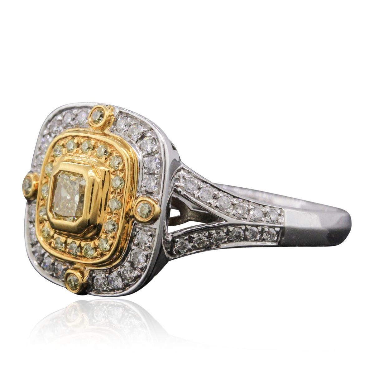 One electronically tested 14KT white and yellow gold ladies combination cast & assembled engagement ring with a split shank with a bright polish finish. Identified with markings of "14K". Condition is new. Containing: One bezel set radiant shaped cut diamond, measuring 3.80 x 3.80 x 2.85mm (depth est.) approximate weight of 0.34ct. Clarity: VS-2, Cut is Good. Four bezel set round brilliant cut diamonds, measuring 1.40 - 1.40 x 0.84mm (depth est.) approximate total weight of 4 Stones = 0.04ct. Clarity: SI-1 to SI-2, Cut is Good. Sixteen prong set round brilliant cut diamonds, measuring 1.30 - 1.30 x 0.78mm (depth est.) approximate total weight of 16 Stones = 0.13ct. Clarity: SI-1 to SI-2, Cut is Good. Forty-Four prong set round brilliant cut diamonds, measuring 1.20 - 1.20 x 0.72mm (depth est.) approximate total weight of 44 Stones = 0.28ct. Clarity: SI-2 to I-1. Color: H - I, Cut is Good. All diamonds are graded in the mounting, unless otherwise stated. Total Weight of Diamonds 0.78ct. Total Weight of Ring 5.80 grams. GGL Appraised at $6,890.00.