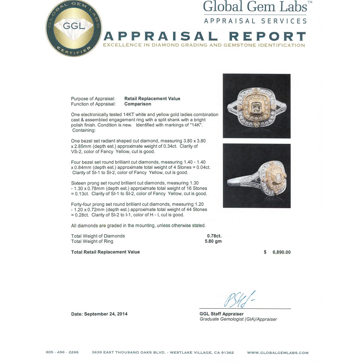 One electronically tested 14KT white and yellow gold ladies combination cast & assembled engagement ring with a split shank with a bright polish finish. Identified with markings of "14K". Condition is new. Containing: One bezel set radiant shaped cut diamond, measuring 3.80 x 3.80 x 2.85mm (depth est.) approximate weight of 0.34ct. Clarity: VS-2, Cut is Good. Four bezel set round brilliant cut diamonds, measuring 1.40 - 1.40 x 0.84mm (depth est.) approximate total weight of 4 Stones = 0.04ct. Clarity: SI-1 to SI-2, Cut is Good. Sixteen prong set round brilliant cut diamonds, measuring 1.30 - 1.30 x 0.78mm (depth est.) approximate total weight of 16 Stones = 0.13ct. Clarity: SI-1 to SI-2, Cut is Good. Forty-Four prong set round brilliant cut diamonds, measuring 1.20 - 1.20 x 0.72mm (depth est.) approximate total weight of 44 Stones = 0.28ct. Clarity: SI-2 to I-1. Color: H - I, Cut is Good. All diamonds are graded in the mounting, unless otherwise stated. Total Weight of Diamonds 0.78ct. Total Weight of Ring 5.80 grams. GGL Appraised at $6,890.00.