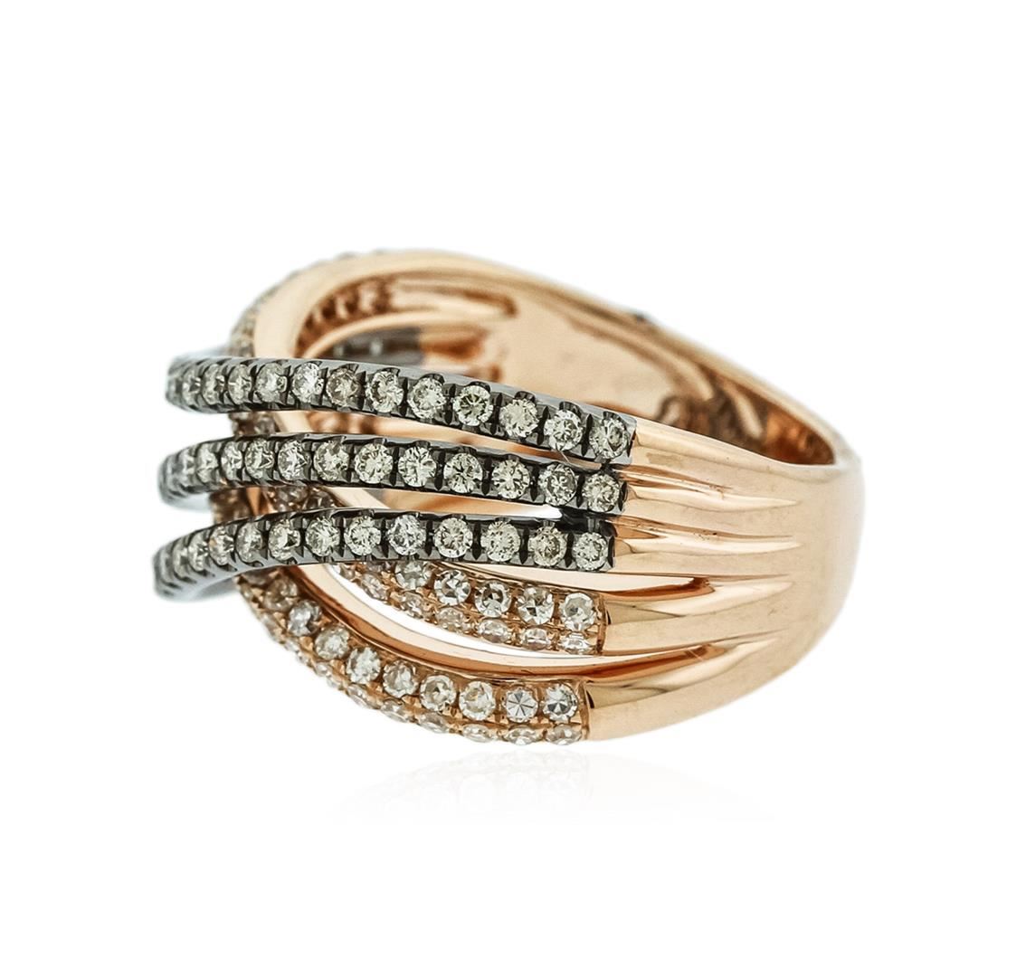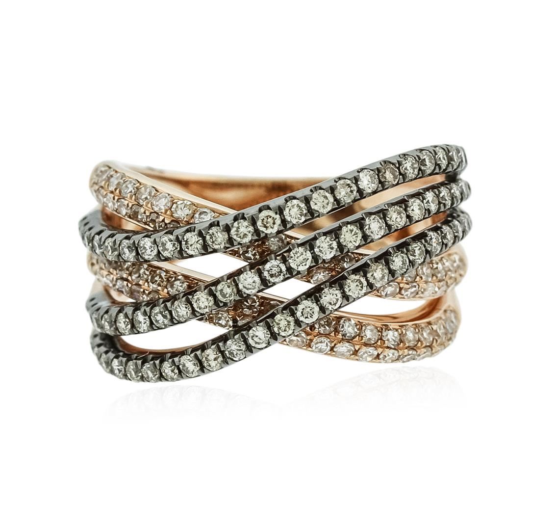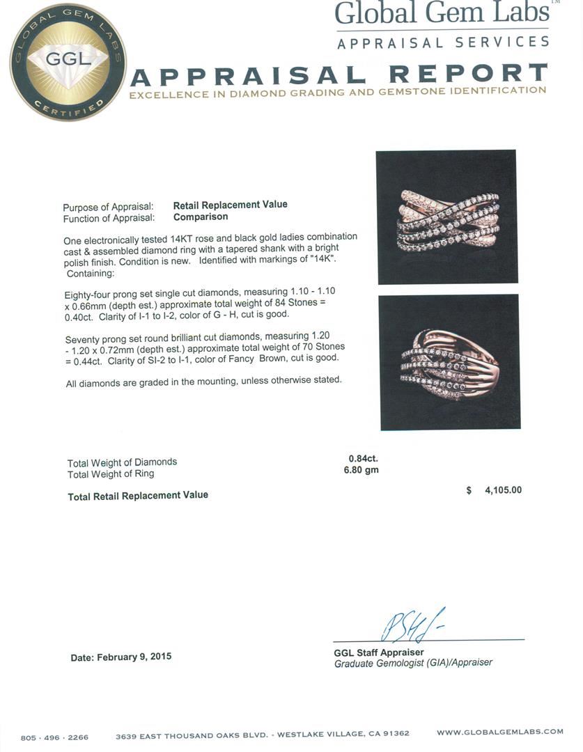 One electronically tested 14KT rose and black gold ladies combination cast & assembled diamond ring with a tapered shank with a bright polish finish. Identified with markings of "14K". Condition is new. Containing: Eighty-Four prong set single cut diamonds, measuring 1.10 - 1.10 x 0.66mm (depth est.) approximate total weight of 84 Stones = 0.40ct. Clarity: I-1 to I-2. Color: G - H, Cut is Good. Seventy prong set round brilliant cut diamonds, measuring 1.20 - 1.20 x 0.72mm (depth est.) approximate total weight of 70 Stones = 0.44ct. Clarity: SI-2 to I-1, Color of Fancy Brown, Cut is Good. All diamonds are graded in the mounting, unless otherwise stated. Total Weight of Diamonds 0.84ct. Total Weight of Ring 6.80 grams. GGL Appraised at $4,105.00.