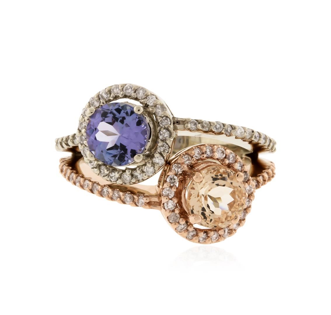 One electronically tested 14KT white and rose gold ladies cast tanzanite, morganite and diamond ring with a bright polish finish. Identified with markings of "14K". Condition is new. Containing: One prong set round modified brilliant cut natural tanzanite, measuring 6.20 - 6.20 x 4.03 mm, approximate weight of 1.04ct., clarity is eye clean, type I, light, very slightly grayish, violet color, (GIA V 3/3), cut is good. One prong set round modified brilliant cut natural morganite, measuring 6.30 - 6.30 x 4.10 mm, approximate weight of 0.89ct., clarity is eye clean, type I, light, brownish, reddish orange color, (GIA rO 3/1), cut is good. Seventy-Eight prong set round brilliant cut diamonds, measuring 1.20 - 1.20 x 0.72mm (depth est.) approximate total weight of 78 Stones = 0.49ct. Clarity: SI-2 to I-1. Color: I - J, Cut is Good. Colored gemstones are presumed to have been subjected to commonly used enhancement processes. All diamonds and colored gemstones are graded in the mounting, unless otherwise stated. Total Weight of Colored Stones 1.93ct. Total Weight of Diamonds 0.49ct. Total Weight of Ring 6.20 grams. GGL Appraised at $3,755.00.