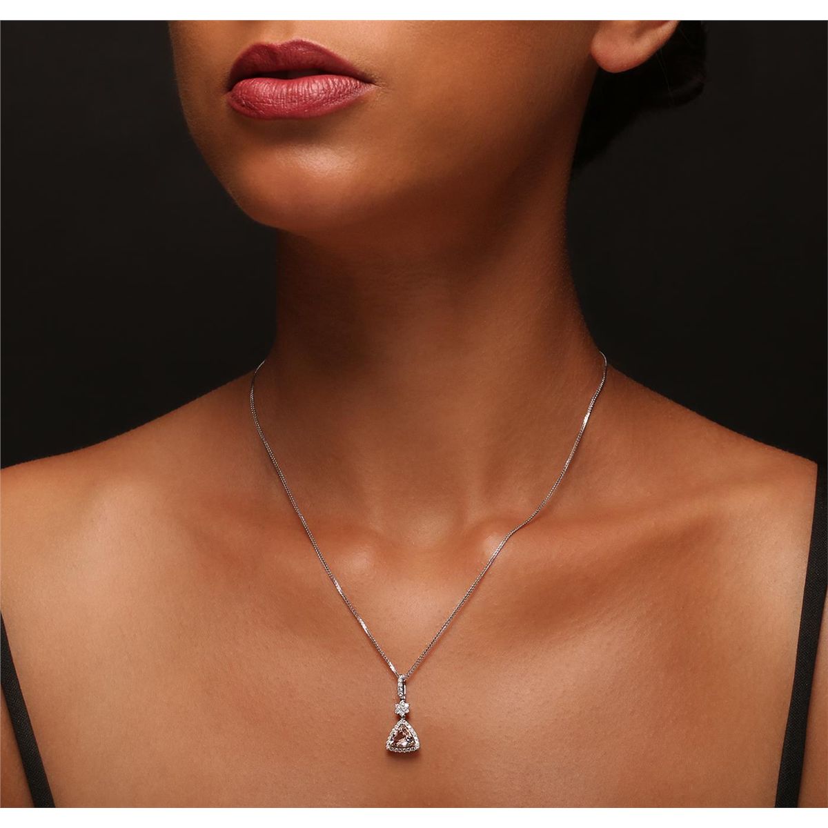 One electronically tested 14KT white and yellow gold Ladies combination cast & assembled pendant with a bright polish finish. Condition is new. Identified with markings of "14K". Containing: Twenty-Six prong set round brilliant cut diamonds, measuring 1.25 - 1.25 x 0.75mm (depth est.) approximate. Total Weight of 26 Stones = 0.25ct. Clarity: SI-2 to I-1. Color: G - H, Cut is Good. Seven prong set round brilliant cut diamonds, measuring 1.60 - 1.60 x 0.96mm (depth est.) approximate. Total Weight of 7 Stones = 0.20ct. Clarity: SI-2 to I-1. Color: G - H, Cut is Good. One prong set triangle modified brilliant cut natural morganite, measuring 8.20 x 8.20 x 3.80mm, exact weight 1.06ct., clarity is eye clean, type I, light, brownish, red orange color, (GIA RO 3/1), cut is good. Colored gemstones are presumed to have been subjected to commonly used color/clarity enhancement processes. Total Weight of Colored Stones 1.06ct. Total Weight of Diamonds 0.45ct. Total Weight of Pendant 3.30 grams. GGL Appraised at $3,500.00.