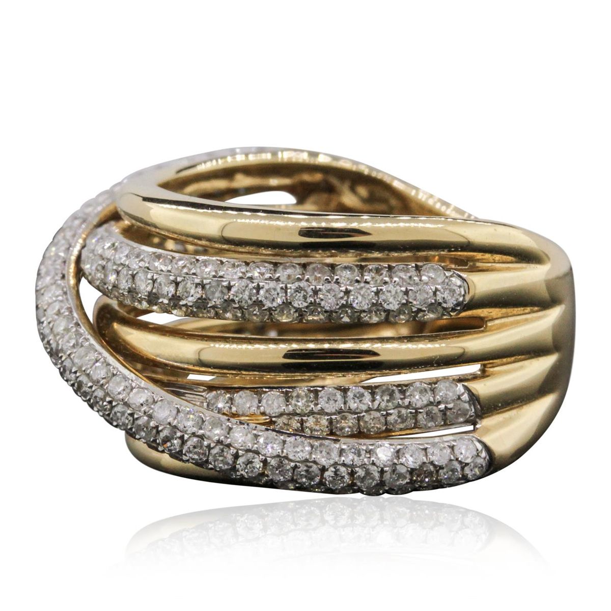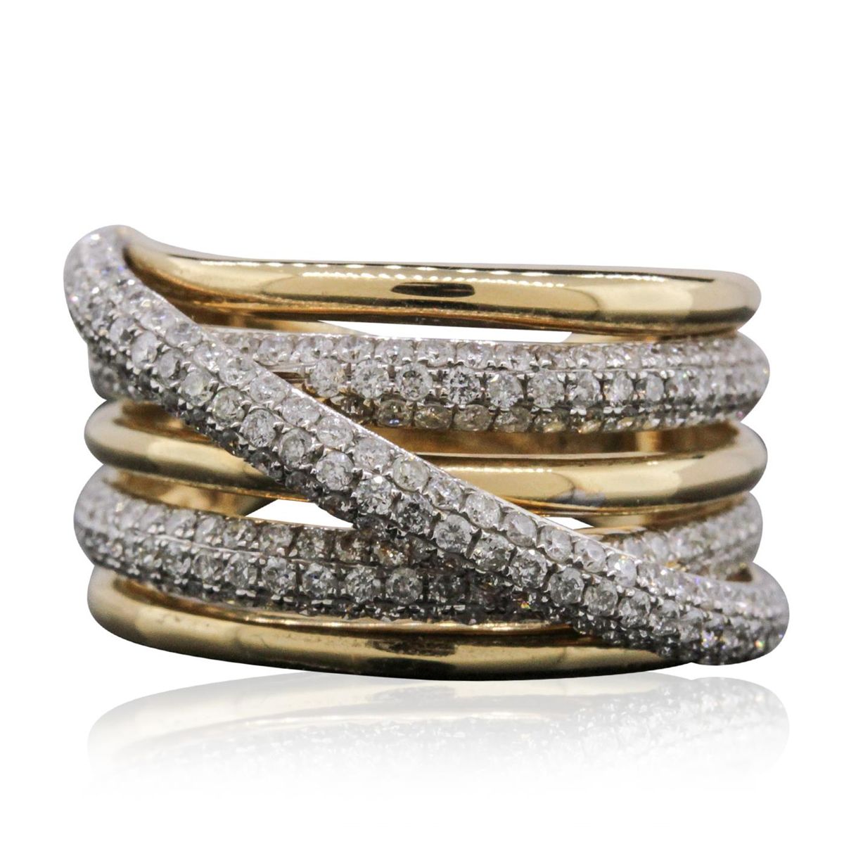 One electronically tested 14KT yellow and white gold ladies combination cast & assembled diamond ring with a split shank with a bright polish finish. Identified with markings of "14K". Condition is new. Containing: Two Hundred Twenty-Five prong set round brilliant cut diamonds, measuring 1.10 - 1.10 x 0.66mm (depth est.) approximate total weight of 225 Stones = 1.08ct. Clarity: I-1 to I-2. Color: I - J, Cut is Good. All diamonds are graded in the mounting, unless otherwise stated. Total Weight of Diamonds 1.08ct. Total Weight of Ring 7.50 grams. GGL Appraised at $6,075.00.