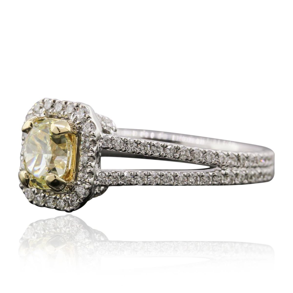 One electronically tested 14KT white and yellow gold Ladies combination cast & assembled engagement ring with a bright polish finish. Condition is new. Identified with markings of "14K". Containing: One prong set oval shaped cut diamond, measuring 5.90 x 4.90 x 4.60mm (depth est.) approximate weight of 0.83ct. Clarity: VS-2, Cut is Good. Sixty bead set round brilliant cut diamonds, measuring 1.10 - 1.10 x 0.66mm (depth est.) approximate. Total Weight of 60 Stones = 0.29ct. Clarity: I-1 to I-2. Color: H - I, Cut is Good. Total Weight of Diamonds 1.12ct. Total Weight of Ring 4.00 grams. GGL Appraised at $12,065.00.
