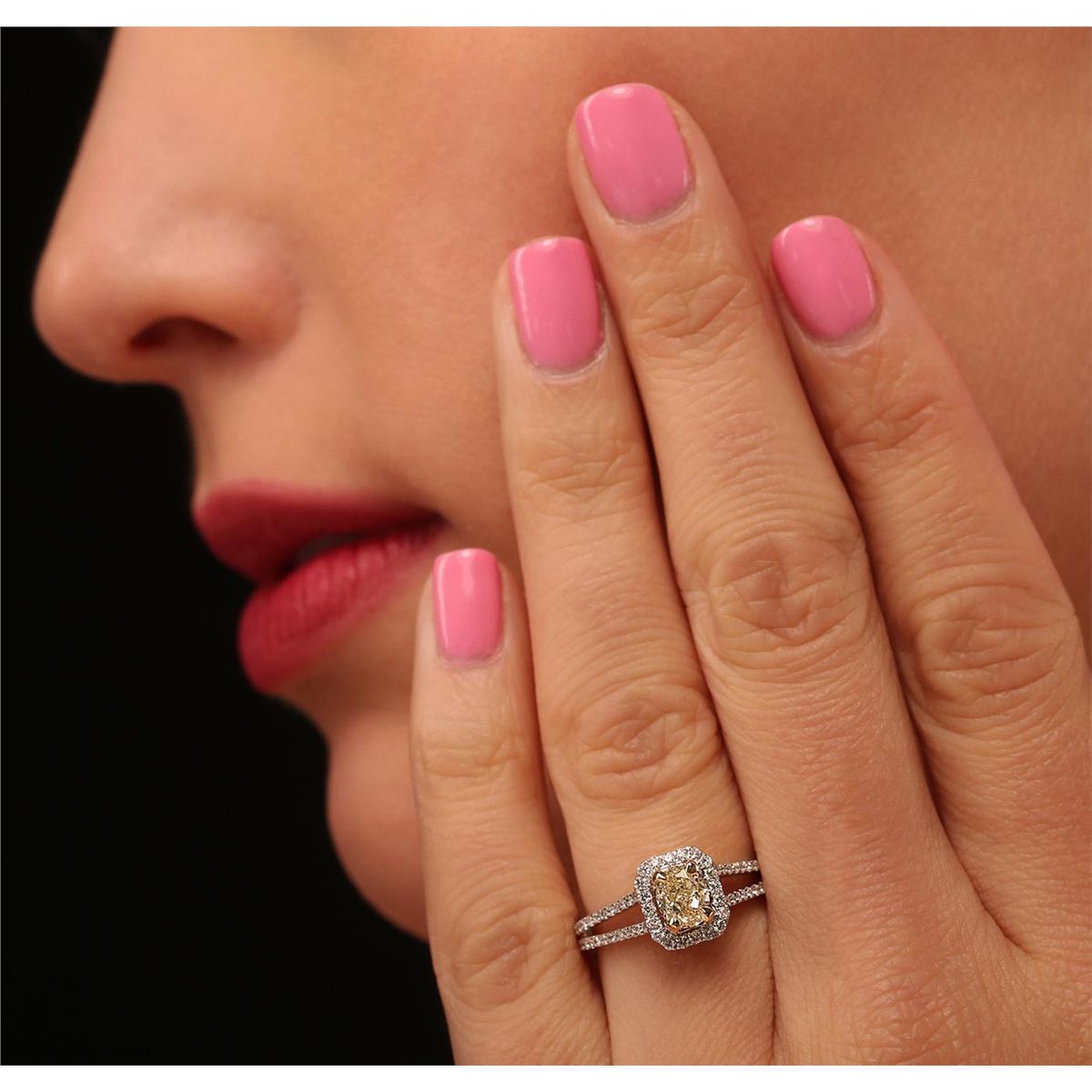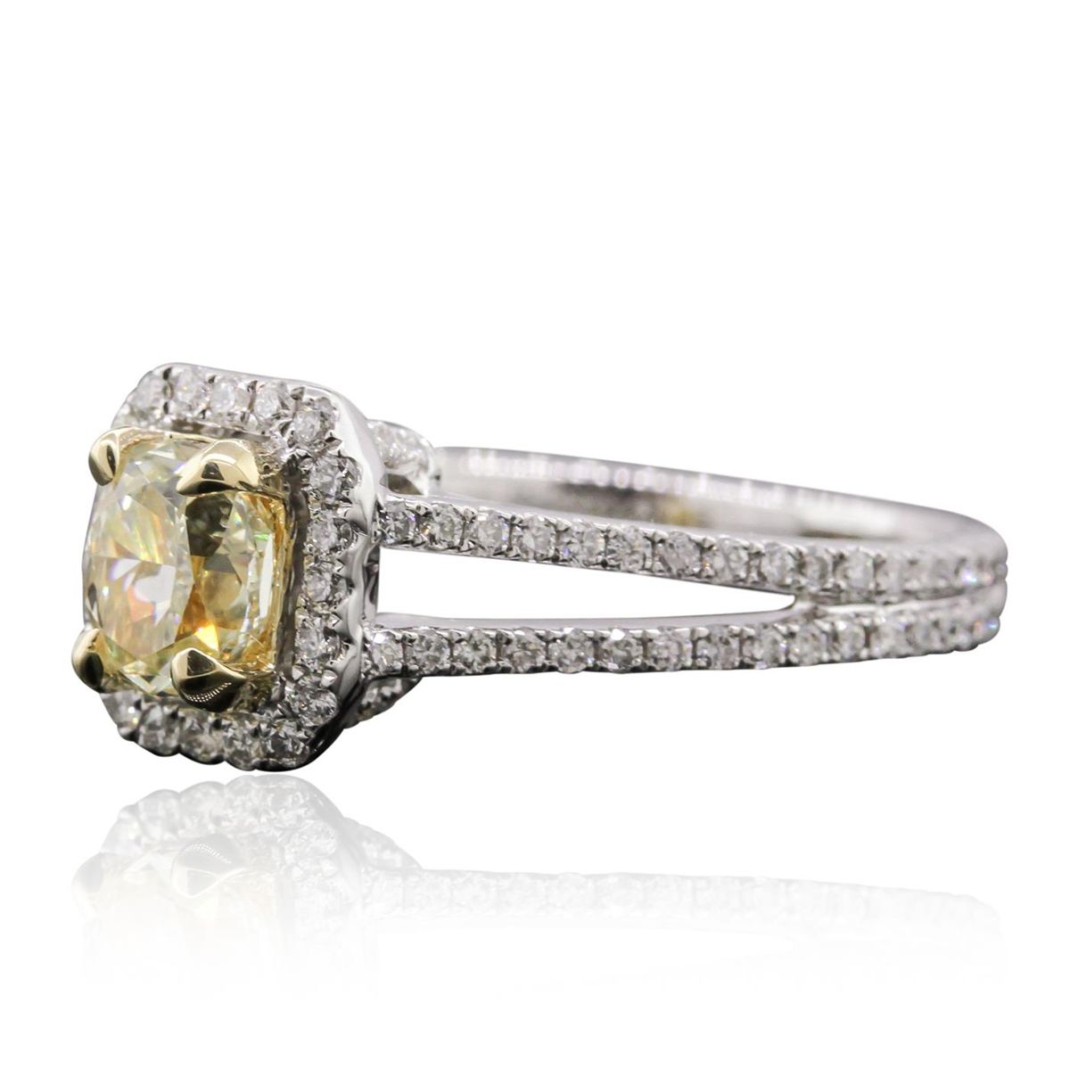 One electronically tested 14KT white and yellow gold Ladies combination cast & assembled engagement ring with a bright polish finish. Condition is new. Identified with markings of "14K". Containing: One prong set oval shaped cut diamond, measuring 5.99 x 4.80 x 4.32mm (depth est.) approximate weight of 0.78ct. Clarity: VS-2, Cut is Good. One Hundred prong set round brilliant cut diamonds, measuring 1.00 - 1.00 x 0.60mm (depth est.) approximate. Total Weight of 100 Stones = 0.36ct. Clarity: SI-2 to I-1, Cut is Good. Total Weight of Diamonds 1.14ct. Total Weight of Ring 4.20 grams. GGL Appraised at $11,720.00.