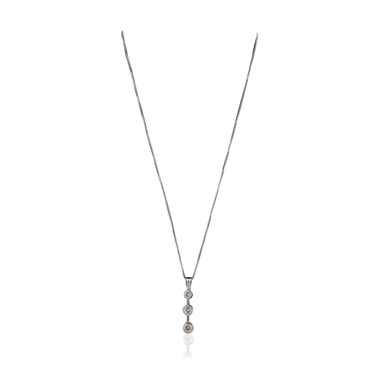 One electronically tested 14KT yellow and white gold ladies combination cast & die struck pendant & chain 18.0" long, light cable link with a spring ring clasp with a bright polish finish. Condition is new. Identified with markings of "14K". Containing: One bezel set round brilliant cut diamond, measuring 5.00 - 5.00 x 3.00mm (depth est.) approximate weight of 0.46ct. Clarity: VS-2, Cut is Very Good. One bezel set round brilliant cut diamond, measuring 4.80 - 4.80 x 2.88mm (depth est.) approximate weight of 0.41ct. Clarity: VS-2. Color: J, Cut is Good. One bezel set round brilliant cut diamond, measuring 4.30 - 4.30 x 2.58mm (depth est.) approximate weight of 0.29ct. Clarity: VS-2. Color: I, Cut is Good. All diamonds are graded in the mounting, unless otherwise stated. Total Weight of Diamonds 1.15ct. Total Weight of Pendant & Chain 5.30 grams. GGL Appraised at $5,660.00.