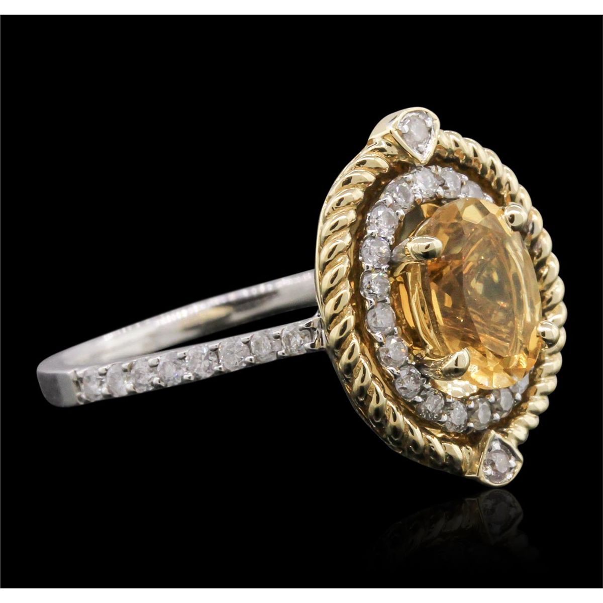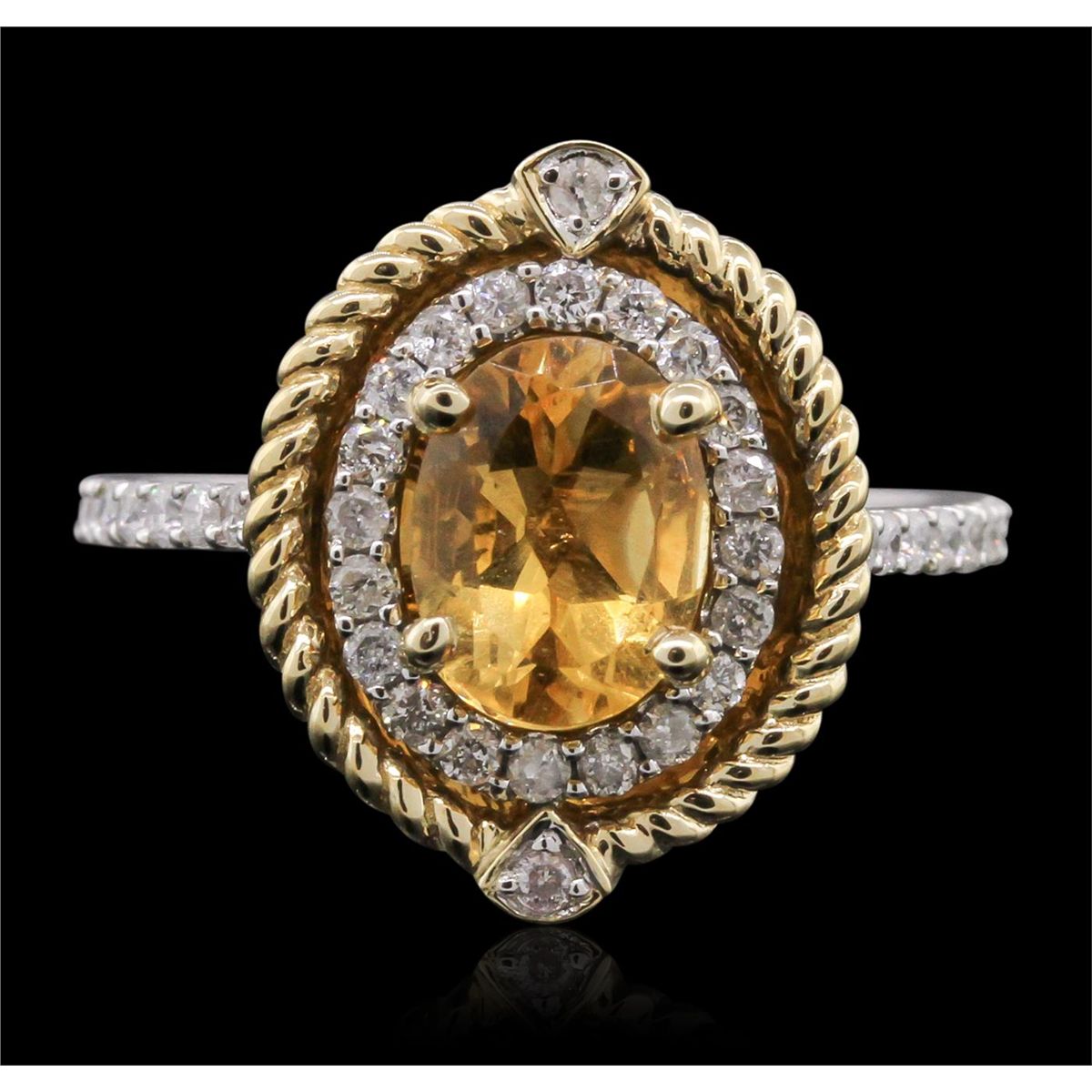 One electronically tested 14KT white and yellow gold Ladies combination cast & assembled ring with a bright polish finish. Condition is new. Identified with markings of "14K". Containing: One prong set oval modified brilliant cut natural citrine quartz, measuring 8.00 x 6.10 x 3.97mm, exact weight 1.17ct., clarity is eye clean, type I, medium light, brownish, orangy yellow color, (GIA oY 4/3), cut is very good. Colored gemstones are presumed to have been subjected to commonly used color/clarity enhancement processes. Thirty-Eight bead set single cut diamonds, measuring 1.30 - 1.30 x 0.78mm (depth est.) approximate. Total Weight of 38 Stones = 0.46ct. Clarity: I-1 to I-3. Color: I - J, Cut is Good. Total Weight of Colored Stones 1.17ct. Total Weight of Diamonds 0.46ct. Total Weight of Ring 4.30 grams. GGL Appraised at $3,040.00.