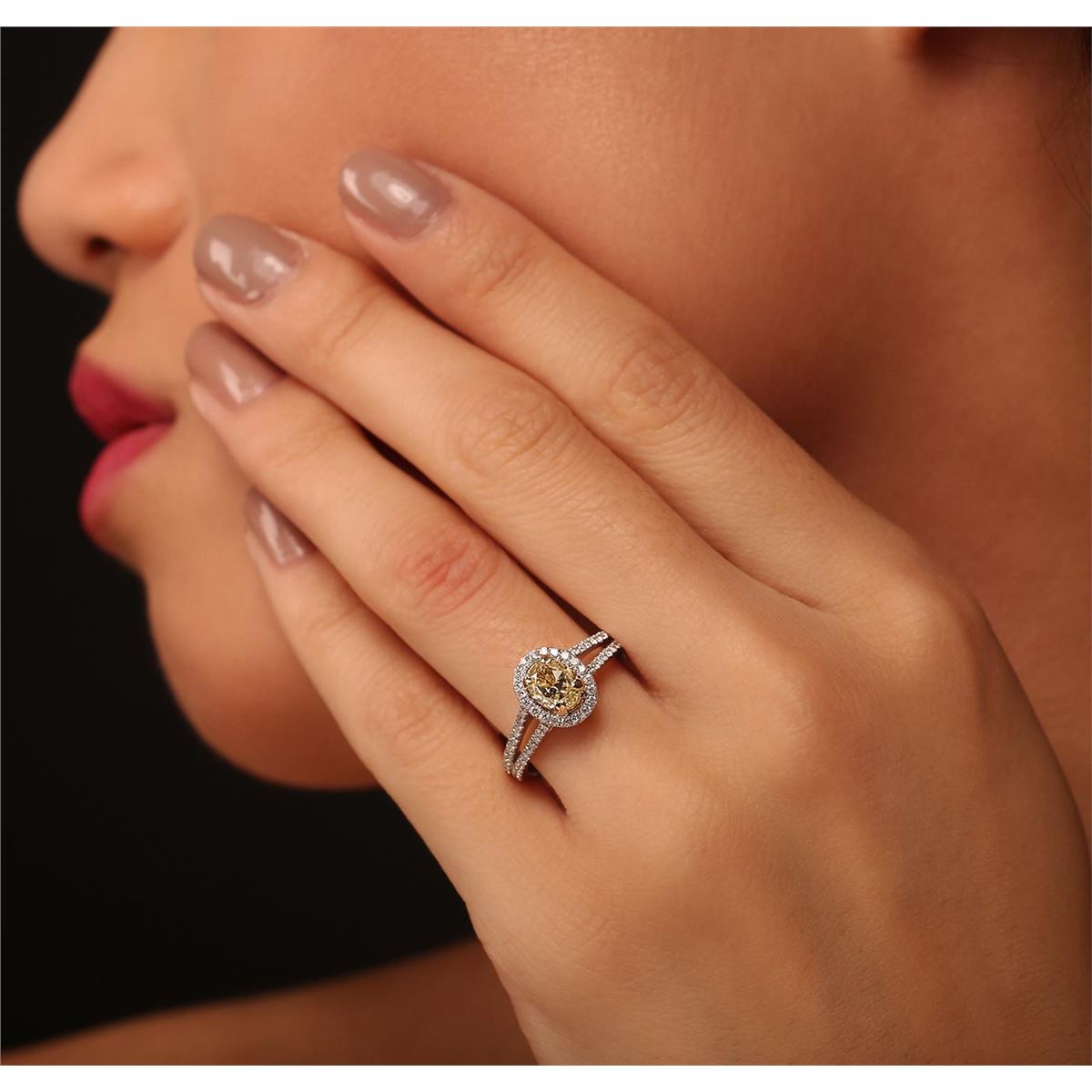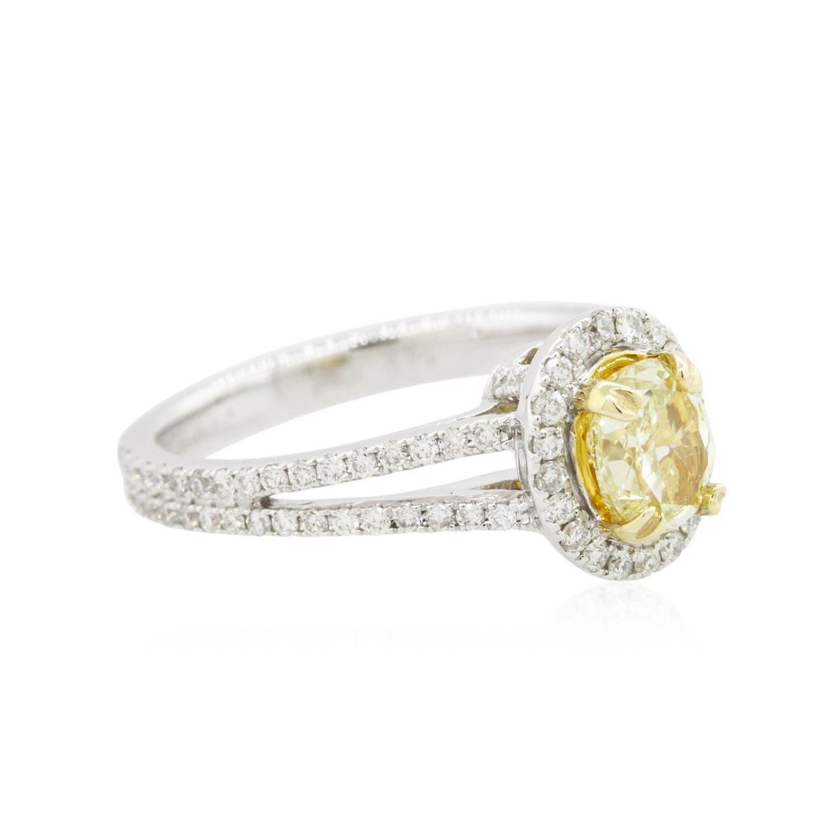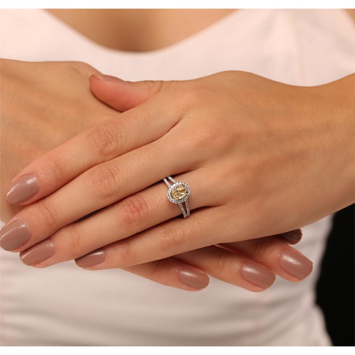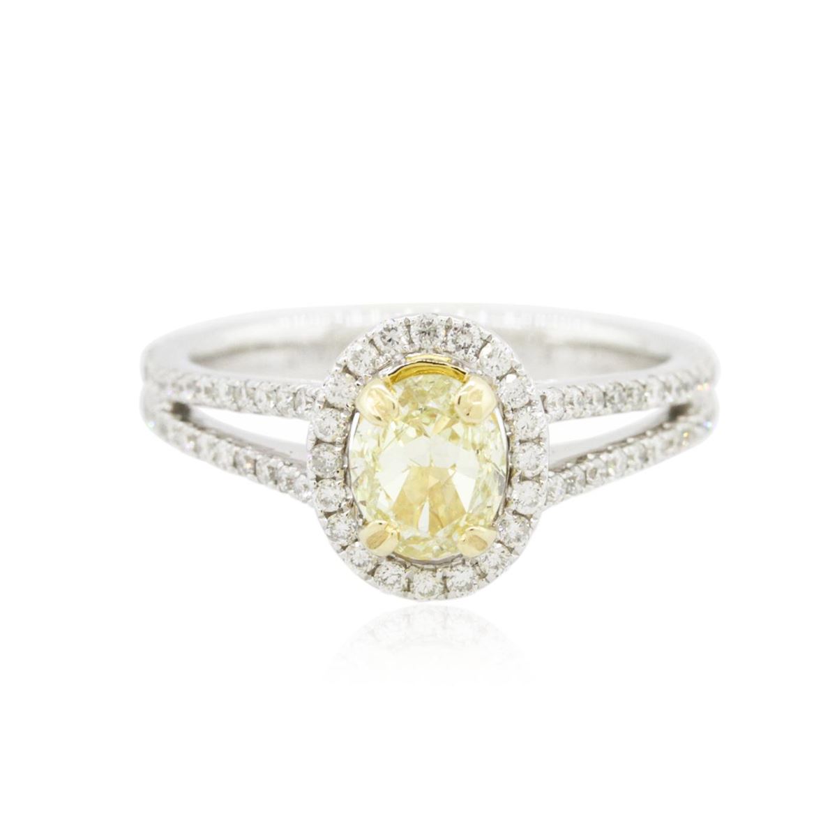 One electronically tested 14KT white and yellow gold Ladies combination cast & assembled engagement ring with a bright polish finish. Condition is new. Identified with markings of "14K". Containing: One prong set oval shaped cut diamond, measuring 5.90 x 4.90 x 4.50mm (depth est.) approximate weight of 0.81ct. Clarity: VS-2, Cut is Good. One Hundred prong set round brilliant cut diamonds, measuring 1.00 - 1.00 x 0.60mm (depth est.) approximate. Total Weight of 100 Stones = 0.36ct. Clarity: SI-2 to I-1. Color: G - H, Cut is Good. Total Weight of Diamonds 1.17ct. Total Weight of Ring 4.00 grams. GGL Appraised at $12,250.00.