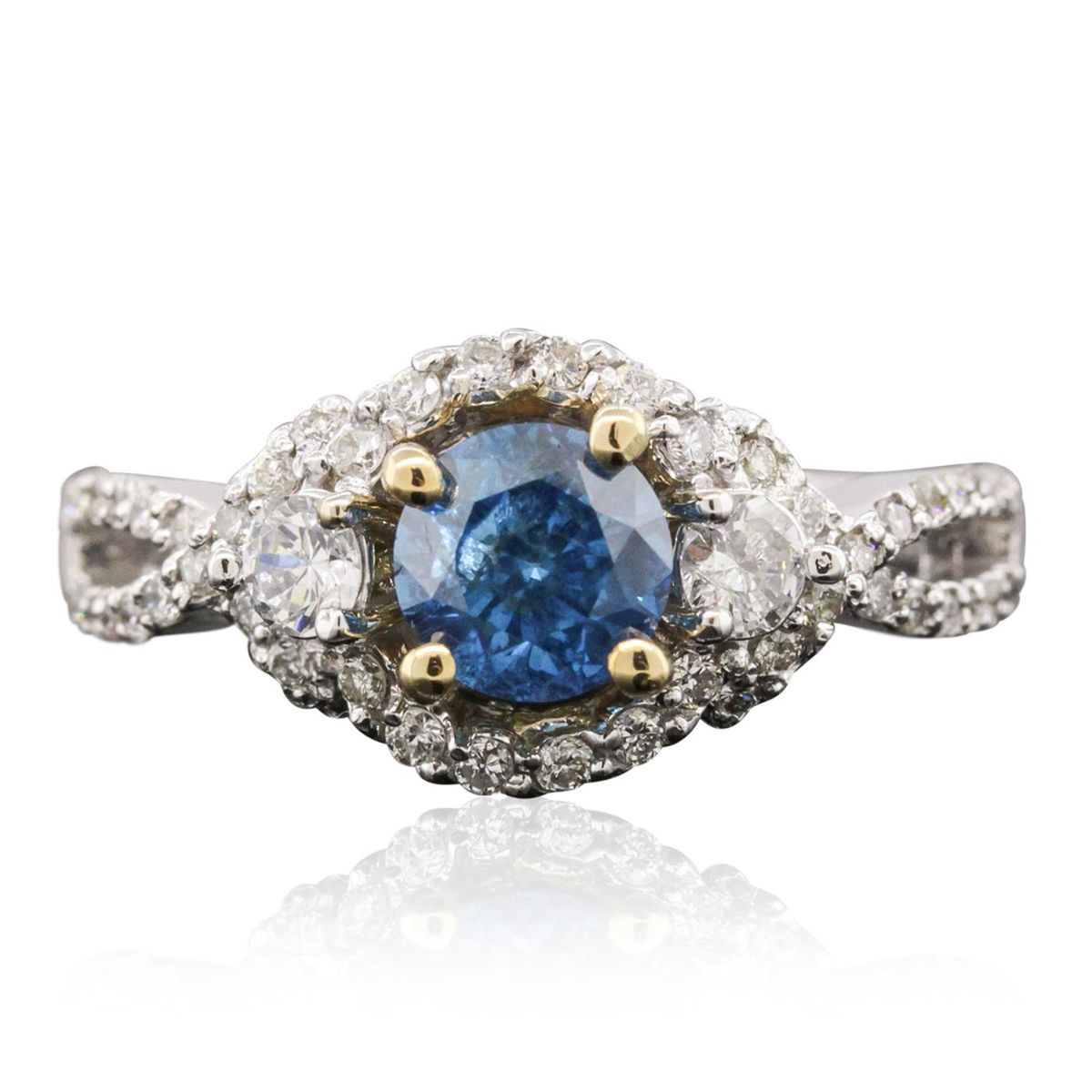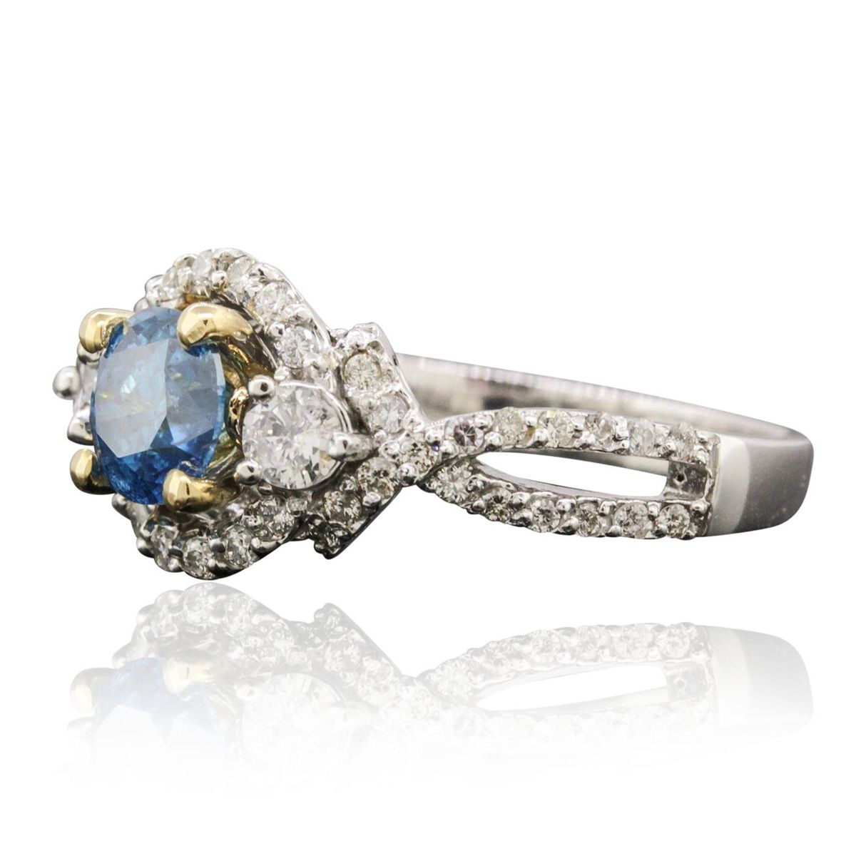 One electronically tested 14KT white and yellow gold ladies combination cast & assembled engagement ring with a bright polish finish. Condition is new. Identified with markings of "K14". Containing: One prong set round brilliant cut diamond, measuring 5.70 - 5.70 x 3.42mm (depth est.) approximate weight of 0.68ct. Clarity: I-2, Cut is Good. Color of the diamond has been enhanced. Forty-Eight prong set round brilliant cut diamonds, measuring 1.20 - 1.20 x 0.72mm (depth est.) approximate total weight of 48 Stones = 0.30ct. Clarity: I-1 to I-2. Color: I - J, Cut is Good. Two prong set round brilliant cut diamonds, measuring 3.00 - 3.00 x 1.80mm (depth est.) approximate total weight of 2 Stones = 0.20ct. Clarity: SI-1 to I-1. Color: I - J, Cut is Good. All diamonds are graded in the mounting, unless otherwise stated. Total Weight of Diamonds 1.18ct. Total Weight of Engagement Ring 4.60 grams. GGL Appraised at $5,660.00.