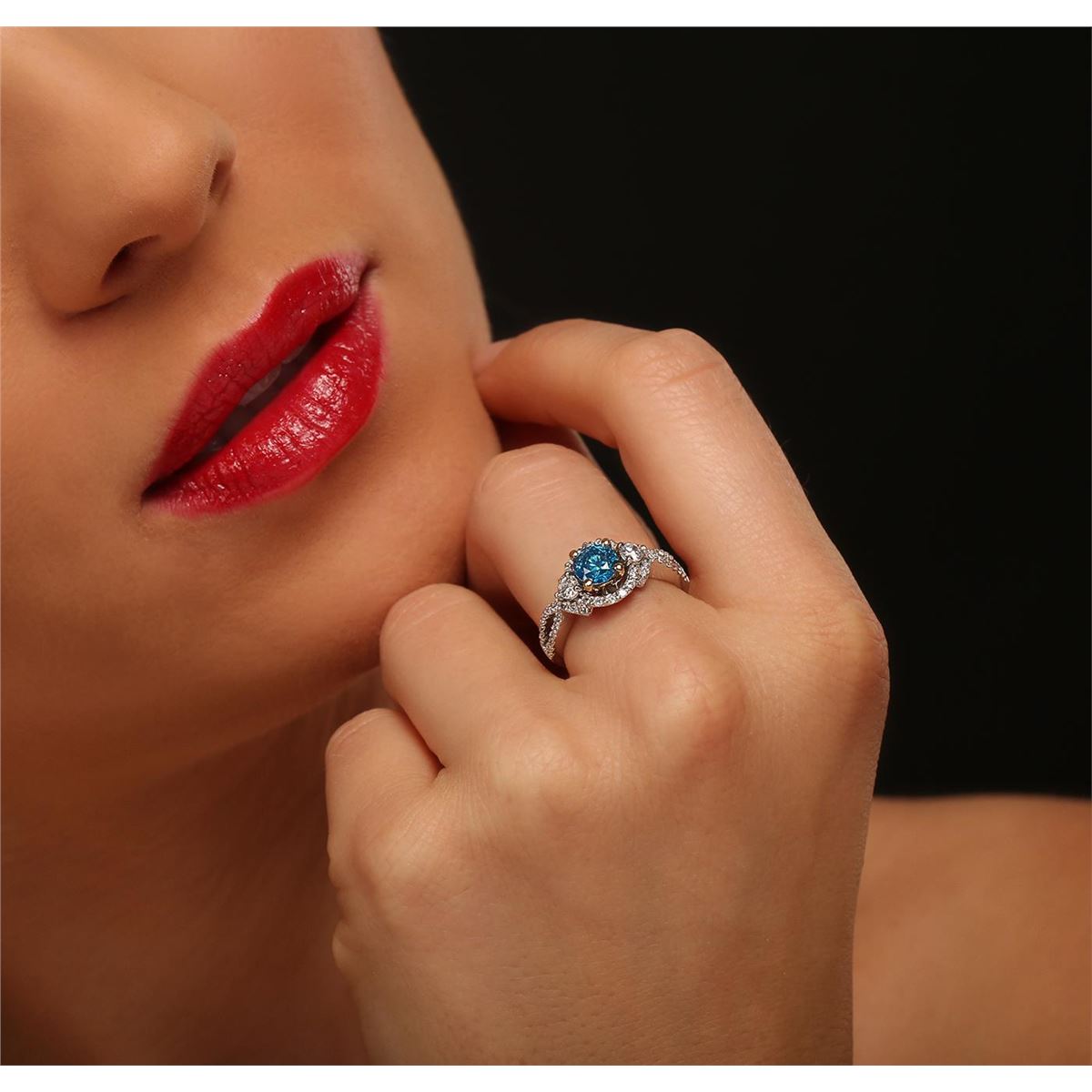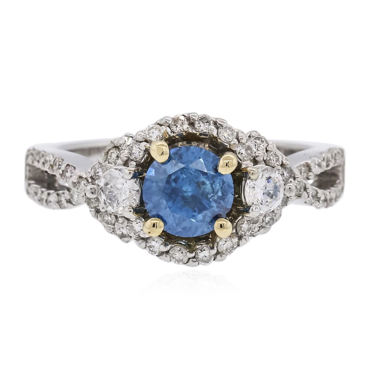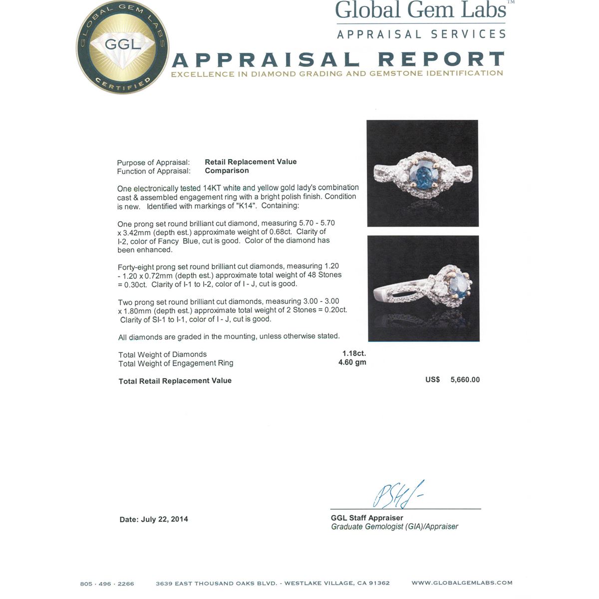 One electronically tested 14KT white and yellow gold ladies combination cast & assembled engagement ring with a bright polish finish. Condition is new. Identified with markings of "K14". Containing: One prong set round brilliant cut diamond, measuring 5.70 - 5.70 x 3.42mm (depth est.) approximate weight of 0.68ct. Clarity: I-2, Cut is Good. Color of the diamond has been enhanced. Forty-Eight prong set round brilliant cut diamonds, measuring 1.20 - 1.20 x 0.72mm (depth est.) approximate total weight of 48 Stones = 0.30ct. Clarity: I-1 to I-2. Color: I - J, Cut is Good. Two prong set round brilliant cut diamonds, measuring 3.00 - 3.00 x 1.80mm (depth est.) approximate total weight of 2 Stones = 0.20ct. Clarity: SI-1 to I-1. Color: I - J, Cut is Good. All diamonds are graded in the mounting, unless otherwise stated. Total Weight of Diamonds 1.18ct. Total Weight of Engagement Ring 4.60 grams. GGL Appraised at $5,660.00.