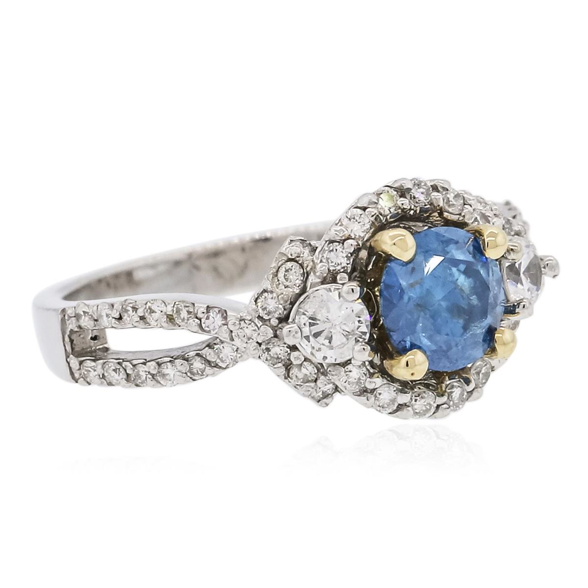 One electronically tested 14KT white and yellow gold ladies combination cast & assembled engagement ring with a bright polish finish. Condition is new. Identified with markings of "K14". Containing: One prong set round brilliant cut diamond, measuring 5.70 - 5.70 x 3.42mm (depth est.) approximate weight of 0.68ct. Clarity: I-2, Cut is Good. Color of the diamond has been enhanced. Forty-Eight prong set round brilliant cut diamonds, measuring 1.20 - 1.20 x 0.72mm (depth est.) approximate total weight of 48 Stones = 0.30ct. Clarity: I-1 to I-2. Color: I - J, Cut is Good. Two prong set round brilliant cut diamonds, measuring 3.00 - 3.00 x 1.80mm (depth est.) approximate total weight of 2 Stones = 0.20ct. Clarity: SI-1 to I-1. Color: I - J, Cut is Good. All diamonds are graded in the mounting, unless otherwise stated. Total Weight of Diamonds 1.18ct. Total Weight of Engagement Ring 4.60 grams. GGL Appraised at $5,660.00.