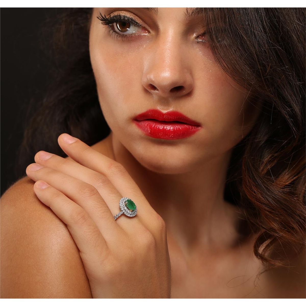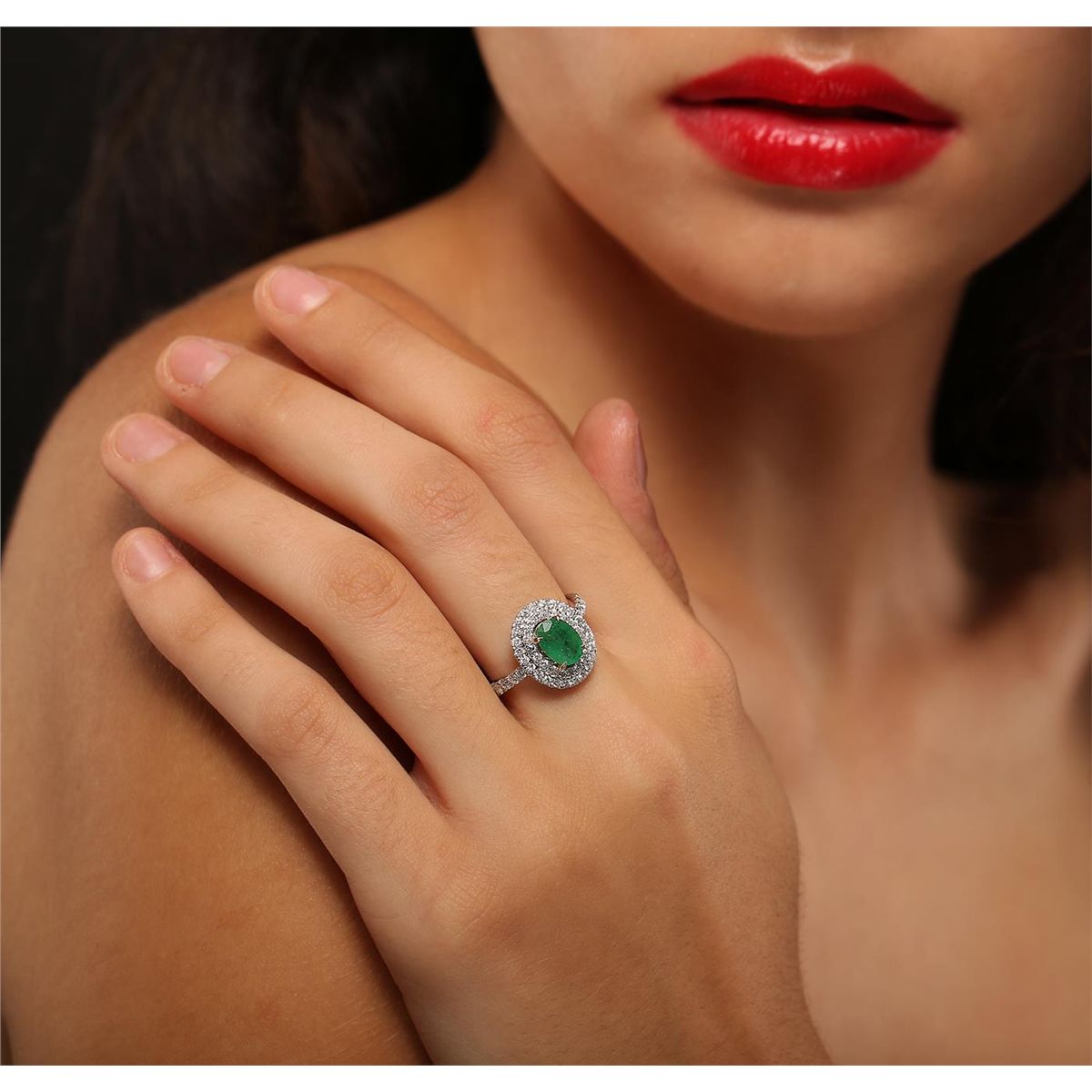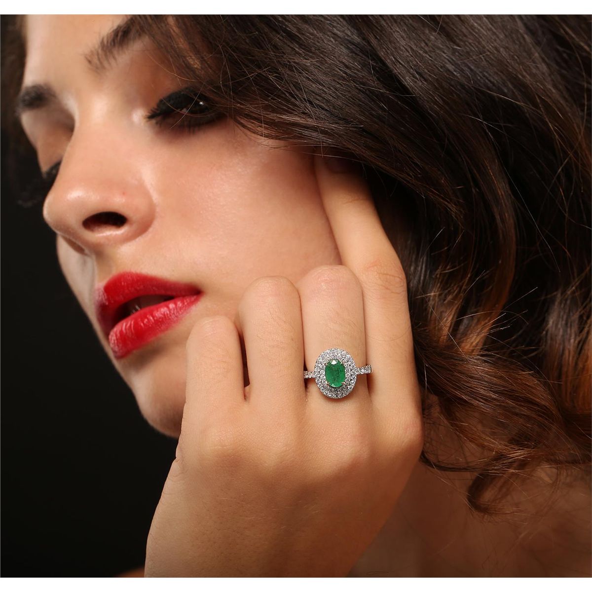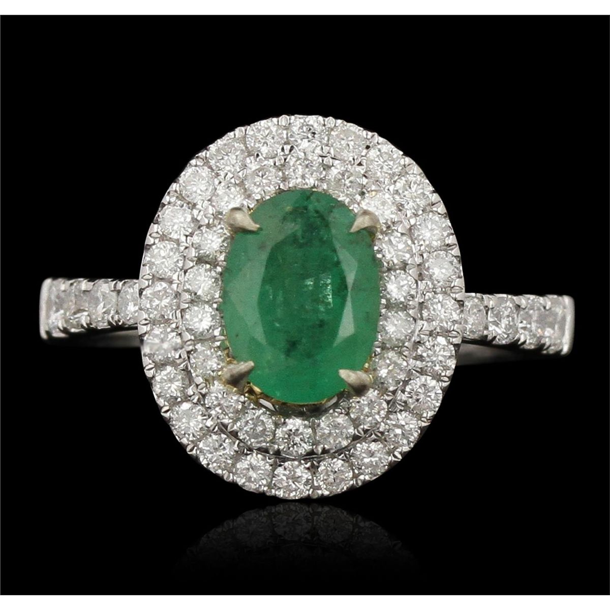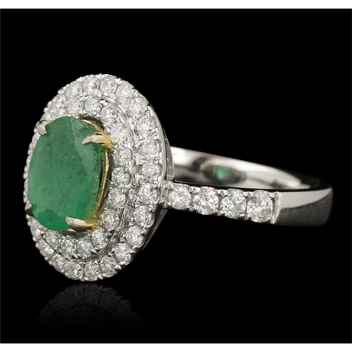 One electronically tested 14KT white and yellow gold Ladies combination cast & assembled fashion ring with a bright polish finish. Identified with markings of "14K". Condition is excellent. Containing: One prong set oval modified brilliant cut natural emerald, measuring 8.20 x 6.10 x 3.50mm, approximate weight of 1.20ct., clarity is heavily included, type III, medium, moderately strong, green color, (GIA G 5/4). Colored gemstones are presumed to have been subjected to commonly used and possible undetectable color/clarity enhancement processes. Fifty-One prong set round brilliant cut diamonds, measuring 1.90 - 1.30 x 0.96mm (depth est.) approximate total weight of 51 Stones = 0.76ct. Clarity of I-1 to I-2, Color of G - H. Total Weight of Colored Stones 1.20ct. Total Weight of Diamonds 0.76ct. Total Weight of Ring 5.20gm. GGL Appraised at $4,380.00.