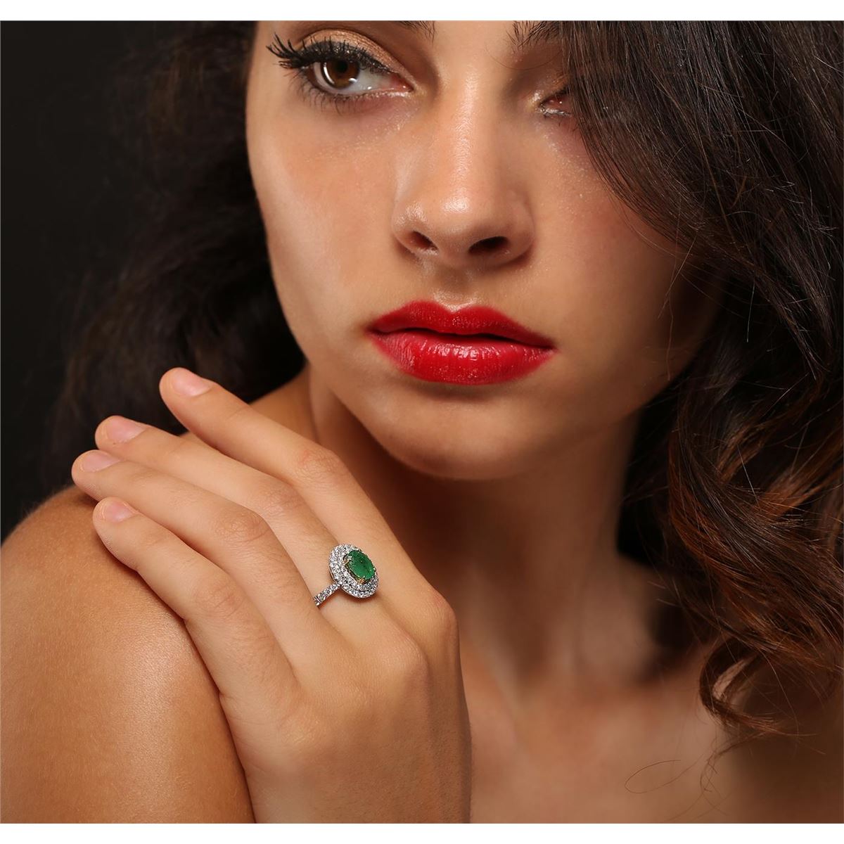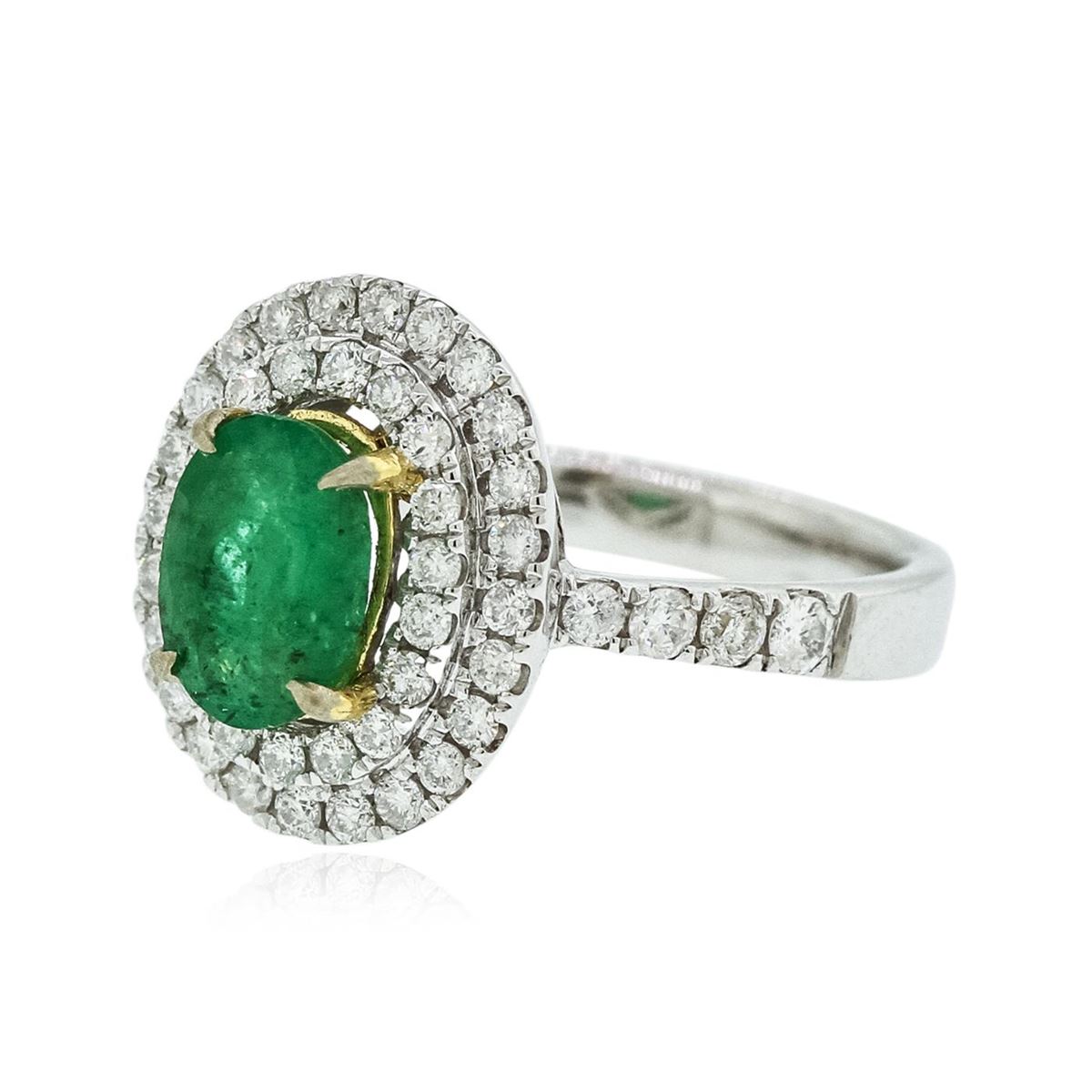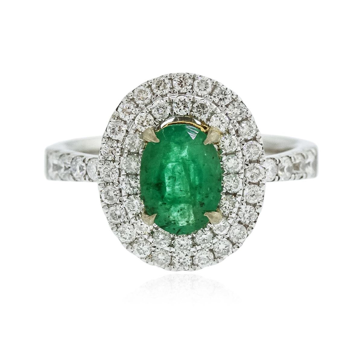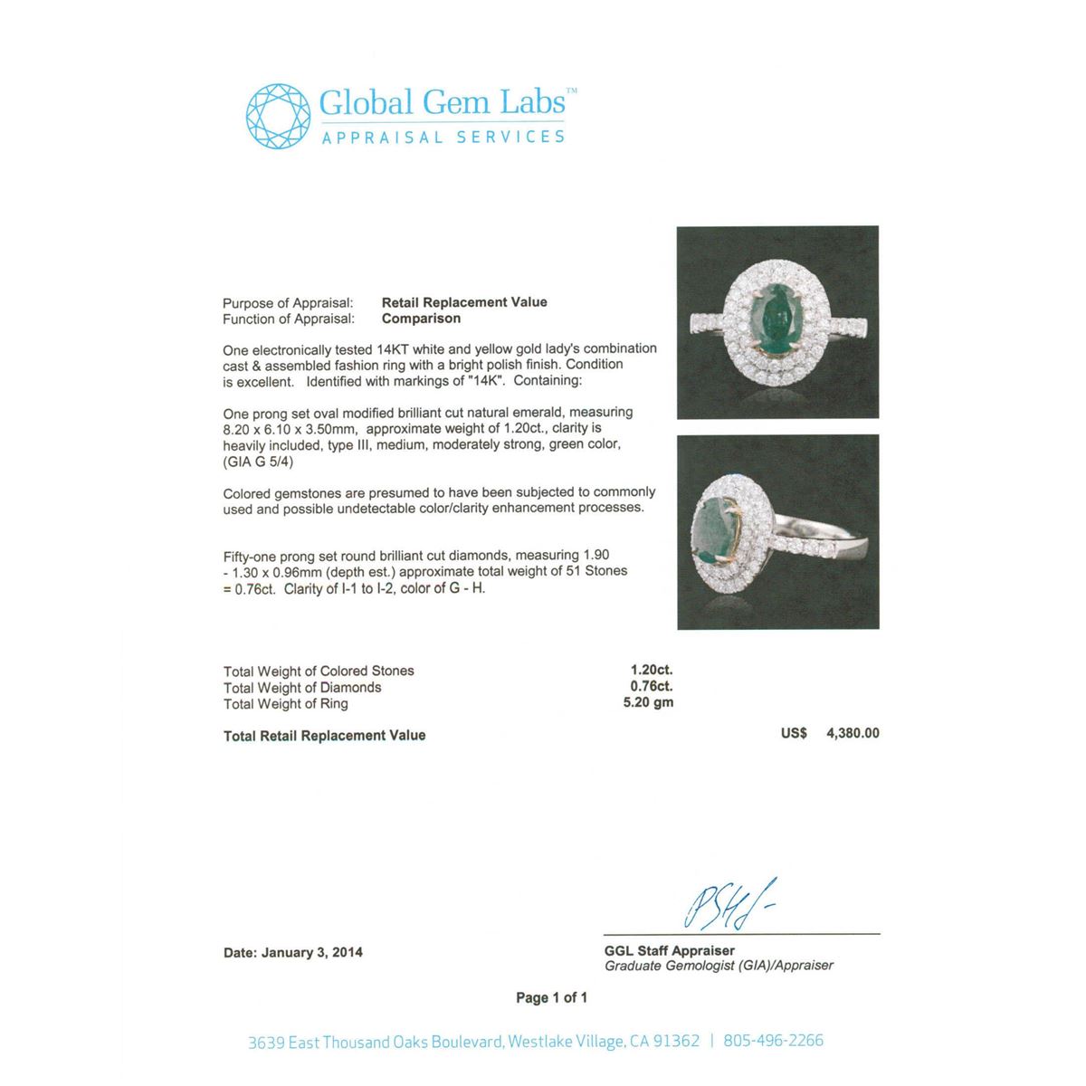One electronically tested 14KT white and yellow gold Ladies combination cast & assembled fashion ring with a bright polish finish. Identified with markings of "14K". Condition is excellent. Containing: One prong set oval modified brilliant cut natural emerald, measuring 8.20 x 6.10 x 3.50mm, approximate weight of 1.20ct., clarity is heavily included, type III, medium, moderately strong, green color, (GIA G 5/4). Colored gemstones are presumed to have been subjected to commonly used and possible undetectable color/clarity enhancement processes. Fifty-One prong set round brilliant cut diamonds, measuring 1.90 - 1.30 x 0.96mm (depth est.) approximate total weight of 51 Stones = 0.76ct. Clarity of I-1 to I-2, Color of G - H. Total Weight of Colored Stones 1.20ct. Total Weight of Diamonds 0.76ct. Total Weight of Ring 5.20gm. GGL Appraised at $4,380.00.