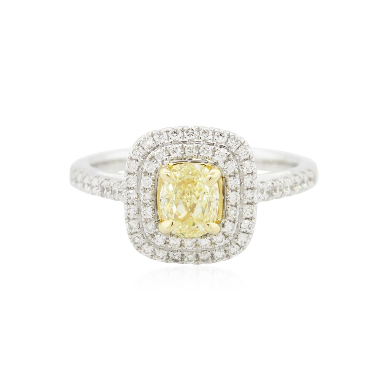One electronically tested 14KT white and yellow gold Ladies combination cast & assembled engagement ring with a bright polish finish. Condition is new. Identified with markings of "14K". Containing: One prong set oval shaped cut diamond, measuring 5.80 x 4.50 x 4.22mm (depth est.) approximate weight of 0.69ct. Clarity: VS-2, Cut is Good. Fifty-Nine prong set round brilliant cut diamonds, measuring 1.50 - 1.30 x 0.84mm (depth est.) approximate. Total Weight of 59 Stones = 0.59ct. Clarity: SI-2 to I-1. Color: G - H, Cut is Good. Total Weight of Diamonds 1.28ct. Total Weight of Ring 3.90 grams. GGL Appraised at $11,485.00.