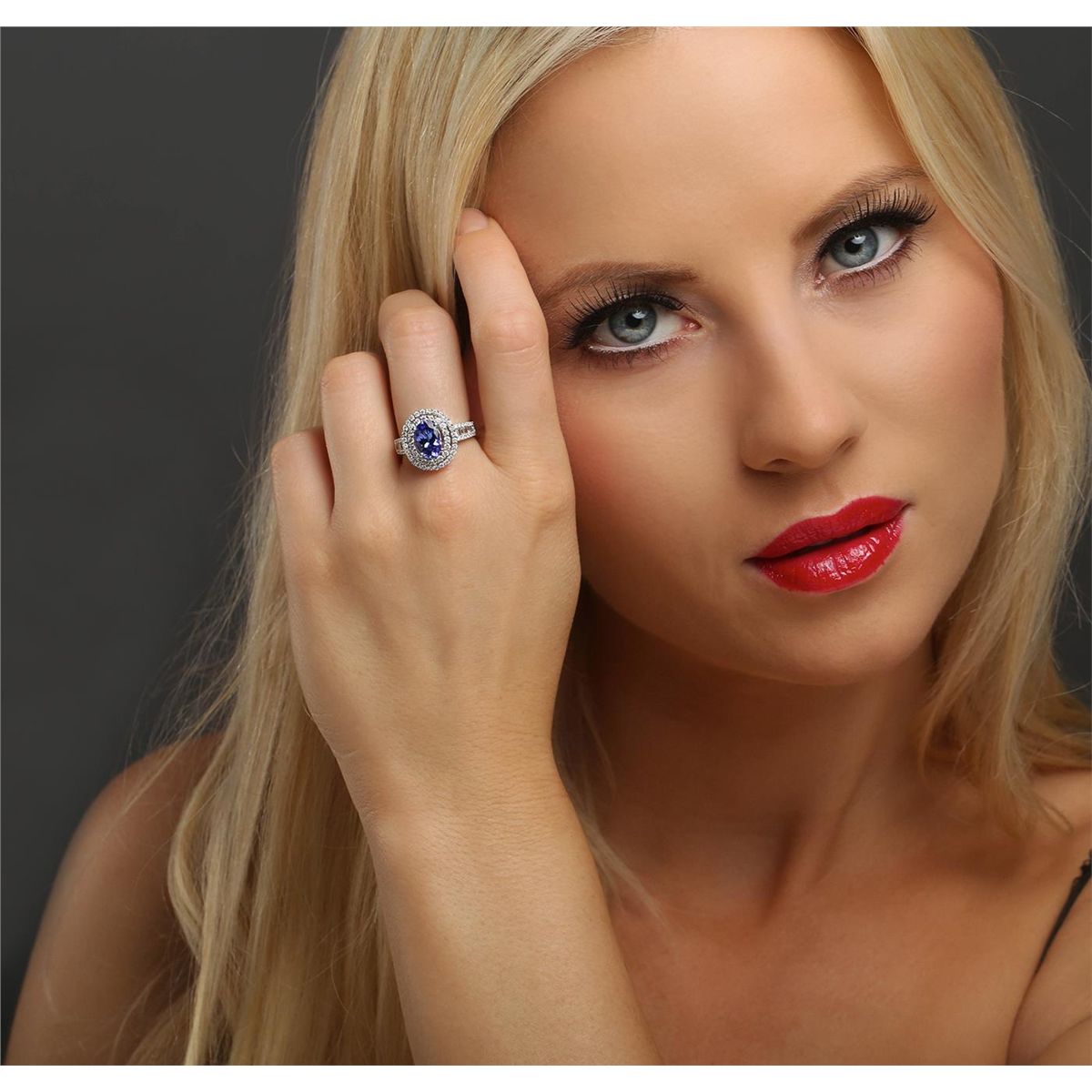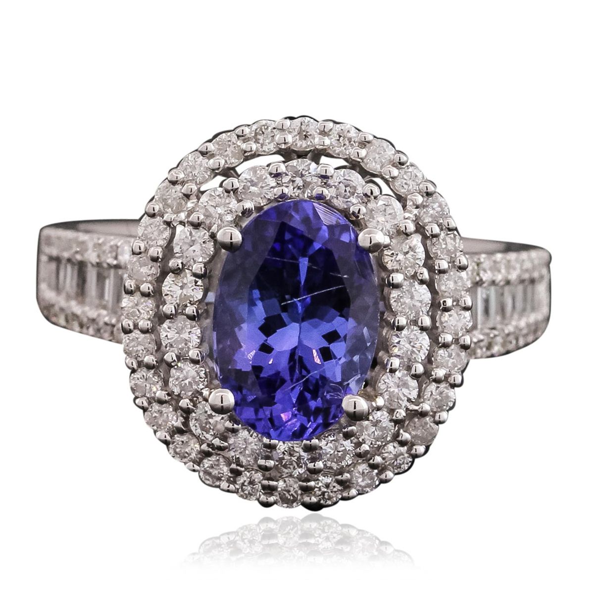 One electronically tested 14KT white and yellow gold ladies combination cast & assembled tanzanite and diamond ring with a flat shank with a bright polish finish. Identified with markings of "14K". Condition is new. Containing: One prong set oval modified brilliant cut natural tanzanite, measuring 9.49 x 6.55 x 2.97mm, approximate weight of 1.28ct., clarity is eye clean, type I, medium, moderately strong, bluish violet color, (GIA bV 5/4), cut is good. Seventy-Five prong set round brilliant cut diamonds, measuring 1.40 - 1.10 x 0.75mm (depth est.) stated total weight of 75 Stones = 0.53ct. Clarity: SI-2 to I-2. Color: H - I, Cut is Good. Fourteen channel set baguette cut diamonds, measuring from 1.20 x 1.20 x 1.03mm (depth est.) to 1.90 x 1.50 x 1.28mm (depth est.) approximate total weight of 14 Stones = 0.31ct. Clarity: SI-1 to SI-2. Color: H - I, Cut is Good. Colored gemstones are presumed to have been subjected to commonly used enhancement processes. All diamonds and colored gemstones are graded in the mounting, unless otherwise stated total weight of Colored Stones 1.28ct. Total Weight of Diamonds 0.84ct. Total Weight of Ring 5.70 grams. GGL Appraised at $6,135.00.