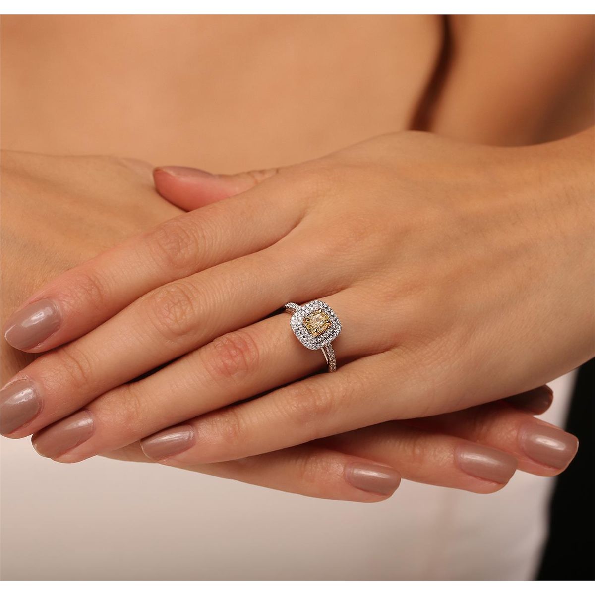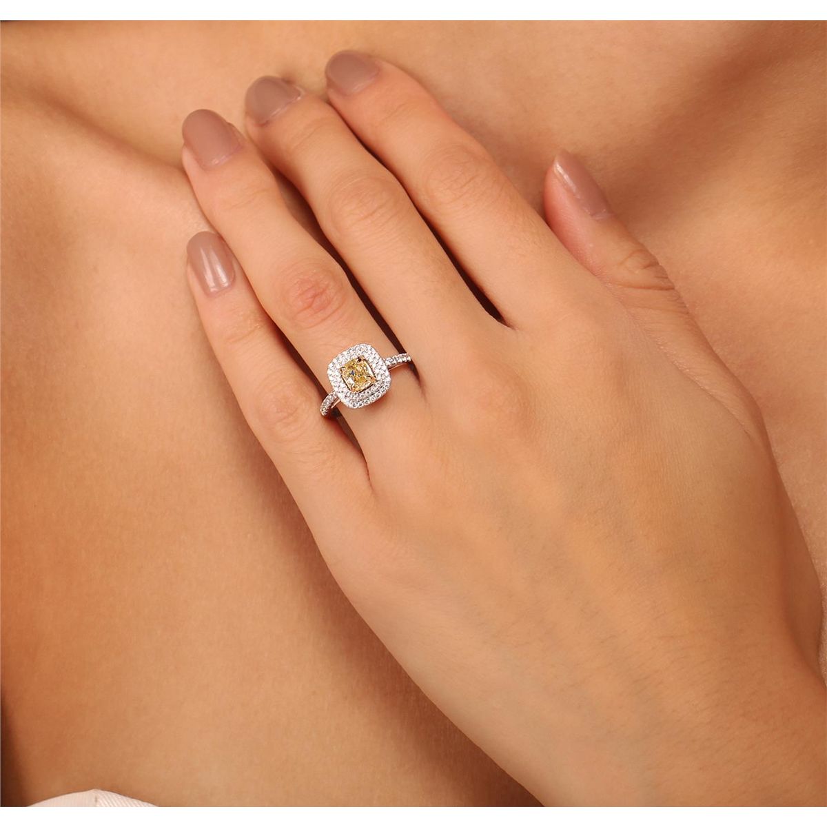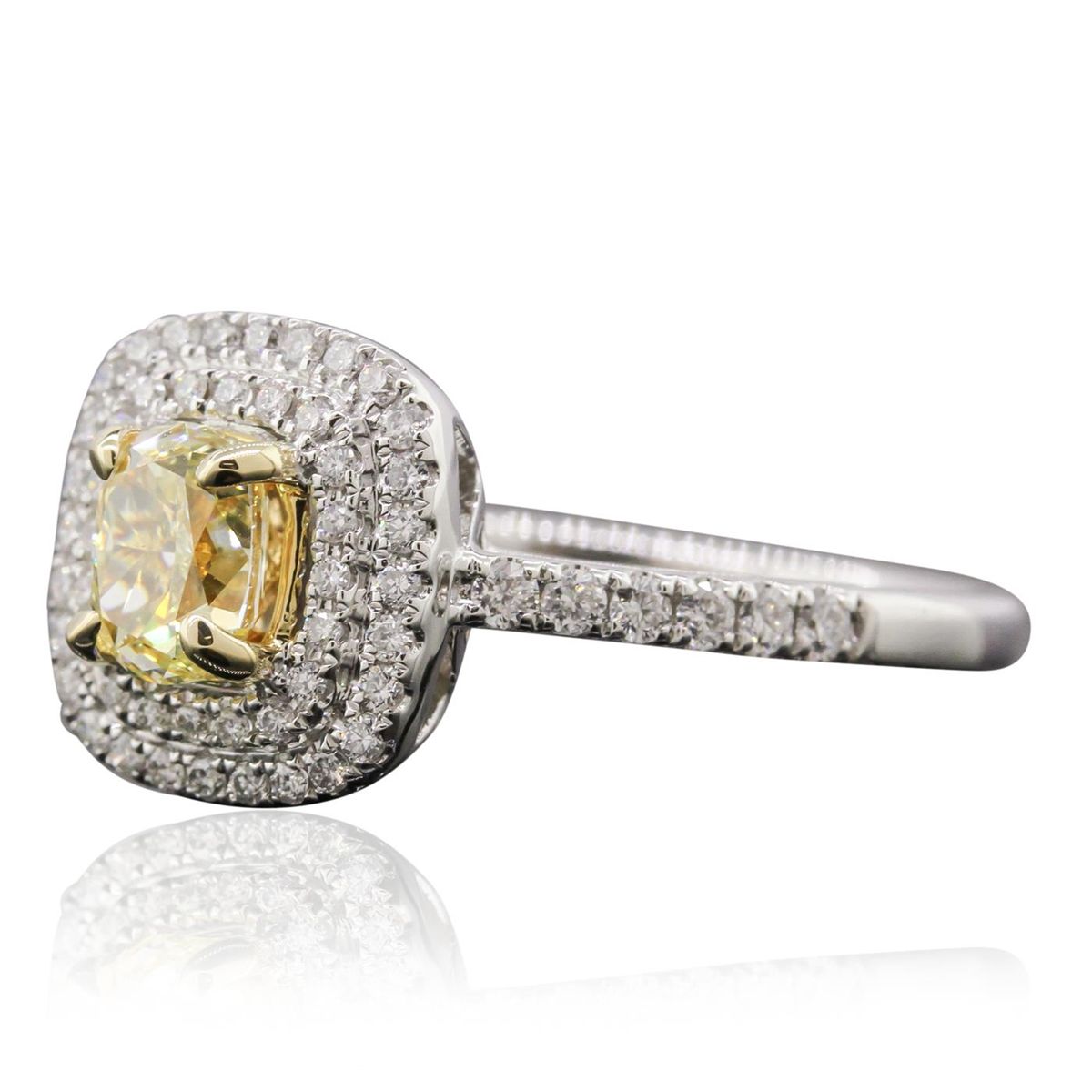 One electronically tested 14KT white and yellow gold Ladies combination cast & assembled engagement ring with a bright polish finish. Condition is new. Identified with markings of "14K". Containing: One prong set oval shaped cut diamond, measuring 5.80 x 4.50 x 4.22mm (depth est.) approximate weight of 0.69ct. Clarity: VS-2, Cut is Good. Fifty-Nine prong set round brilliant cut diamonds, measuring 1.50 - 1.30 x 0.84mm (depth est.) approximate. Total Weight of 59 Stones = 0.59ct. Clarity: SI-2 to I-1. Color: G - H, Cut is Good. Total Weight of Diamonds 1.28ct. Total Weight of Ring 3.90 grams. GGL Appraised at $11,485.00.