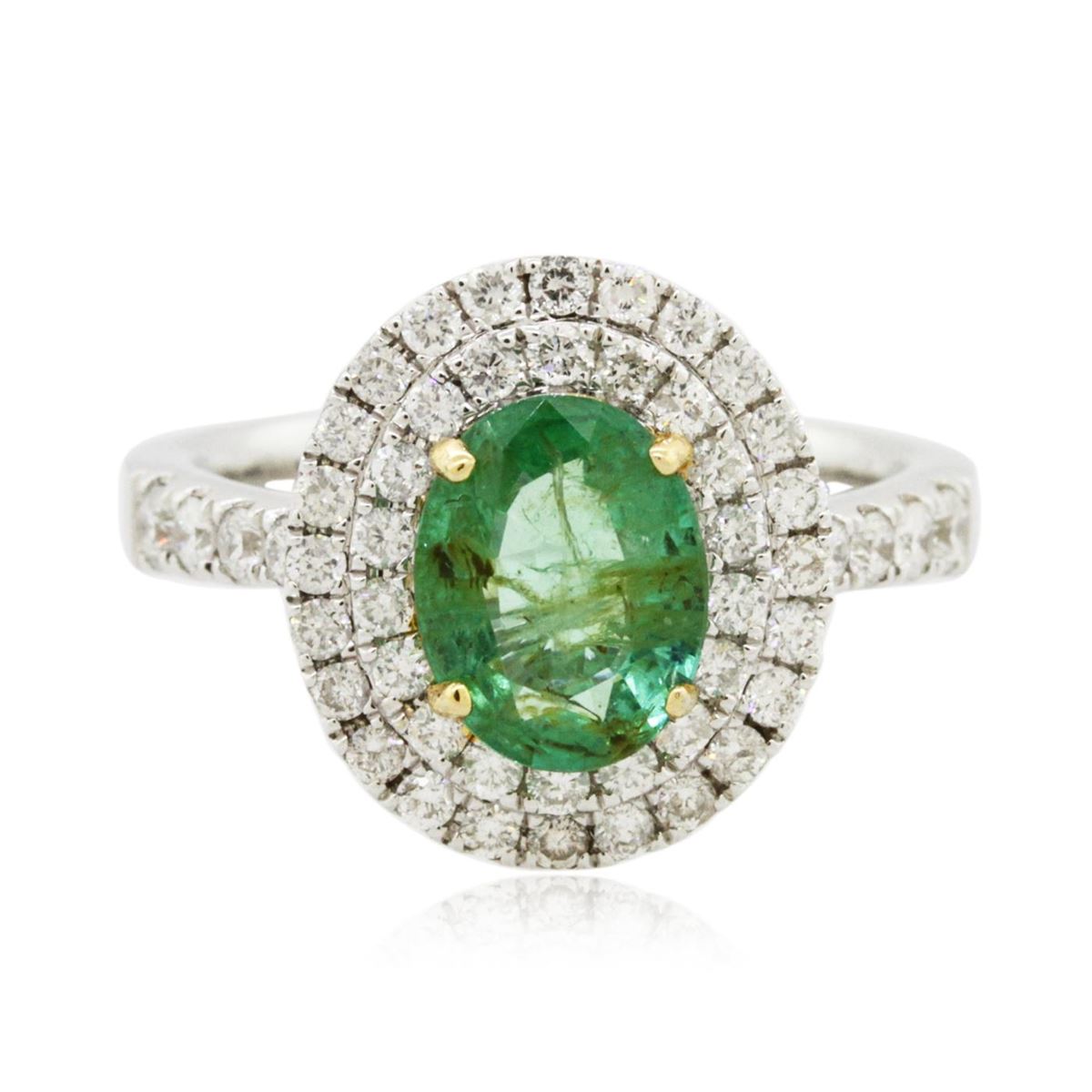 One electronically tested 14KT white and yellow gold Ladies combination cast & assembled ring with a bright polish finish. Condition is new. Identified with markings of "14K". Containing: One prong set oval modified brilliant cut natural emerald, measuring 9.00. x 7.00. x 3.70mm, approximate weight of 1.29ct., clarity is moderately included, type III, medium light, very slightly grayish, green color, (GIA G 4/3), cut is good. Colored gemstones are presumed to have been subjected to commonly used color/clarity enhancement processes. Fifty prong set round brilliant cut diamonds, measuring 2.00. - 1.50 x 1.05mm (depth est.) approximate. Total Weight of 50 Stones = 0.60ct. . Clarity: I-1 to I-2. Color: I - J, Cut is Good. . Total Weight of Colored Stones 1.29ct. Total Weight of Diamonds 0.60ct. Total Weight of Ring 5.30 grams. GGL Appraised at $5,225.00.