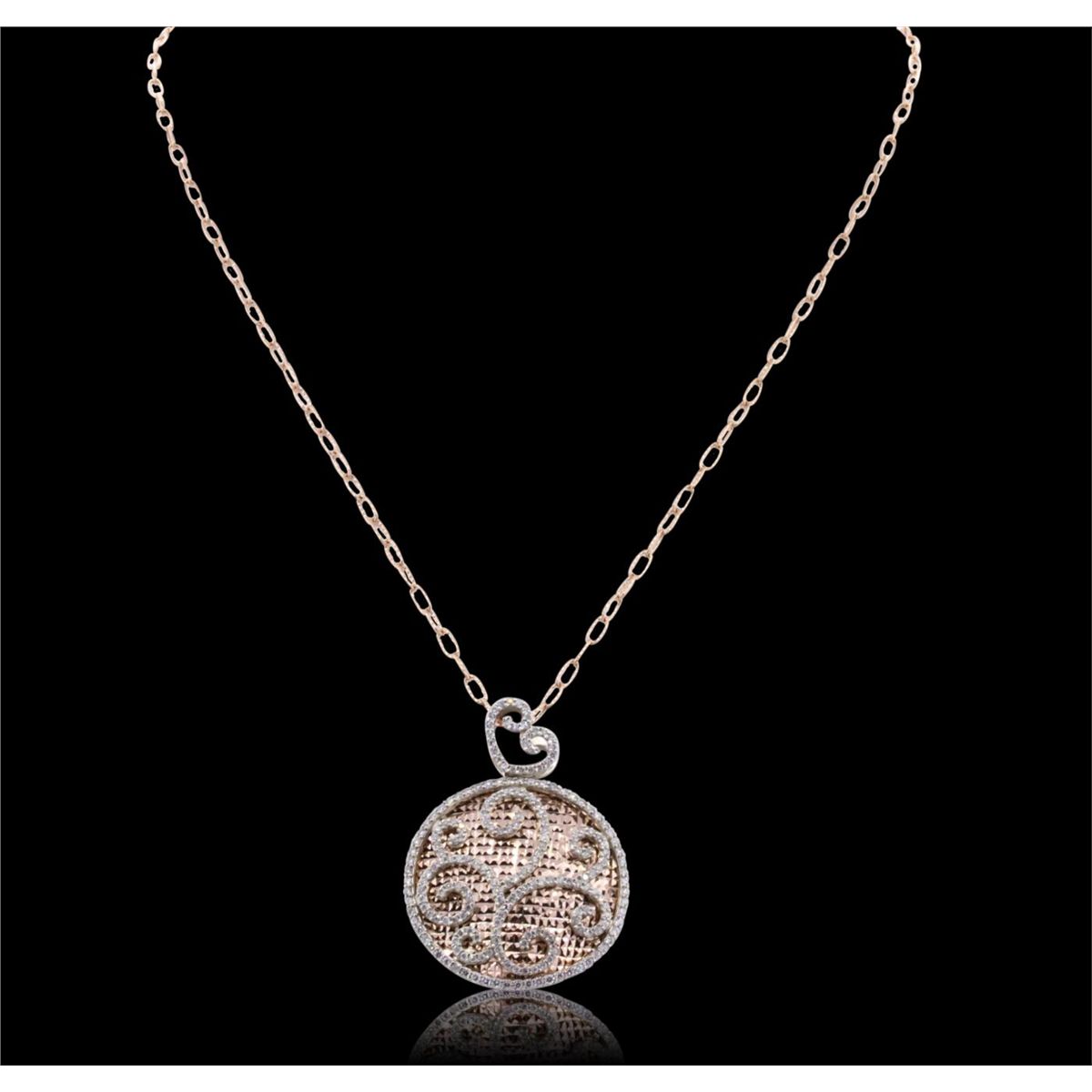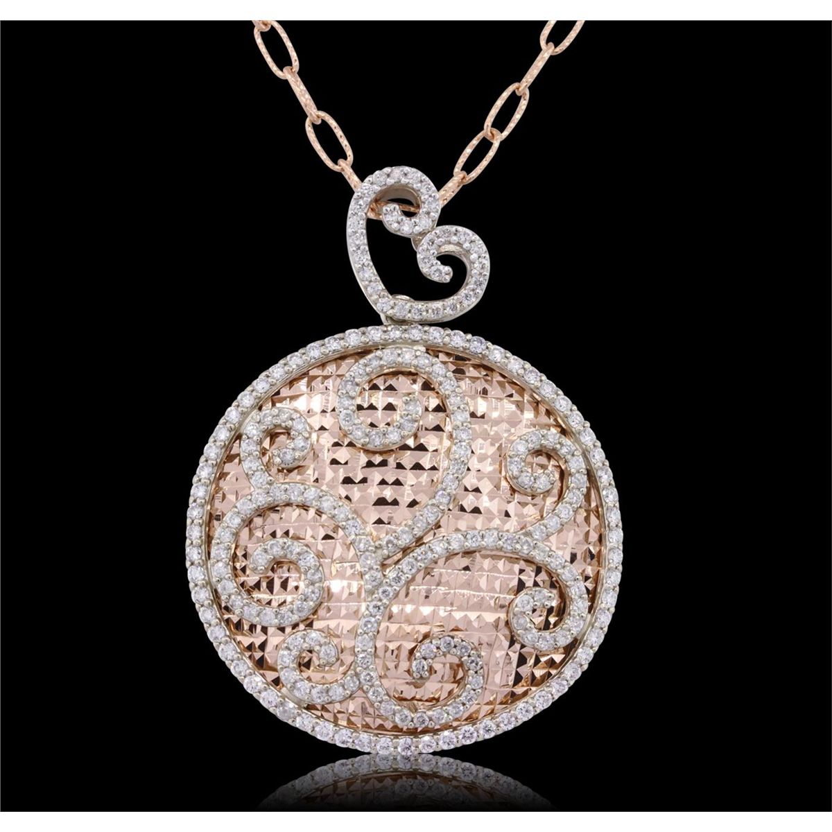 One electronically tested 14KT white and rose gold ladies cast & assembled diamond pendant with chain. The pendant features swirling white gold diamond ribbons and diamond bezel set within a rose gold background with diamond cut accents, completed by a white gold diamond set bail. The pendant is supported by an eighteen inch length 14KT rose gold link chain with milgrain detailing, terminating in a lobster claw clasp. Bright polish finish. Identified with markings of "K14". Condition is new, good workmanship. Containing: Two Hundred Seventeen prong set round brilliant cut diamonds, measuring 1.20 - 1.10 x 0.69mm (depth est.) approximate total weight of 217 Stones = 1.30ct. Graded in the setting. Clarity: SI-2 to I-1. Color: G - I. Total Weight of Diamonds 1.30ct. Total Weight of Pendant With Chain 19.22 grams. AIG Appraised at $8,375.00.