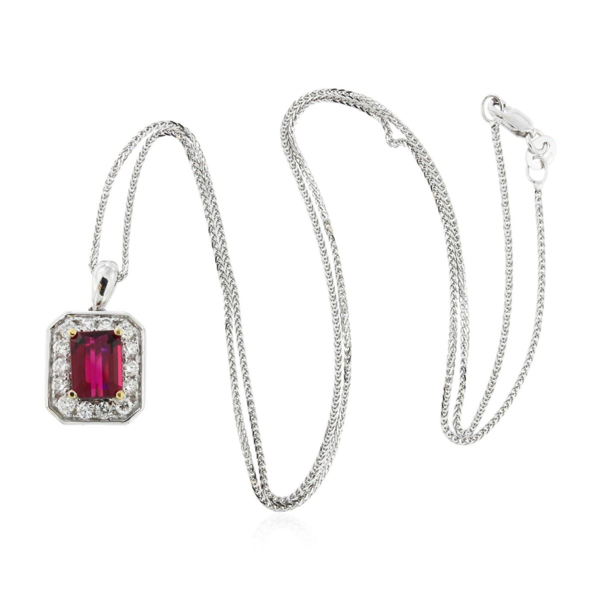 One electronically tested 14KT white and yellow gold Ladies combination cast & assembled pendant with a bright polish finish. Condition is new. Identified with markings of "14K". Containing: One prong set emerald modified step cut natural pink tourmaline, measuring 8.00 x 5.60 x 3.55mm, exact weight 1.53ct., clarity is eye clean, type II, medium, moderately strong, reddish purple color, (GIA rP 5/4), cut is very good. Colored gemstones are presumed to have been subjected to commonly used color/clarity enhancement processes. Fourteen prong set round brilliant cut diamonds, measuring 2.00 - 2.00 x 2.00mm (depth est.) approximate. Total Weight of 14 Stones = 0.64ct. Clarity: I-1 to I-2. Color: I - J, Cut is Good. One Hundred Sixty-Two bead set round brilliant cut diamonds, measuring 1.30 - 1.30 x 0.78mm (depth est.) approximate. Total Weight of 162 Stones = 1.76ct. Clarity: I-1 to I-2. Color: I - J, Cut is Good. Total Weight of Colored Stones 1.53ct. Total Weight of Diamonds 2.40ct. Total Weight of Pendant 4.90 grams. GGL Appraised at $7,805.00.