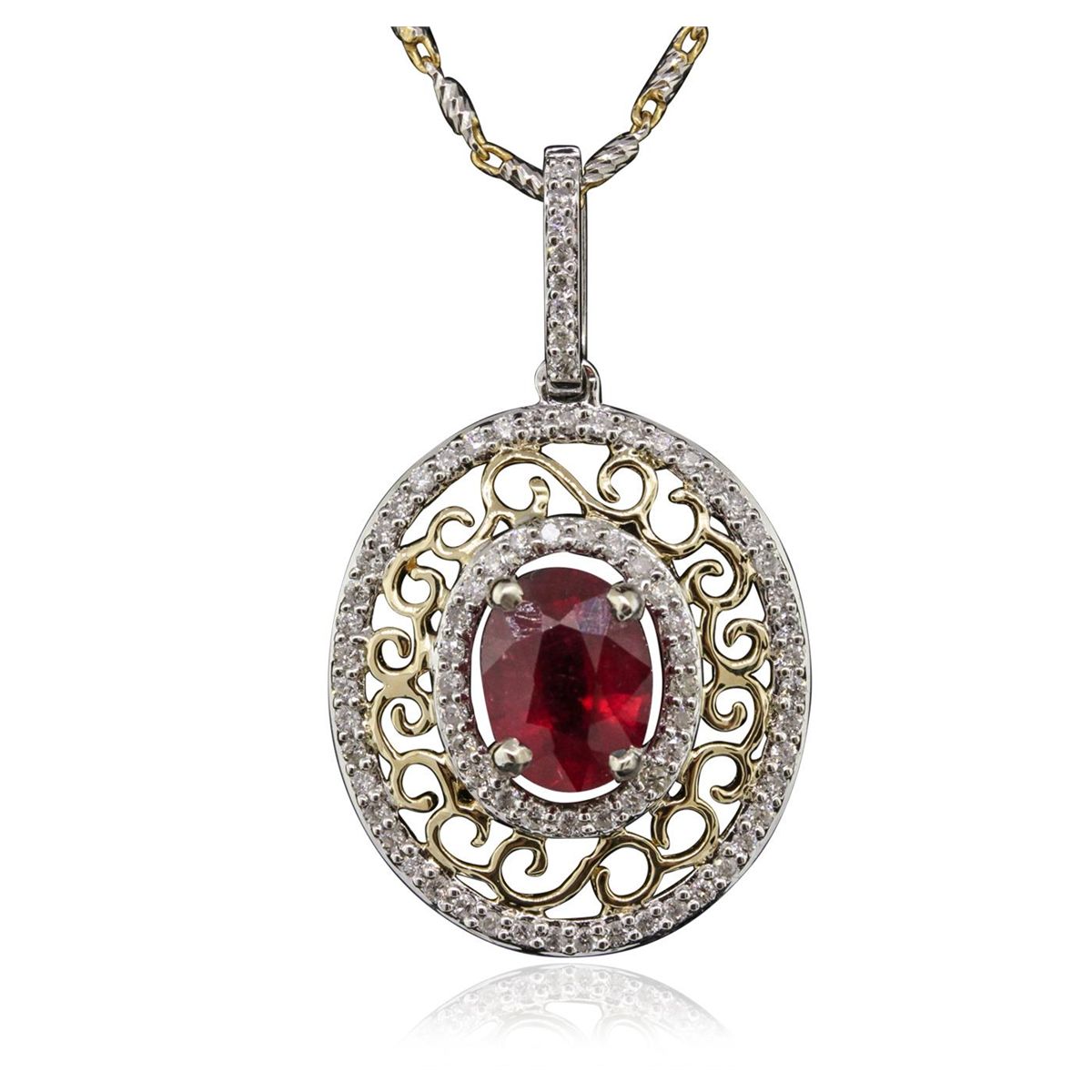 One electronically tested 14KT white and yellow gold ladies combination cast & assembled pendant & chain 17.0" long, medium fancy link with a lobster claw clasp with a bright polish finish. Condition is new. Identified with markings of "14K". Containing: One prong set oval modified brilliant cut natural ruby, measuring 7.91 x 6.00 x 3.90mm, approximate weight of 1.53ct., clarity is heavily included, type II, medium, moderately strong, strongly purplish red color, (GIA stpR 5/4), cut is good. Eighty prong set round brilliant cut diamonds, measuring 1.10 - 1.10 x 0.66mm (depth est.) approximate total weight of 80 Stones = 0.38ct. Clarity: I-1 to I-2. Color: I - J, Cut is Good. Colored gemstones are presumed to have been subjected to commonly used enhancement processes. All diamonds and colored gemstones are graded in the mounting, unless otherwise stated. Total Weight of Colored Stones 1.53ct. Total Weight of Diamonds 0.38ct. Total Weight of Pendant & Chain 6.20 grams. GGL Appraised at $3,525.00.
