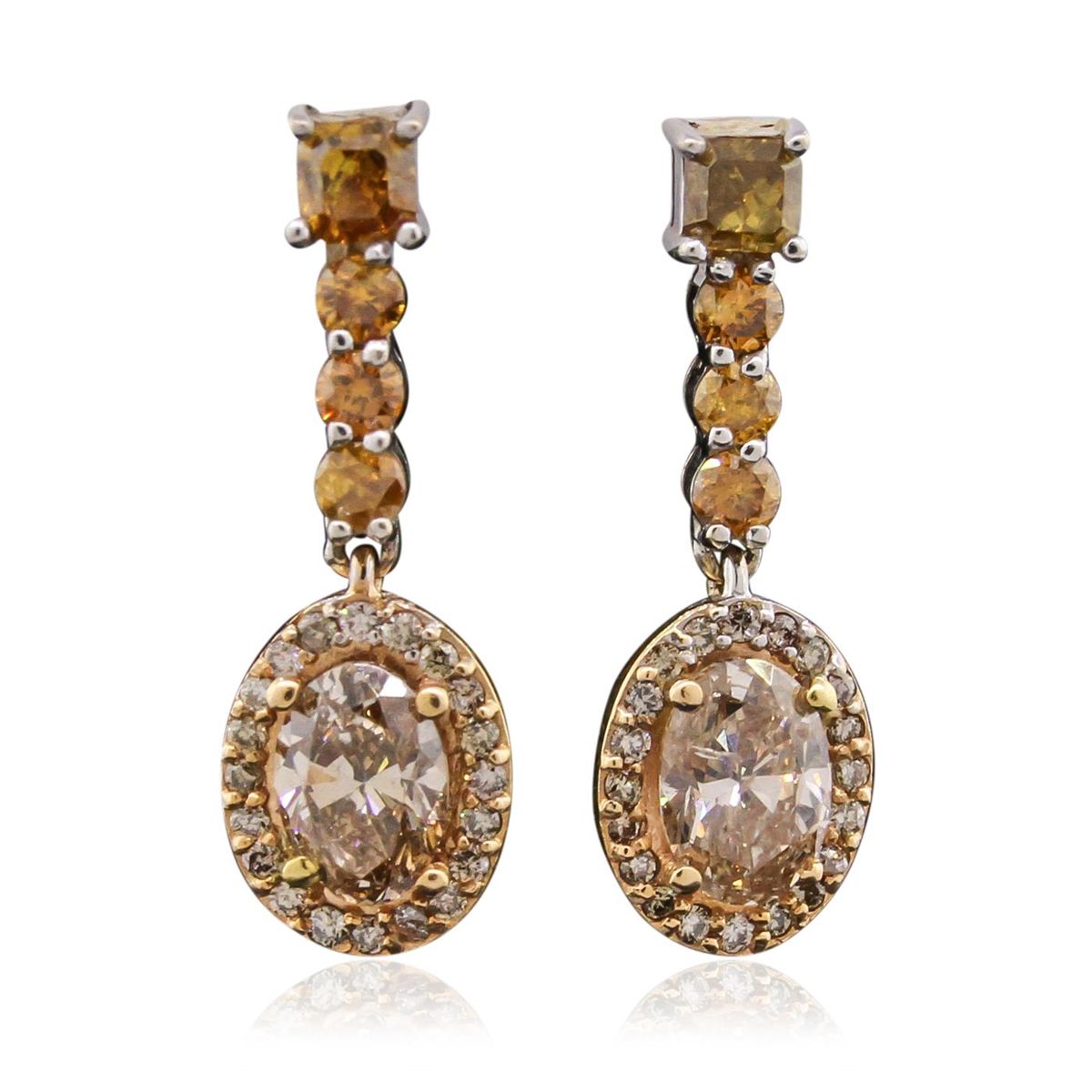 One pair electronically tested 14KT white and yellow gold Ladies combination cast & assembled dangle earrings with friction posts with a bright polish finish. Condition is new. Identified with markings of "585". Containing: Two prong set oval shaped cut diamonds, measuring 6.10 x 4.70 x 3.20mm (depth est.) approximate. Total Weight of 2 Stones = 1.16ct. Clarity: SI-2, Cut is Good. Thirty-Eight prong set round brilliant cut diamonds, measuring 1.00 - 1.00 x 0.60mm (depth est.) approximate. Total Weight of 38 Stones = 0.14ct. Clarity: I-1 to I-2. Color: L - M, Cut is Good. Six prong set round brilliant cut diamonds, measuring 2.40 - 2.40 x 0.00mm (depth est.) approximate. Total Weight of 6 Stones = 0.00ct. Clarity: I-1 to I-2, Cut is Good. Color has been treated. Two prong set square cut diamonds, measuring 3.00 x 3.00 x 1.86mm (depth est.) approximate. Total Weight of 2 Stones = 0.27ct. Clarity: I-1, Cut is Good. Color has been treated. Total Weight of Diamonds 1.56ct. Total Weight of Earrings 4.70 grams. GGL Appraised at $8,900.00.