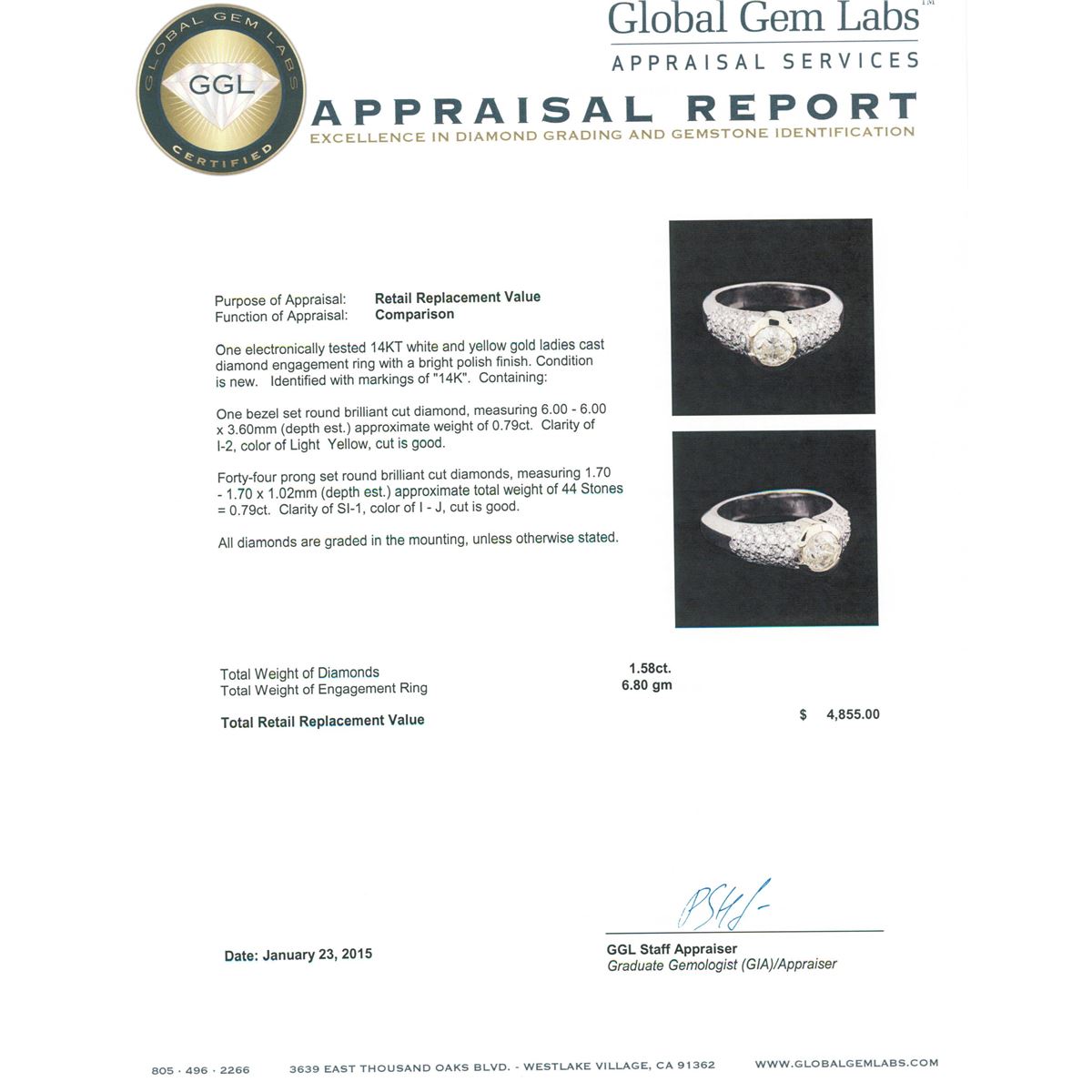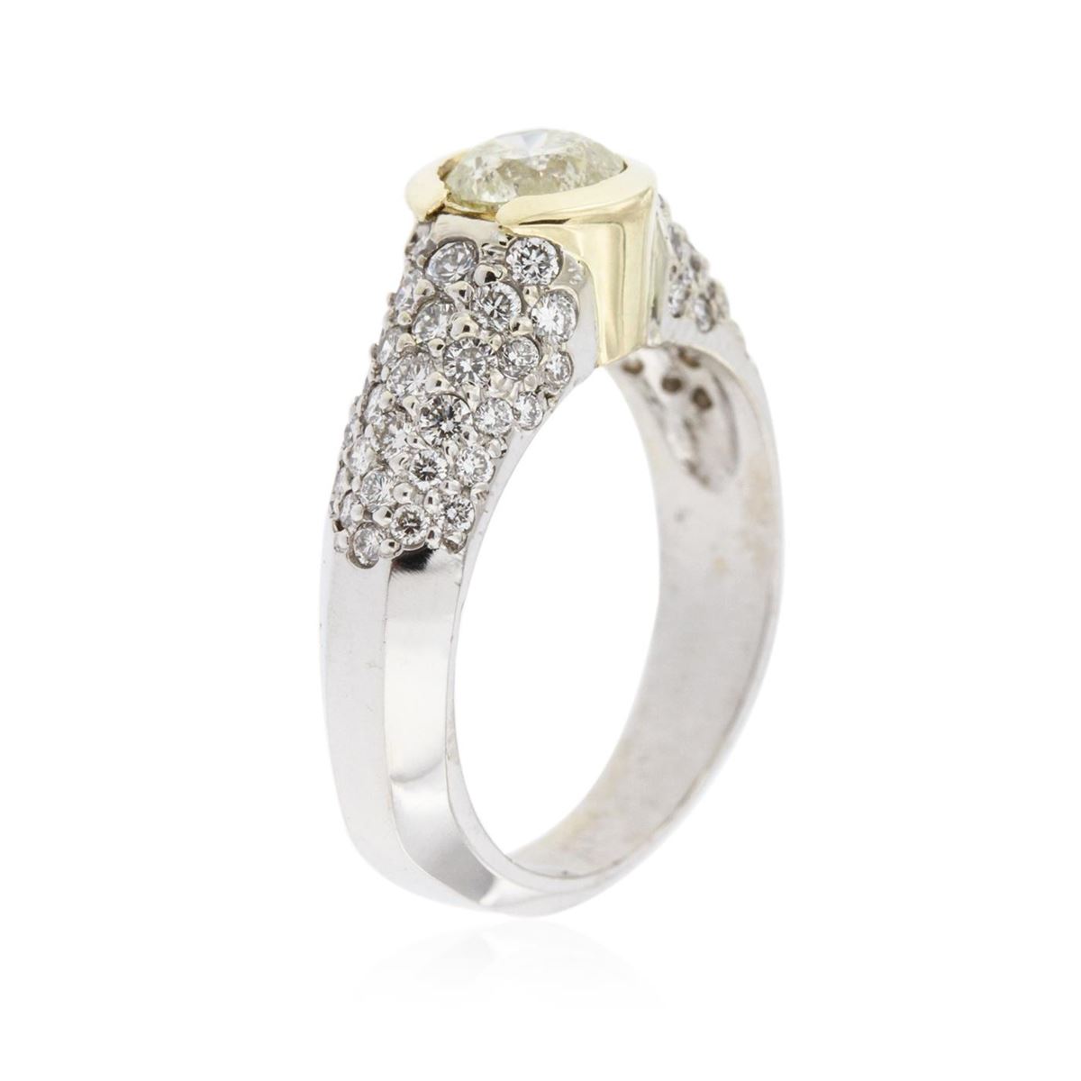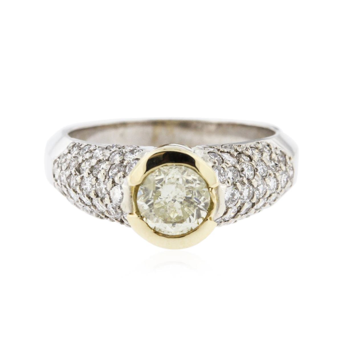 One electronically tested 14KT white and yellow gold ladies cast diamond engagement ring with a bright polish finish. Identified with markings of "14K". Condition is new. Containing: One bezel set round brilliant cut diamond, measuring 6.00 - 6.00 x 3.60mm (depth est.) approximate weight of 0.79ct. Clarity: I-2, Cut is Good. Forty-Four prong set round brilliant cut diamonds, measuring 1.70 - 1.70 x 1.02mm (depth est.) approximate total weight of 44 Stones = 0.79ct. Clarity: SI-1. Color: I - J, Cut is Good. All diamonds are graded in the mounting, unless otherwise stated. Total Weight of Diamonds 1.58ct. Total Weight of Engagement Ring 6.80 grams. GGL Appraised at $4,855.00.