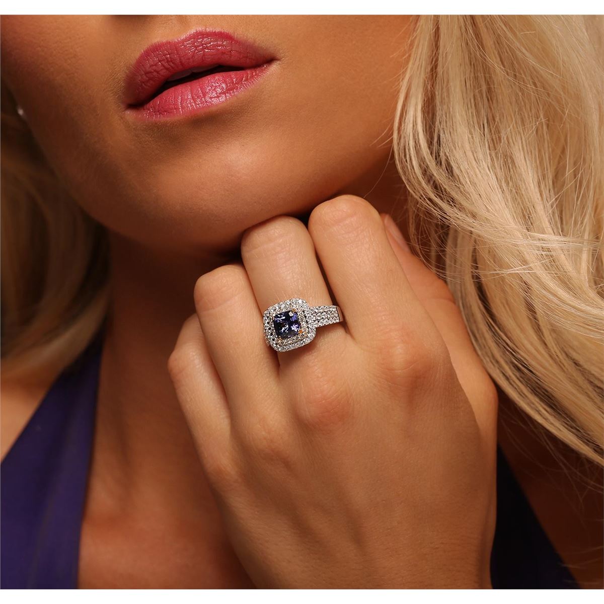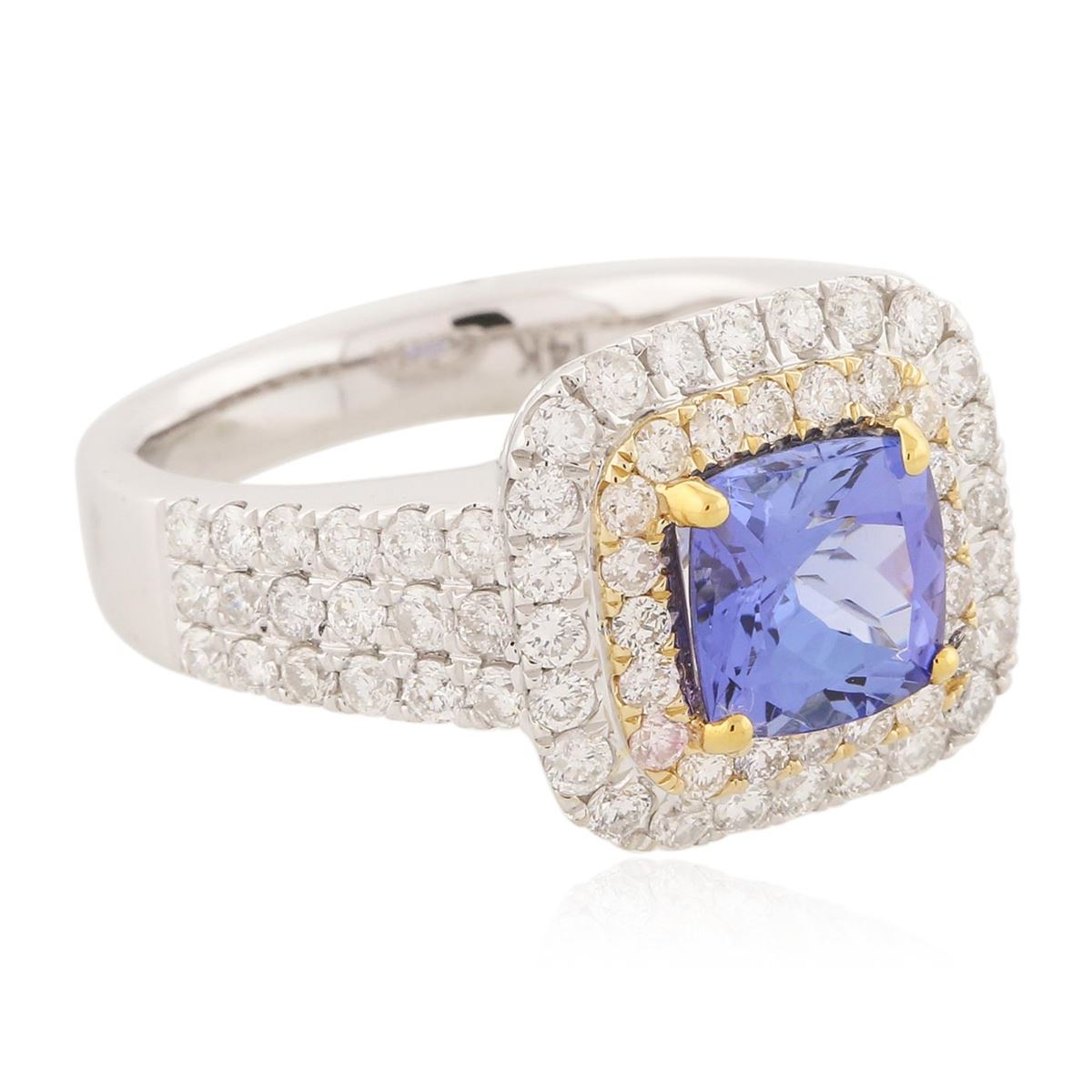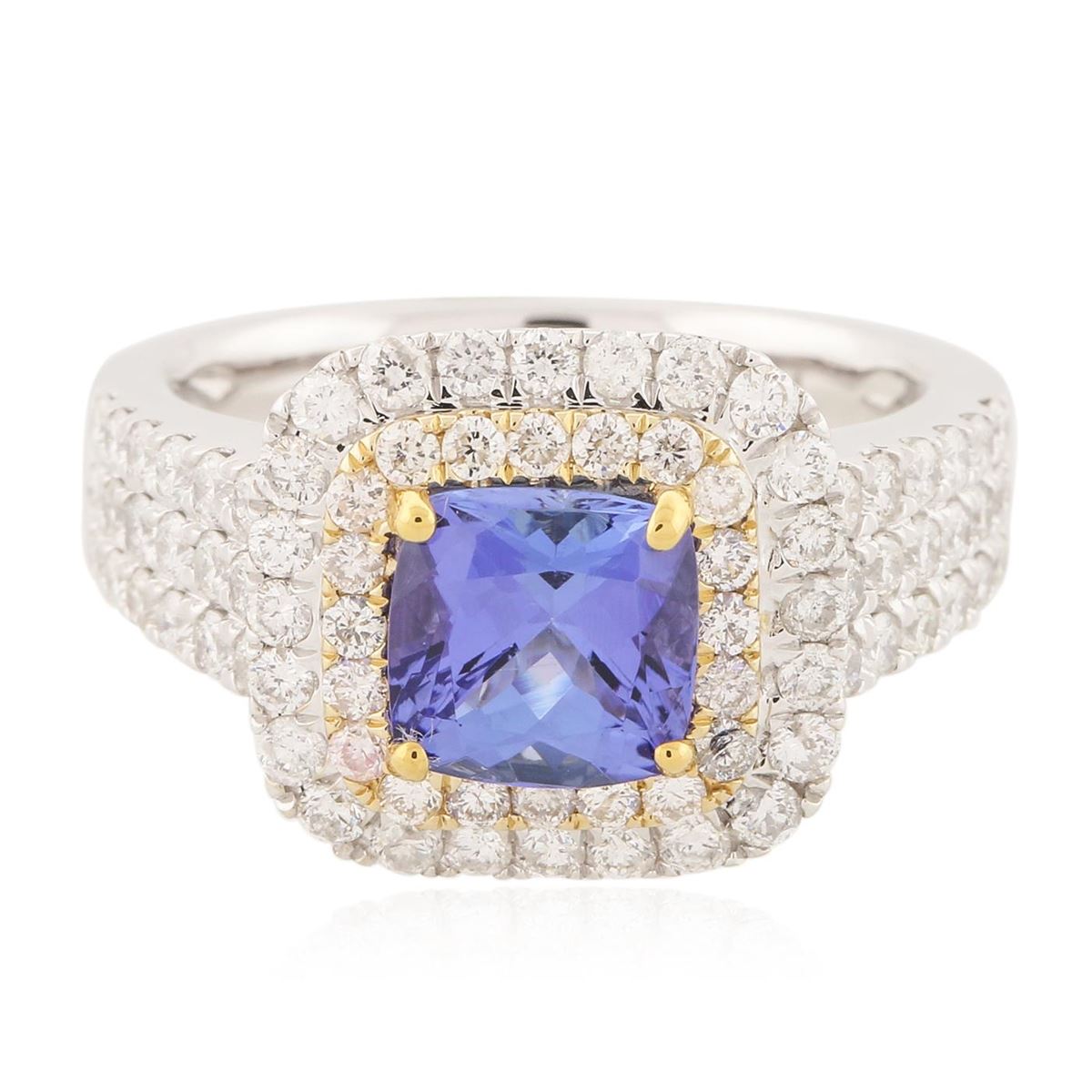 One electronically tested 14KT white and yellow gold Ladies combination cast & assembled fancy ring with a bright polish finish. Condition is new. Identified with markings of "14K". Containing: One prong set square cushion modified mixed cut natural tanzanite, measuring 7.00 x 7.00 x 4.55mm, approximate weight of 1.58ct., clarity is eye clean, type I, medium, very slightly grayish, bluish violet color, (GIA bV 5/3), cut is very good. Colored gemstones are presumed to have been subjected to commonly used color/clarity enhancement processes. Eighty prong set round brilliant cut diamonds, measuring 1.60 - 1.30 x 0.87mm (depth est.) approximate. Total Weight of 80 Stones = 0.89ct. Clarity: SI-2 to I-2. Color: H - I, Cut is Good. Total Weight of Colored Stones 1.58ct. Total Weight of Diamonds 0.89ct. Total Weight of Ring 6.40 grams. GGL Appraised at $6,675.00.