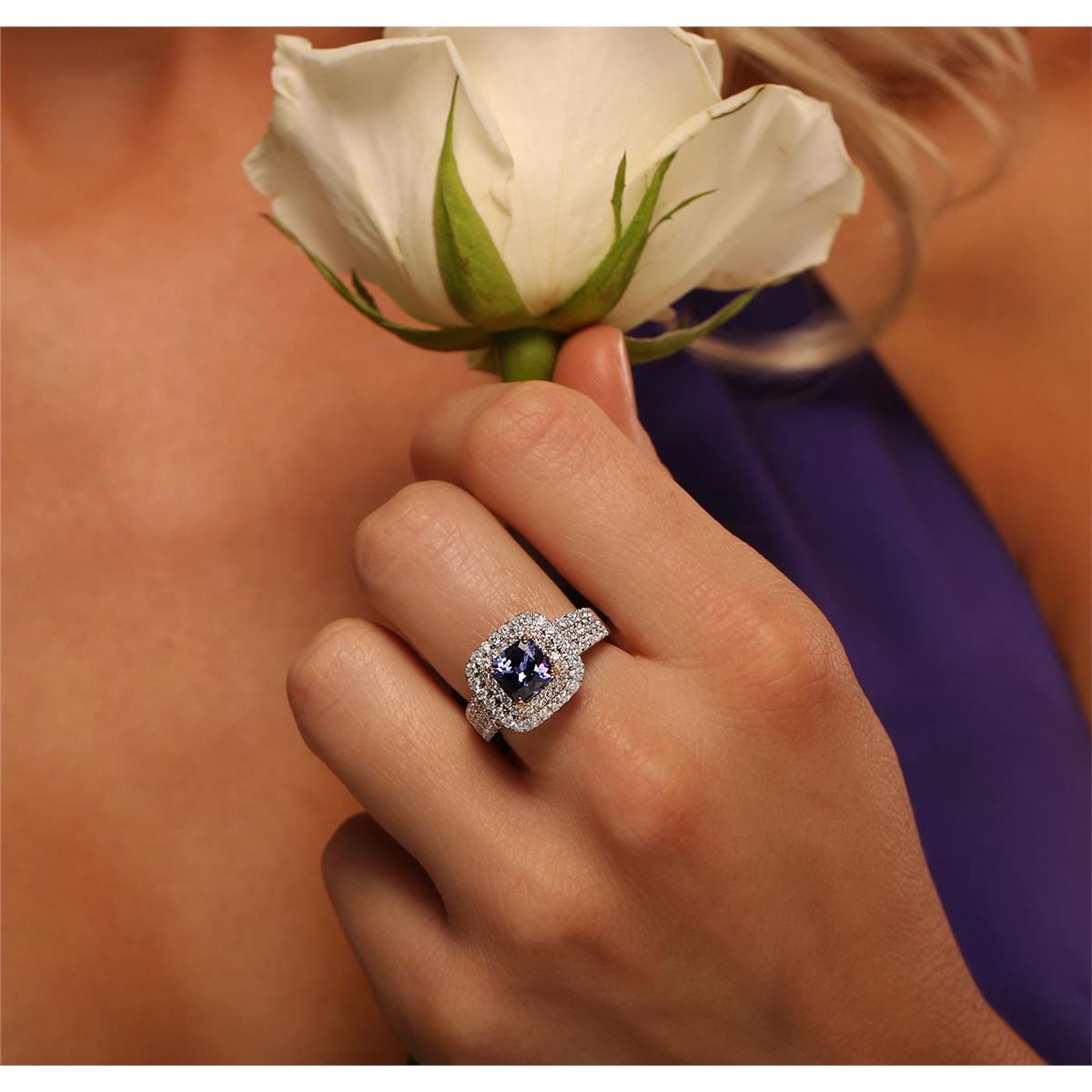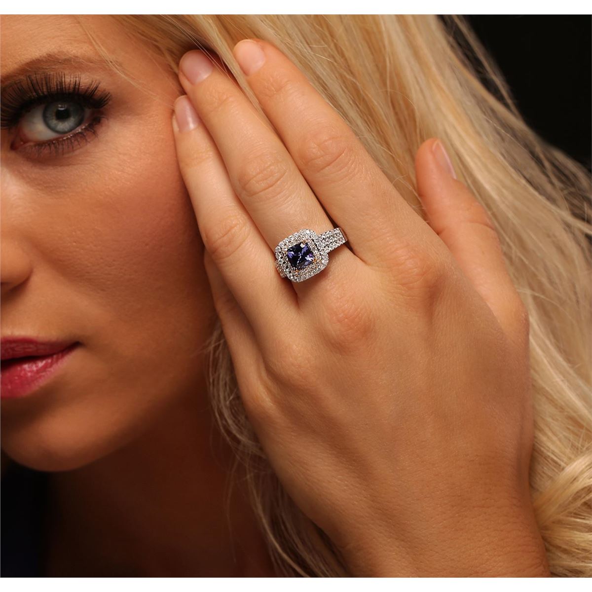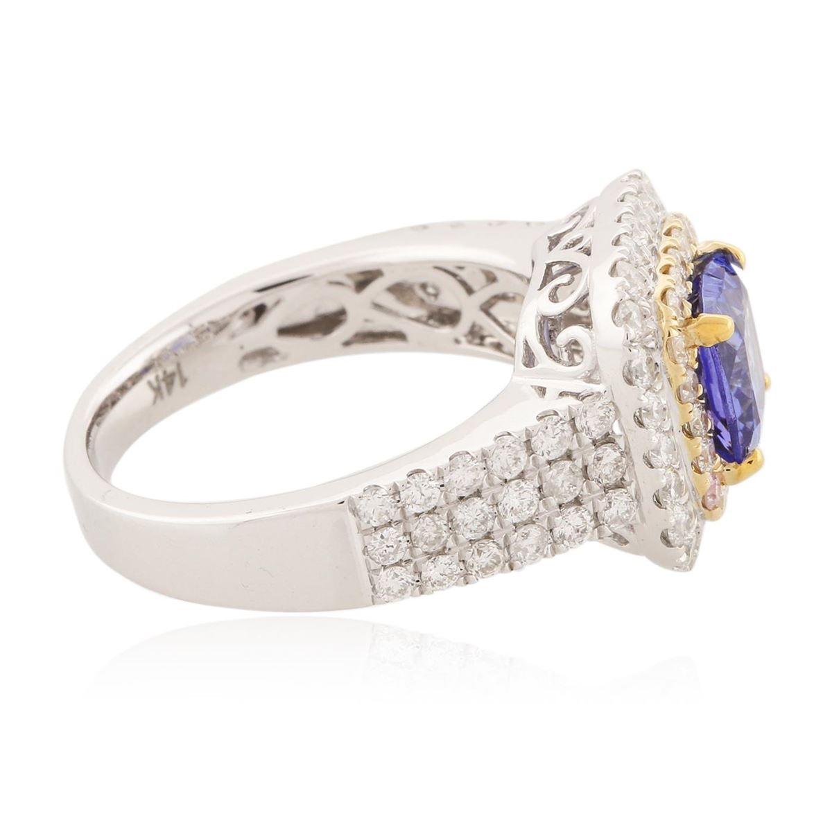 One electronically tested 14KT white and yellow gold Ladies combination cast & assembled fancy ring with a bright polish finish. Condition is new. Identified with markings of "14K". Containing: One prong set square cushion modified mixed cut natural tanzanite, measuring 7.00 x 7.00 x 4.55mm, approximate weight of 1.58ct., clarity is eye clean, type I, medium, very slightly grayish, bluish violet color, (GIA bV 5/3), cut is very good. Colored gemstones are presumed to have been subjected to commonly used color/clarity enhancement processes. Eighty prong set round brilliant cut diamonds, measuring 1.60 - 1.30 x 0.87mm (depth est.) approximate. Total Weight of 80 Stones = 0.89ct. Clarity: SI-2 to I-2. Color: H - I, Cut is Good. Total Weight of Colored Stones 1.58ct. Total Weight of Diamonds 0.89ct. Total Weight of Ring 6.40 grams. GGL Appraised at $6,675.00.