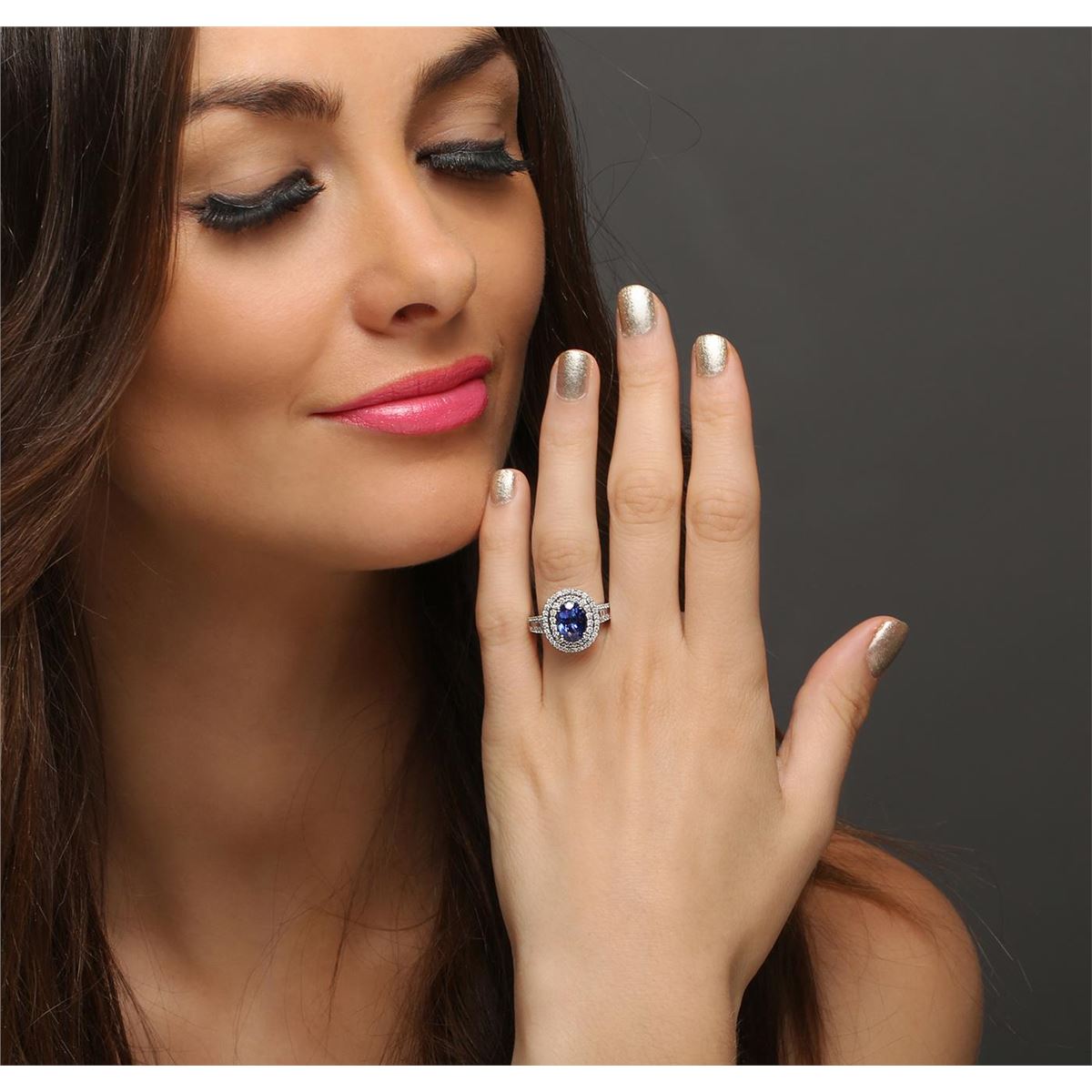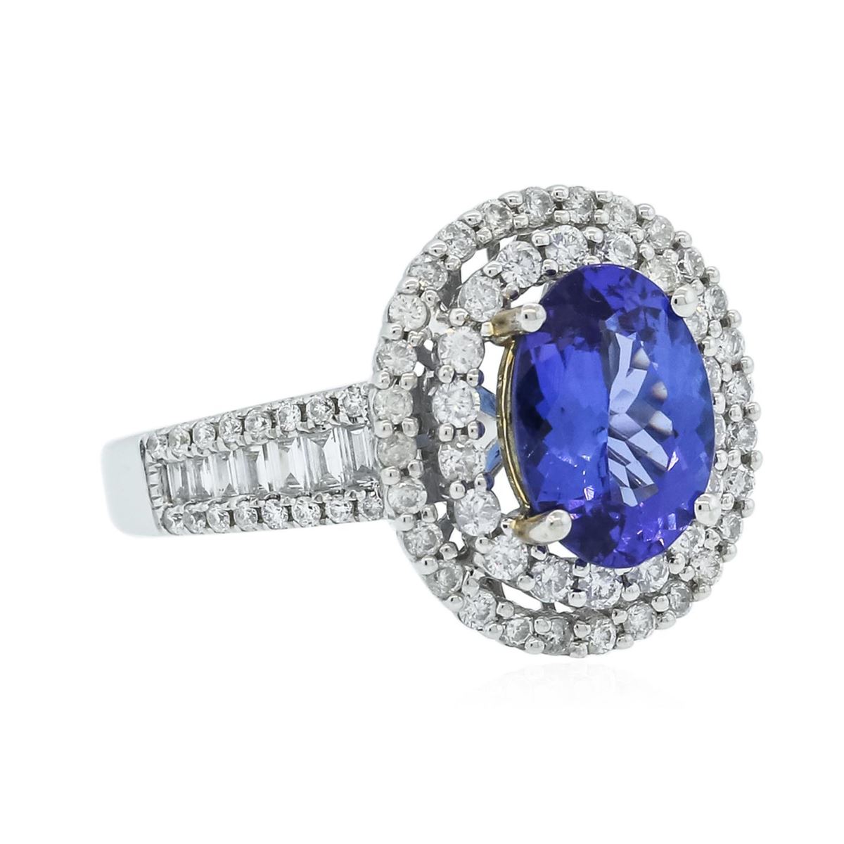 One electronically tested 14KT white and yellow gold ladies combination cast & assembled tanzanite and diamond ring with a flat shank with a bright polish finish. Identified with markings of "14K". Condition is new. Containing: One prong set oval modified brilliant cut natural tanzanite, measuring 9.99 x 7.13 x 3.23mm, approximate weight of 1.59ct., clarity is eye clean, type I, medium, moderately strong, bluish violet color, (GIA bV 5/4), cut is good. Seventy-Five prong set round brilliant cut diamonds, measuring 1.40 - 1.10 x 0.75mm (depth est.) stated total weight of 75 Stones = 0.53ct. Clarity: SI-2 to I-2. Color: H - I, Cut is Good. Fourteen channel set baguette cut diamonds, measuring from 1.20 x 1.20 x 1.03mm (depth est.) to 1.90 x 1.50 x 1.28mm (depth est.) approximate total weight of 14 Stones = 0.31ct. Clarity: SI-1 to SI-2. Color: H - I, Cut is Good. Colored gemstones are presumed to have been subjected to commonly used enhancement processes. All diamonds and colored gemstones are graded in the mounting, unless otherwise stated total weight of Colored Stones 1.59ct. Total Weight of Diamonds 0.84ct. Total Weight of Ring 5.90 grams. GGL Appraised at $6,600.00.