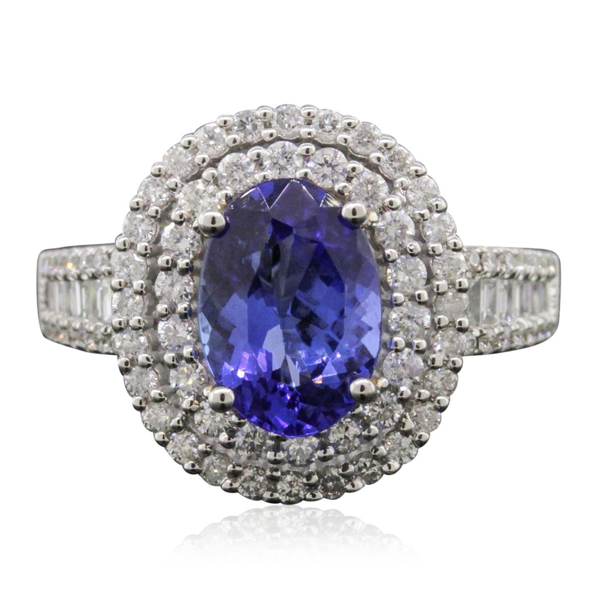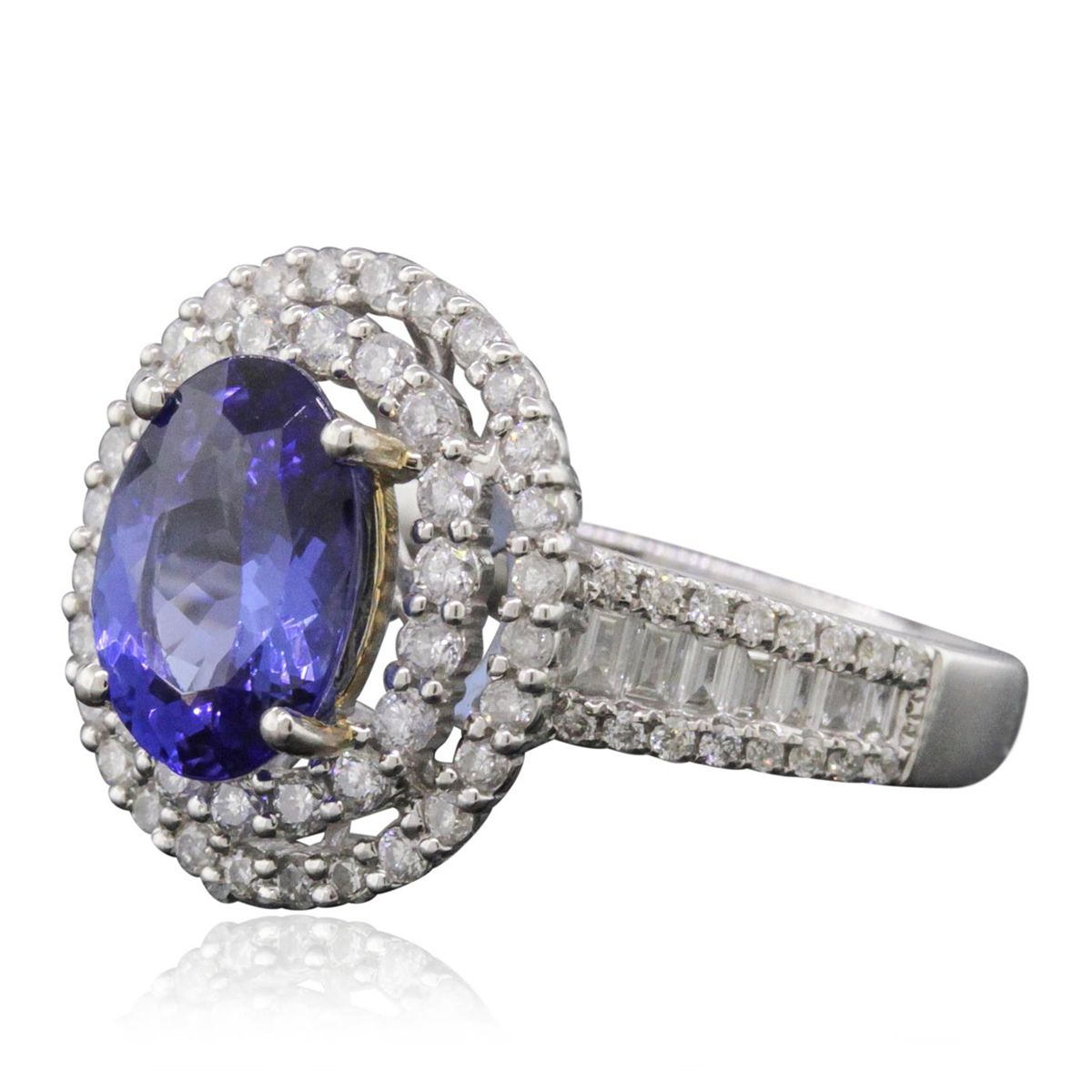 One electronically tested 14KT white and yellow gold ladies combination cast & assembled tanzanite and diamond ring with a flat shank with a bright polish finish. Identified with markings of "14K". Condition is new. Containing: One prong set oval modified brilliant cut natural tanzanite, measuring 9.99 x 7.13 x 3.23mm, approximate weight of 1.59ct., clarity is eye clean, type I, medium, moderately strong, bluish violet color, (GIA bV 5/4), cut is good. Seventy-Five prong set round brilliant cut diamonds, measuring 1.40 - 1.10 x 0.75mm (depth est.) stated total weight of 75 Stones = 0.53ct. Clarity: SI-2 to I-2. Color: H - I, Cut is Good. Fourteen channel set baguette cut diamonds, measuring from 1.20 x 1.20 x 1.03mm (depth est.) to 1.90 x 1.50 x 1.28mm (depth est.) approximate total weight of 14 Stones = 0.31ct. Clarity: SI-1 to SI-2. Color: H - I, Cut is Good. Colored gemstones are presumed to have been subjected to commonly used enhancement processes. All diamonds and colored gemstones are graded in the mounting, unless otherwise stated total weight of Colored Stones 1.59ct. Total Weight of Diamonds 0.84ct. Total Weight of Ring 5.90 grams. GGL Appraised at $6,600.00.