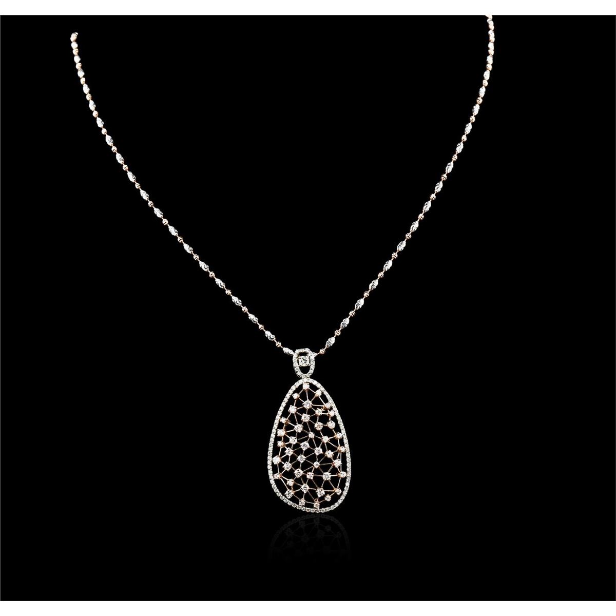 One electronically tested 14KT white and rose gold ladies combination cast & assembled diamond pendant & chain 18.0" long, cable link with a lobster claw clasp with a bright polish finish. Identified with markings of "585". Condition is new. Containing: Forty-Two prong set round brilliant cut diamonds, measuring 2.00 - 2.00 x 1.20mm (depth est.) approximate total weight of 42 Stones = 1.23ct. Clarity: I-1 to I-2. Color: I, Cut is Good. Sixty prong set round brilliant cut diamonds, measuring 1.10 - 1.10 x 0.66mm (depth est.) approximate total weight of 60 Stones = 0.29ct. Clarity: SI-2 to I-2. Color: I, Cut is Good. One prong set round brilliant cut diamond, measuring 3.00 - 3.00 x 1.80mm (depth est.) approximate weight of 0.10ct. Clarity: I-1. Color: J, Cut is Good. All diamonds are graded in the mounting, unless otherwise stated. Total Weight of Diamonds 1.61ct. Total Weight of Pendant & Chain 13.70 grams. GGL Appraised at $7,730.00.