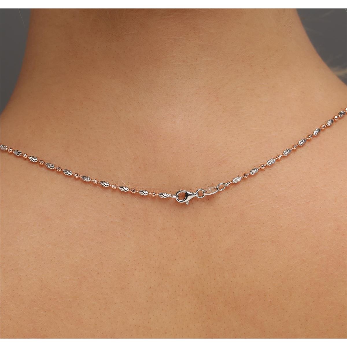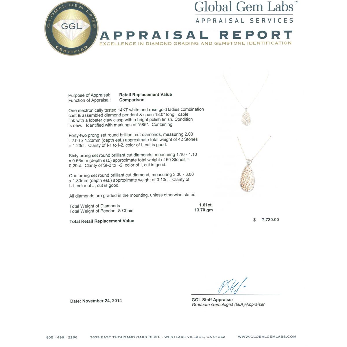 One electronically tested 14KT white and rose gold ladies combination cast & assembled diamond pendant & chain 18.0" long, cable link with a lobster claw clasp with a bright polish finish. Identified with markings of "585". Condition is new. Containing: Forty-Two prong set round brilliant cut diamonds, measuring 2.00 - 2.00 x 1.20mm (depth est.) approximate total weight of 42 Stones = 1.23ct. Clarity: I-1 to I-2. Color: I, Cut is Good. Sixty prong set round brilliant cut diamonds, measuring 1.10 - 1.10 x 0.66mm (depth est.) approximate total weight of 60 Stones = 0.29ct. Clarity: SI-2 to I-2. Color: I, Cut is Good. One prong set round brilliant cut diamond, measuring 3.00 - 3.00 x 1.80mm (depth est.) approximate weight of 0.10ct. Clarity: I-1. Color: J, Cut is Good. All diamonds are graded in the mounting, unless otherwise stated. Total Weight of Diamonds 1.61ct. Total Weight of Pendant & Chain 13.70 grams. GGL Appraised at $7,730.00.