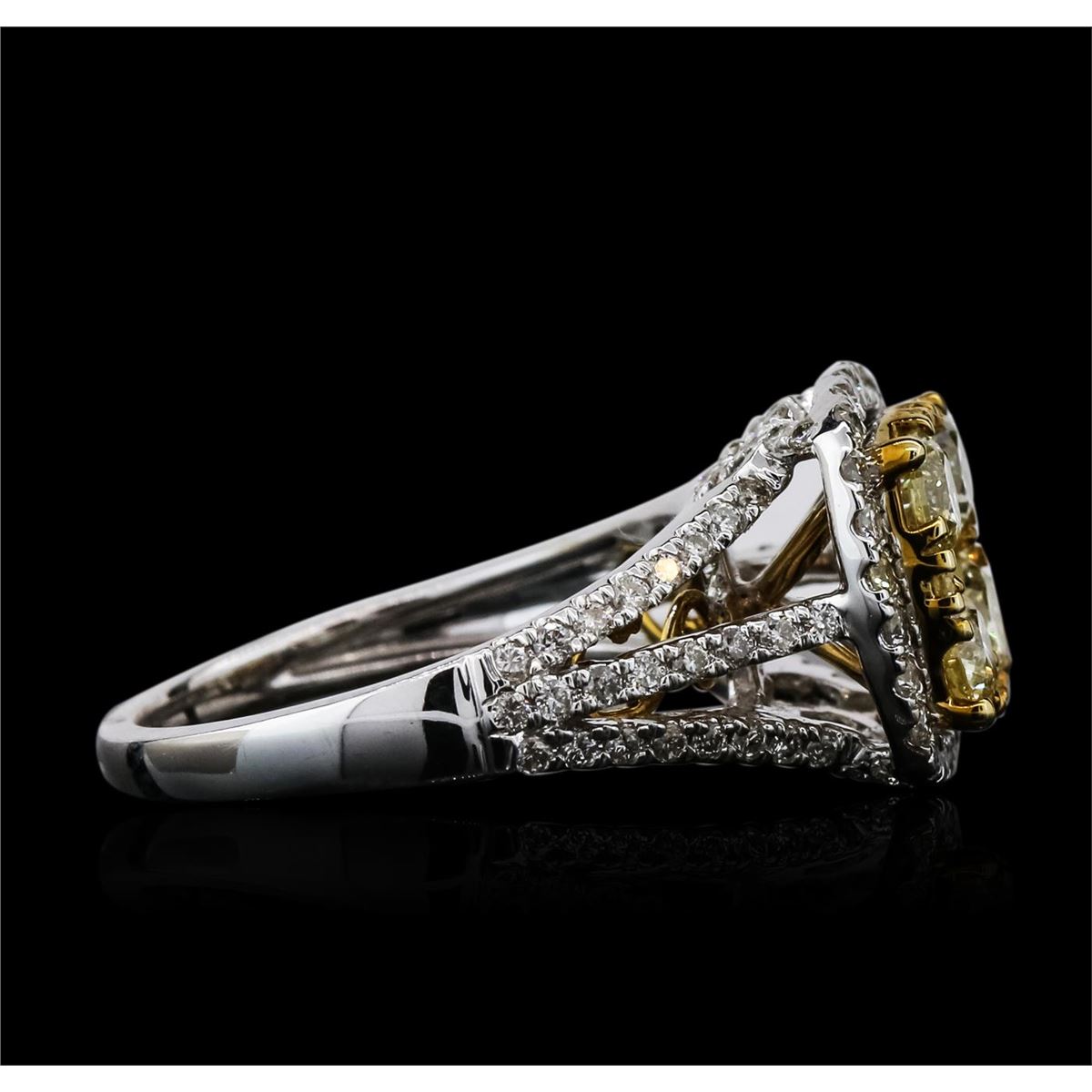 One electronically tested 14KT white and yellow gold ladies combination cast & assembled diamond ring with a bright polish finish. Identified with markings of "14K". Condition is new. Containing: Ninety-Four prong set round brilliant cut diamonds, measuring 1.20 - 1.20 x 0.72mm (depth est.) approximate total weight of 94 Stones = 0.59ct. Clarity: SI-1 to I-1. Color: I - J, Cut is Good. Five prong set round brilliant cut diamonds, measuring 4.00 - 3.00 x 2.10mm (depth est.) approximate total weight of 5 Stones = 1.00ct. Clarity: SI-1, Cut is Good. Four prong set round brilliant cut diamonds, measuring 1.50 - 1.50 x 0.90mm (depth est.) approximate total weight of 4 Stones = 0.05ct. Clarity: SI-2, Cut is Good. All diamonds are graded in the mounting, unless otherwise stated. Total Weight of Diamonds 1.64ct. Total Weight of Ring 6.40 grams. GGL Appraised at $7,220.00.