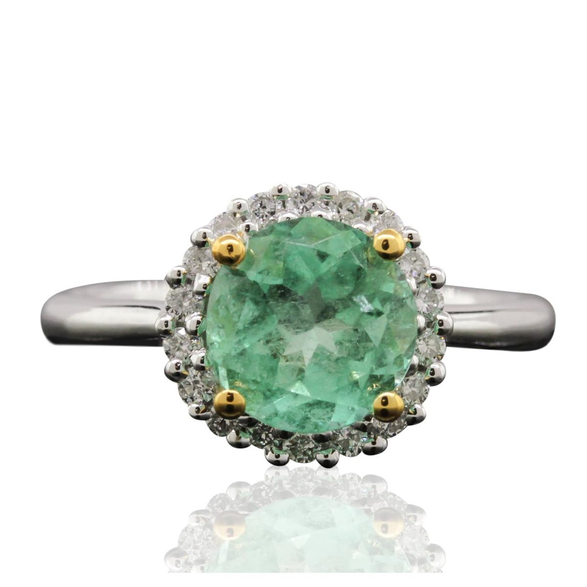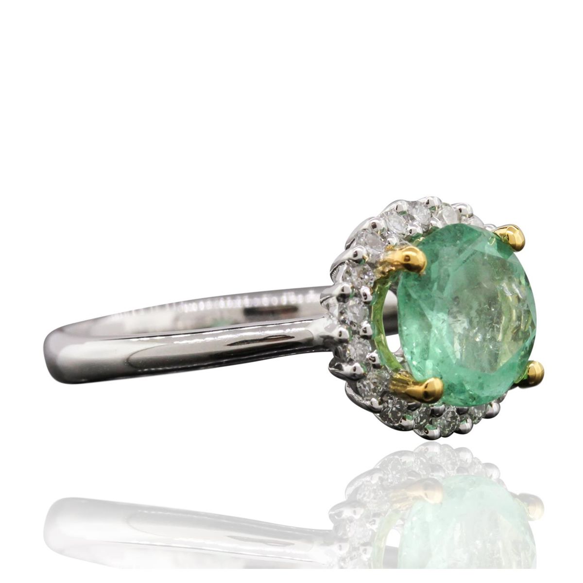One electronically tested 14KT white and yellow gold lady's combination cast and assembled ring with a bright polish finish. Condition is new. Identified with markings of "14K". Containing: One prong set round modified brilliant cut natural emerald, measuring 8.00. - 8.00. x 5.20 mm, approximate weight of 1.81ct., clarity is moderately included, type III, medium light, very slightly grayish, very slightly bluish green color, (GIA vslbG 4/3), cut is good. Colored gemstones are presumed to have been subjected to commonly used color/clarity enhancement processes. Eighteen prong set round brilliant cut diamonds, measuring 1.50 - 1.50 x 0.90mm (depth est.) approximate. Total Weight of 18 Stones = 0.22ct. . Clarity: I-1 to I-2. Color: I - J, Cut is Good. . Total Weight of Colored Stones 1.81ct. Total Weight of Diamonds 0.22ct. Total Weight of Ring 4.00 grams. Global Gem Labs Appraised at $5,325.00.