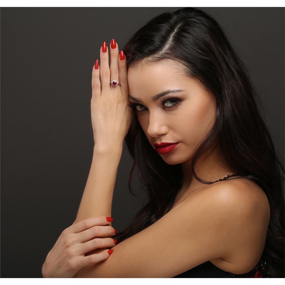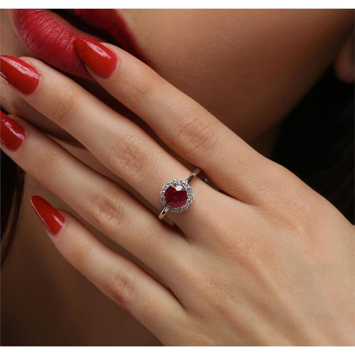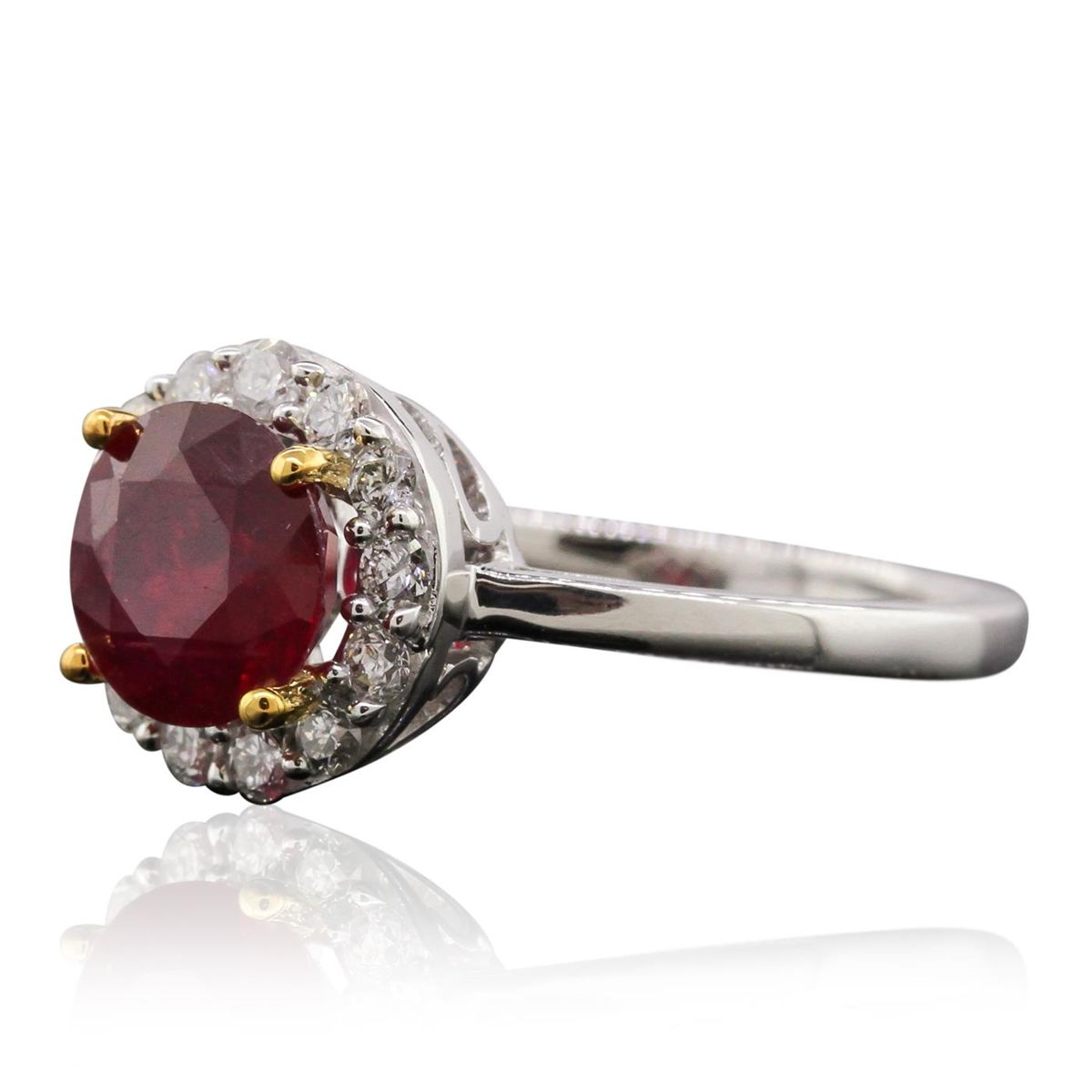 One electronically tested 14KT white and yellow gold Ladies combination cast & assembled ring with a bright polish finish. Condition is new. Identified with markings of "14K". Containing: One prong set round modified brilliant cut natural ruby, measuring 7.10 - 7.10 x 4.62 mm, approximate weight of 1.86ct., clarity is heavily included, type II, medium dark, moderately strong, strongly purplish red color, (GIA stpR 6/4), cut is good. Colored gemstones are presumed to have been subjected to commonly used color/clarity enhancement processes. Thirteen prong set round brilliant cut diamonds, measuring 1.80 - 1.80 x 1.08mm (depth est.) approximate. Total Weight of 13 Stones = 0.28ct. . Clarity: I-1 to I-2. Color: I - J, Cut is Good. . Total Weight of Colored Stones 1.86ct. Total Weight of Diamonds 0.28ct. Total Weight of Ring 3.30 grams. GGL Appraised at $3,140.00.