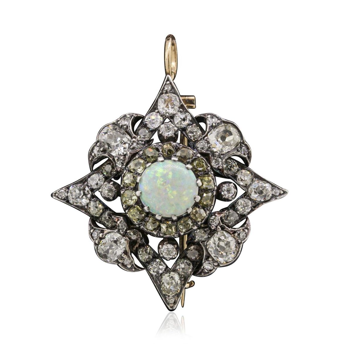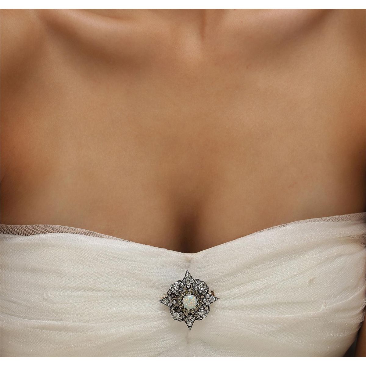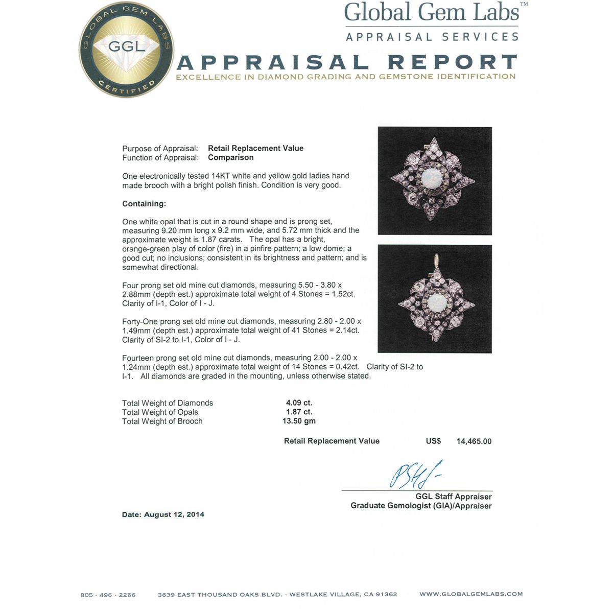 One electronically tested 14KT white and yellow gold ladies hand made brooch with a bright polish finish. Condition is very good. Containing: One white opal that is cut in a round shape and is prong set, measuring 9.20 mm long x 9.20 mm wide, and 3.00 mm thick and the approximate weight is 0.98 carats. The opal has a bright, orange-green play of color (fire) in a pinfire pattern; a low dome; a good cut; no inclusions; consistent in its brightness and pattern; and is somewhat directional. Four prong set old mine cut diamonds, measuring 5.50 - 3.80 x 2.88mm (depth est.) approximate. Total Weight of 4 Stones = 1.52ct. Clarity: I-1. Color: I - J. Forty-One prong set old mine cut diamonds, measuring 2.80 - 2.00 x 1.49mm (depth est.) approximate. Total Weight of 41 Stones = 2.14ct. Clarity: SI-2 to I-1. Color: I - J. Fourteen prong set old mine cut diamonds, measuring 2.00 - 2.00 x 1.24mm (depth est.) approximate. Total Weight of 14 Stones = 0.42ct. Clarity: SI-2 to I-1. All diamonds are graded in the mounting, unless otherwise stated. Total Weight of Diamonds 4.09ct. Total Weight of Opals 0.98ct. Total Weight of Brooch 13.50 grams. GGL Appraised at $14,465.00.