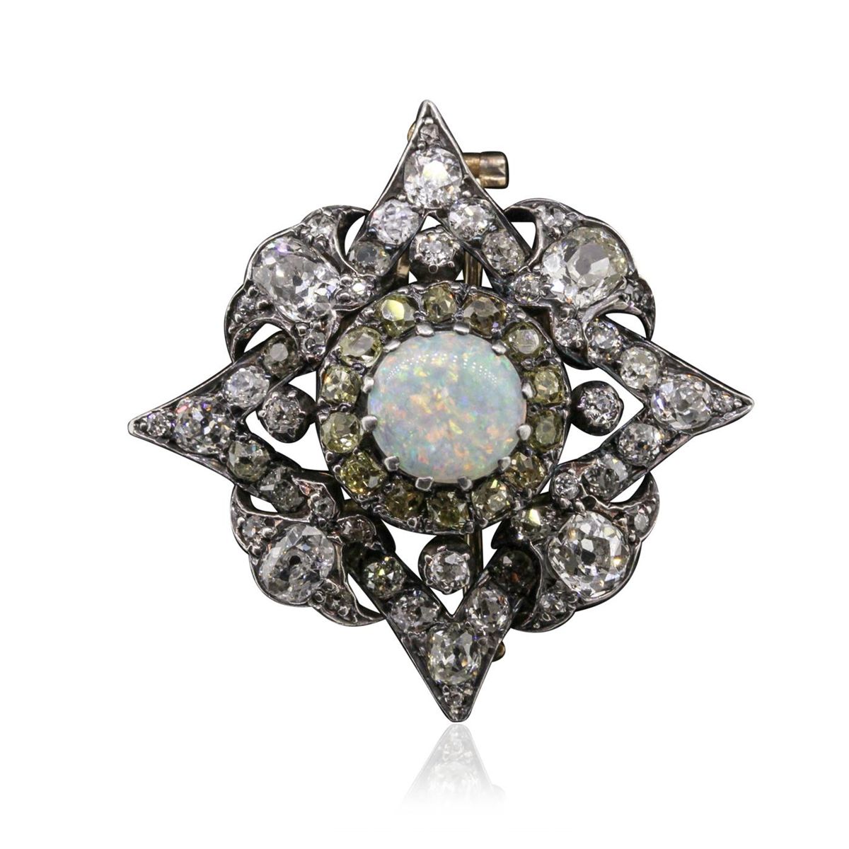 One electronically tested 14KT white and yellow gold ladies hand made brooch with a bright polish finish. Condition is very good. Containing: One white opal that is cut in a round shape and is prong set, measuring 9.20 mm long x 9.20 mm wide, and 3.00 mm thick and the approximate weight is 0.98 carats. The opal has a bright, orange-green play of color (fire) in a pinfire pattern; a low dome; a good cut; no inclusions; consistent in its brightness and pattern; and is somewhat directional. Four prong set old mine cut diamonds, measuring 5.50 - 3.80 x 2.88mm (depth est.) approximate. Total Weight of 4 Stones = 1.52ct. Clarity: I-1. Color: I - J. Forty-One prong set old mine cut diamonds, measuring 2.80 - 2.00 x 1.49mm (depth est.) approximate. Total Weight of 41 Stones = 2.14ct. Clarity: SI-2 to I-1. Color: I - J. Fourteen prong set old mine cut diamonds, measuring 2.00 - 2.00 x 1.24mm (depth est.) approximate. Total Weight of 14 Stones = 0.42ct. Clarity: SI-2 to I-1. All diamonds are graded in the mounting, unless otherwise stated. Total Weight of Diamonds 4.09ct. Total Weight of Opals 0.98ct. Total Weight of Brooch 13.50 grams. GGL Appraised at $14,465.00.
