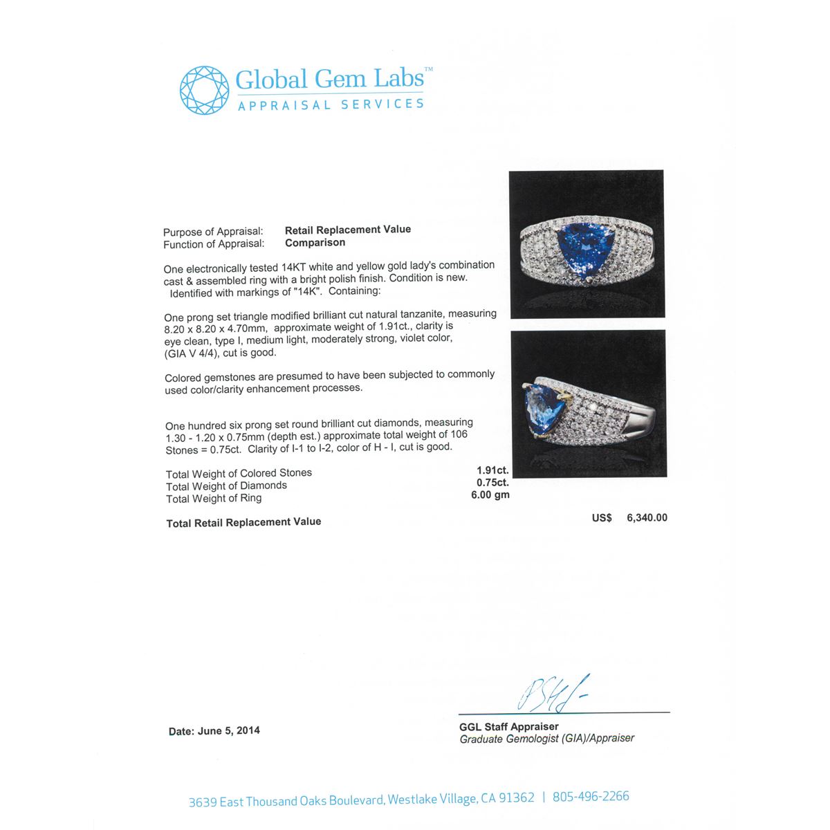 One electronically tested 14KT white and yellow gold Ladies combination cast & assembled ring with a bright polish finish. Condition is new. Identified with markings of "14K". Containing: One prong set triangle modified brilliant cut natural tanzanite, measuring 8.20 x 8.20 x 4.70mm, approximate weight of 1.91ct., clarity is eye clean, type I, medium light, moderately strong, violet color, (GIA V 4/4), cut is good. Colored gemstones are presumed to have been subjected to commonly used color/clarity enhancement processes. One Hundred Six prong set round brilliant cut diamonds, measuring 1.30 - 1.20 x 0.75mm (depth est.) approximate. Total Weight of 106 Stones = 0.75ct. Clarity: I-1 to I-2. Color: H - I, Cut is Good. Total Weight of Colored Stones 1.91ct. Total Weight of Diamonds 0.75ct. Total Weight of Ring 6.00 grams. GGL Appraised at $6,340.00.