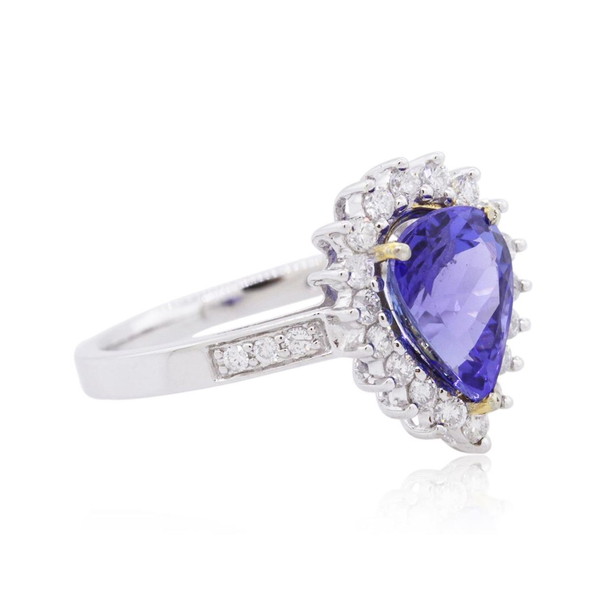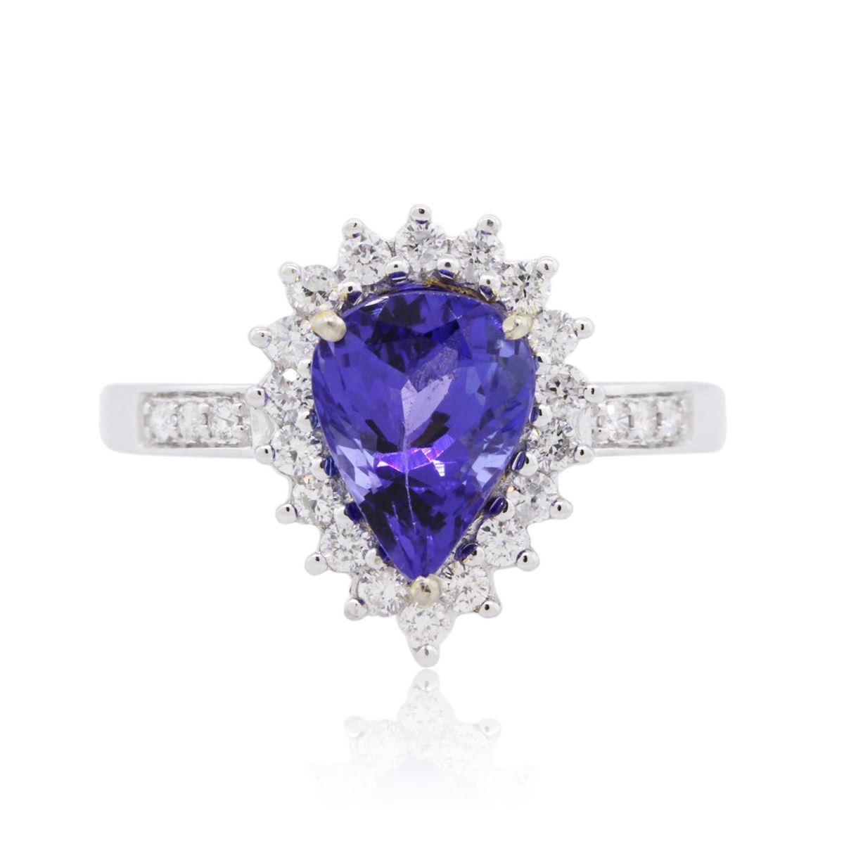 One electronically tested 14KT white and yellow gold ladies combination cast & assembled tanzanite and diamond ring with a flat shank with a bright polish finish. Identified with markings of "14K". Condition is new. Containing: One prong set pear modified brilliant cut natural tanzanite, measuring 9.00 x 7.00 x 4.55mm, approximate weight of 1.92ct., clarity is eye clean, type I, medium light, moderately strong, bluish violet color, (GIA bV 4/4), cut is good. Twenty-Four prong set round brilliant cut diamonds, measuring 1.50 - 1.30 x 0.84mm (depth est.) approximate total weight of 24 Stones = 0.24ct. Clarity: SI-2 to I-1. Color: H - I, Cut is Good. Colored gemstones are presumed to have been subjected to commonly used enhancement processes. All diamonds and colored gemstones are graded in the mounting, unless otherwise stated. Total Weight of Colored Stones 1.92ct. Total Weight of Diamonds 0.24ct. Total Weight of Ring 3.50 grams. GGL Appraised at $4,985.00.