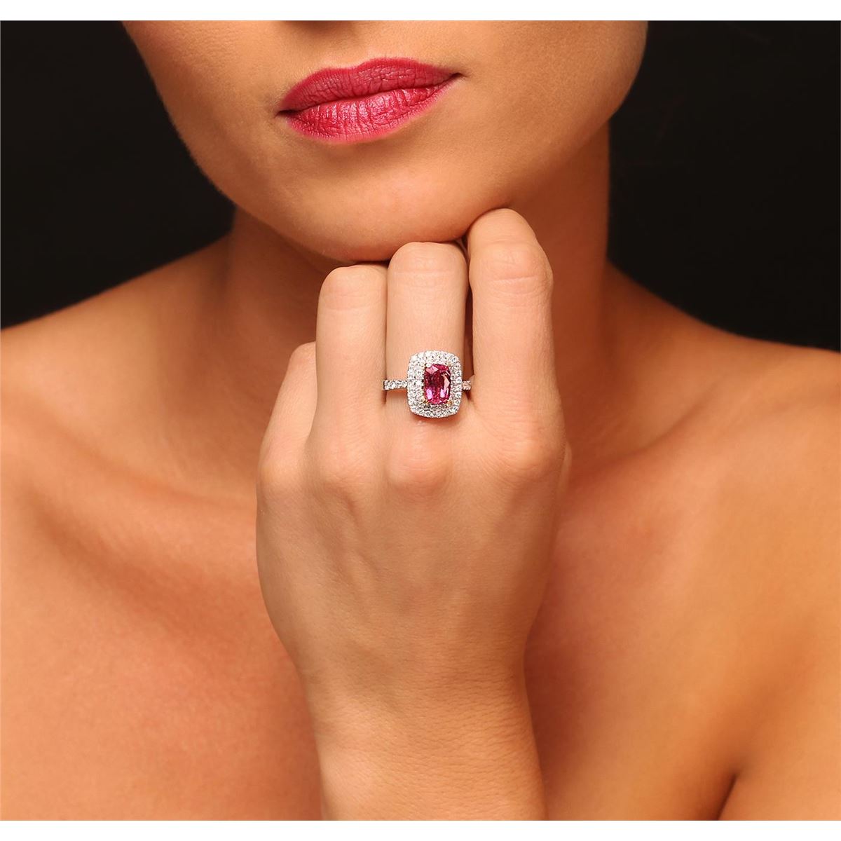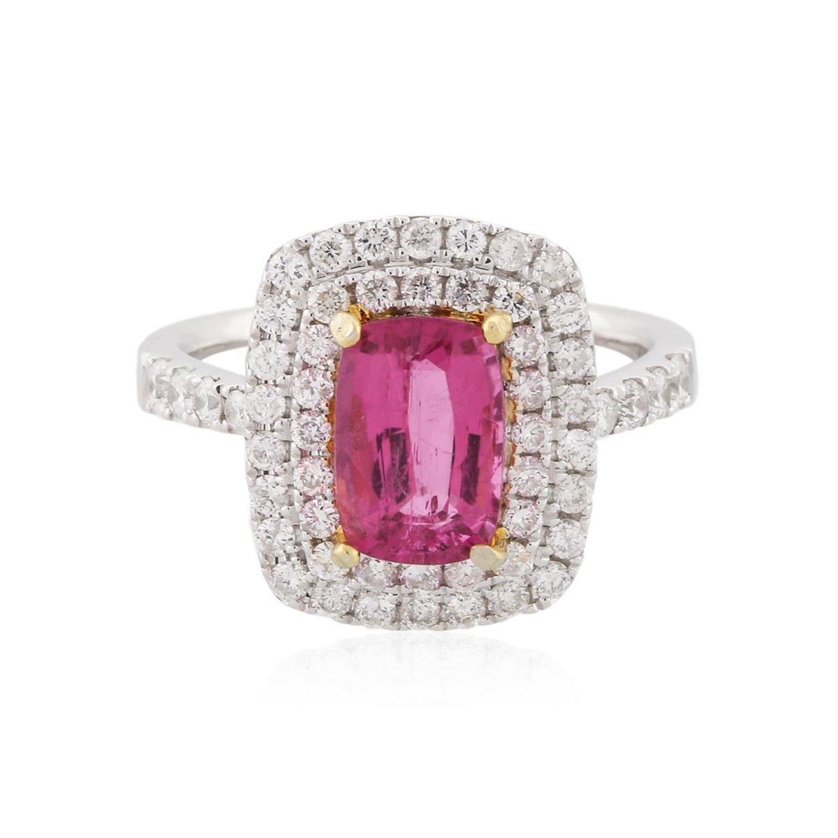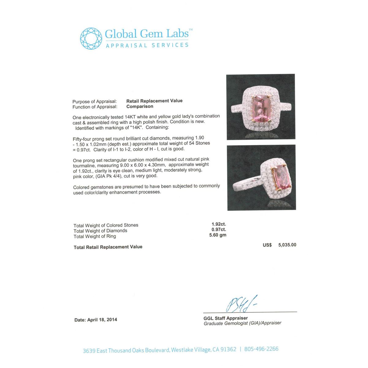 One electronically tested 14KT white and yellow gold Ladies combination cast & assembled ring with a high polish finish. Condition is new. Identified with markings of "14K". Containing: Fifty-Four prong set round brilliant cut diamonds, measuring 1.90 - 1.50 x 1.02mm (depth est.) approximate. Total Weight of 54 Stones = 0.97ct. Clarity: I-1 to I-2. Color: H - I, Cut is Good. One prong set rectangular cushion modified mixed cut natural pink tourmaline, measuring 9.00 x 6.00 x 4.30mm, approximate weight of 1.92ct., clarity is eye clean, medium light, moderately strong, pink color, (GIA Pk 4/4), cut is very good. Colored gemstones are presumed to have been subjected to commonly used color/clarity enhancement processes. Total Weight of Colored Stones 1.92ct. Total Weight of Diamonds 0.97ct. Total Weight of Ring 5.60 grams. GGL Appraised at $5,035.00.