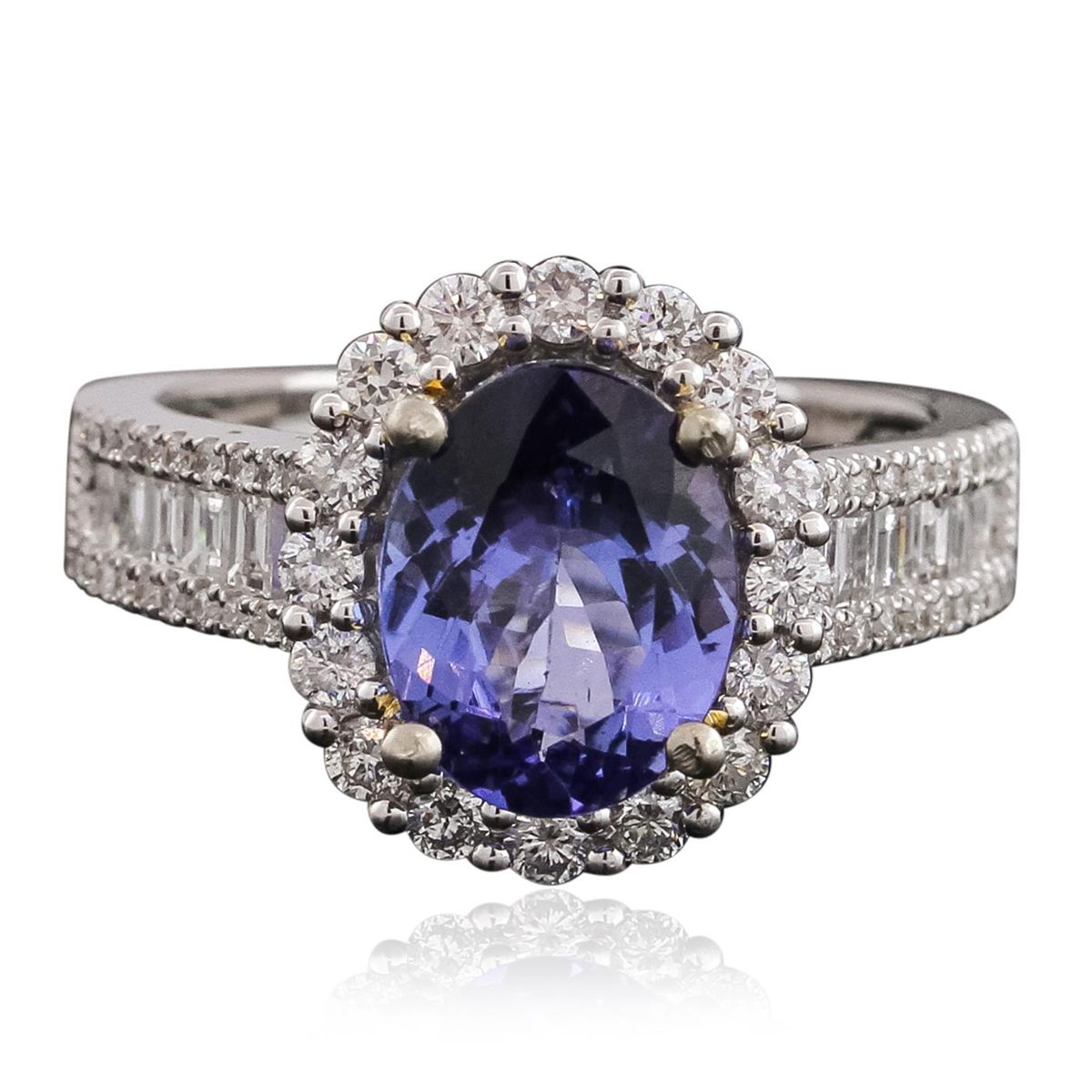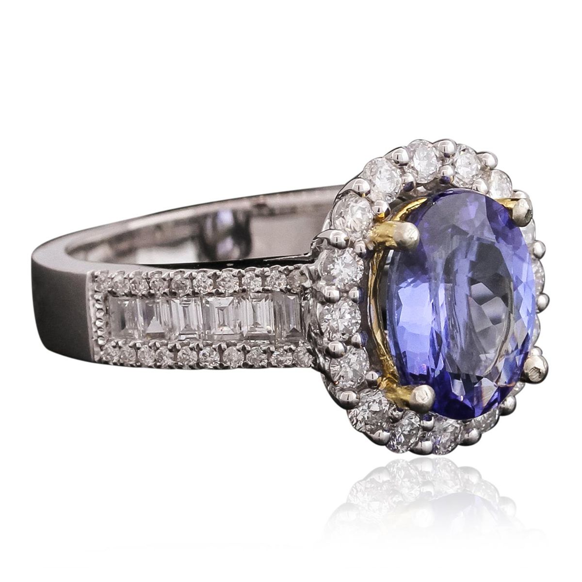One electronically tested 14KT white and yellow gold ladies combination cast & assembled tanzanite and diamond ring with a flat shank with a bright polish finish. Identified with markings of "14K". Condition is new. Containing: One prong set oval modified brilliant cut natural tanzanite, measuring 10.09 x 7.84 x 3.65mm, approximate weight of 1.97ct., clarity is eye clean, type I, medium, very slightly grayish, violet color, (GIA V 5/3), cut is good. Fifty-Six prong set round brilliant cut diamonds, measuring 1.70 - 1.10 x 0.84mm (depth est.) approximate total weight of 56 Stones = 0.56ct. Clarity: SI-2 to I-2. Color: I - J, Cut is Good. Twelve channel set baguette cut diamonds, measuring 2.00 x 1.50 x 1.28mm (depth est.) approximate total weight of 12 Stones = 0.42ct. Clarity: SI-1. Color: I - J, Cut is Good. Colored gemstones are presumed to have been subjected to commonly used enhancement processes. All diamonds and colored gemstones are graded in the mounting, unless otherwise stated total weight of Colored Stones 1.97ct. Total Weight of Diamonds 0.98ct. Total Weight of Ring 5.80 grams. GGL Appraised at $7,365.00.