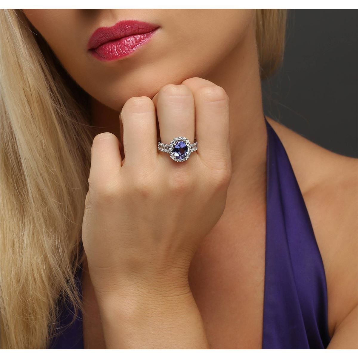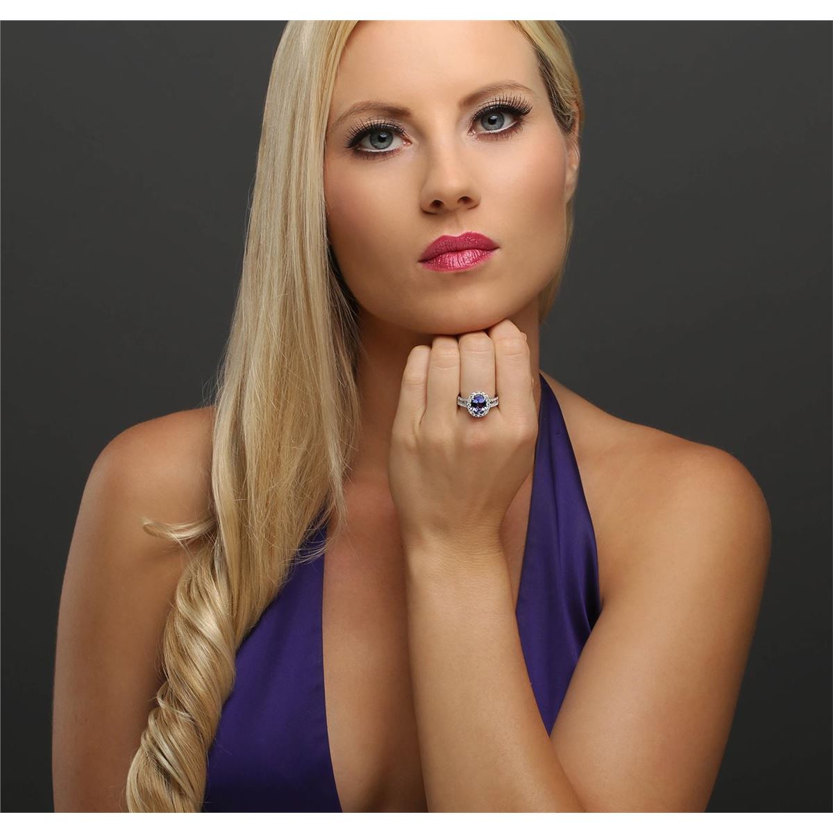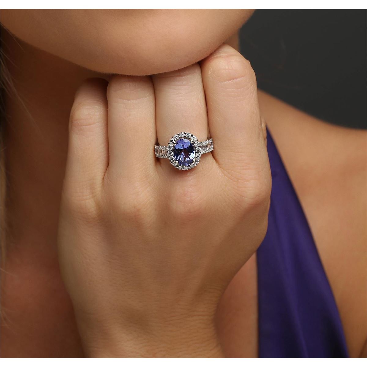 One electronically tested 14KT white and yellow gold ladies combination cast & assembled tanzanite and diamond ring with a flat shank with a bright polish finish. Identified with markings of "14K". Condition is new. Containing: One prong set oval modified brilliant cut natural tanzanite, measuring 10.09 x 7.84 x 3.65mm, approximate weight of 1.97ct., clarity is eye clean, type I, medium, very slightly grayish, violet color, (GIA V 5/3), cut is good. Fifty-Six prong set round brilliant cut diamonds, measuring 1.70 - 1.10 x 0.84mm (depth est.) approximate total weight of 56 Stones = 0.56ct. Clarity: SI-2 to I-2. Color: I - J, Cut is Good. Twelve channel set baguette cut diamonds, measuring 2.00 x 1.50 x 1.28mm (depth est.) approximate total weight of 12 Stones = 0.42ct. Clarity: SI-1. Color: I - J, Cut is Good. Colored gemstones are presumed to have been subjected to commonly used enhancement processes. All diamonds and colored gemstones are graded in the mounting, unless otherwise stated total weight of Colored Stones 1.97ct. Total Weight of Diamonds 0.98ct. Total Weight of Ring 5.80 grams. GGL Appraised at $7,365.00.