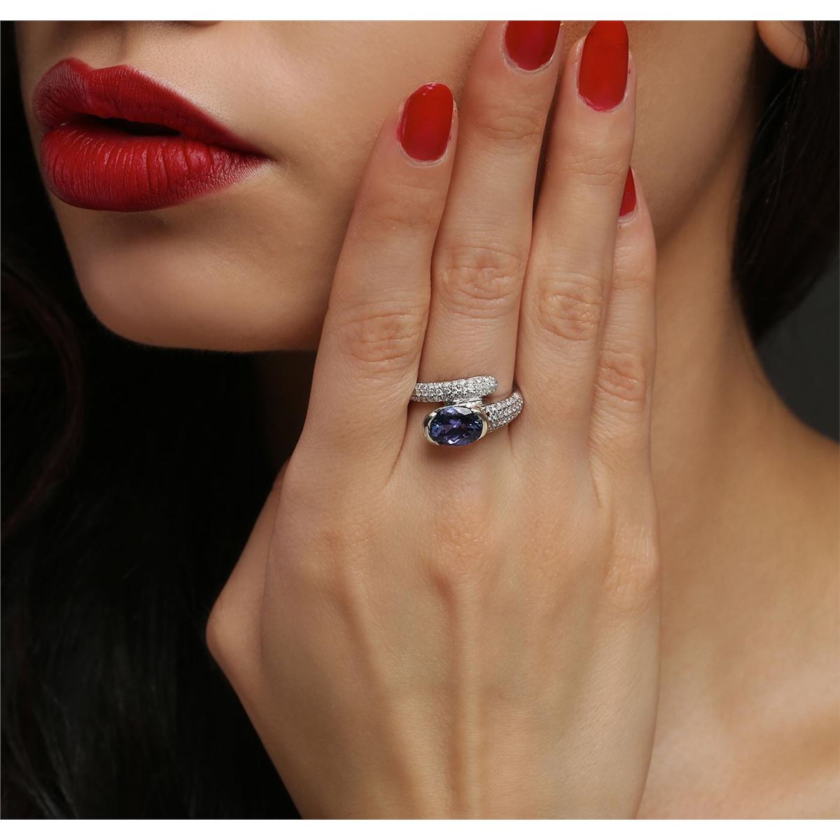 One electronically tested 14KT white and yellow gold ladies combination cast & assembled tanzanite and diamond ring with a flat shank with a bright polish finish. Identified with markings of "14K". Condition is new. Containing: One prong set oval modified brilliant cut natural tanzanite, measuring 9.84 x 6.84 x 4.27mm, approximate weight of 1.99ct., clarity is eye clean, type I, medium, moderately strong, violet color, (GIA V 5/4), cut is good. Eighty-Two prong set round brilliant cut diamonds, measuring 1.00 - 1.00 x 0.60mm (depth est.) approximate total weight of 82 Stones = 0.30ct. Clarity: I-1 to I-2. Color: I - J, Cut is Good. Colored gemstones are presumed to have been subjected to commonly used enhancement processes. All diamonds and colored gemstones are graded in the mounting, unless otherwise stated. Total Weight of Colored Stones 1.99ct. Total Weight of Diamonds 0.30ct. Total Weight of Ring 4.80 grams. GGL Appraised at $5,175.00.
