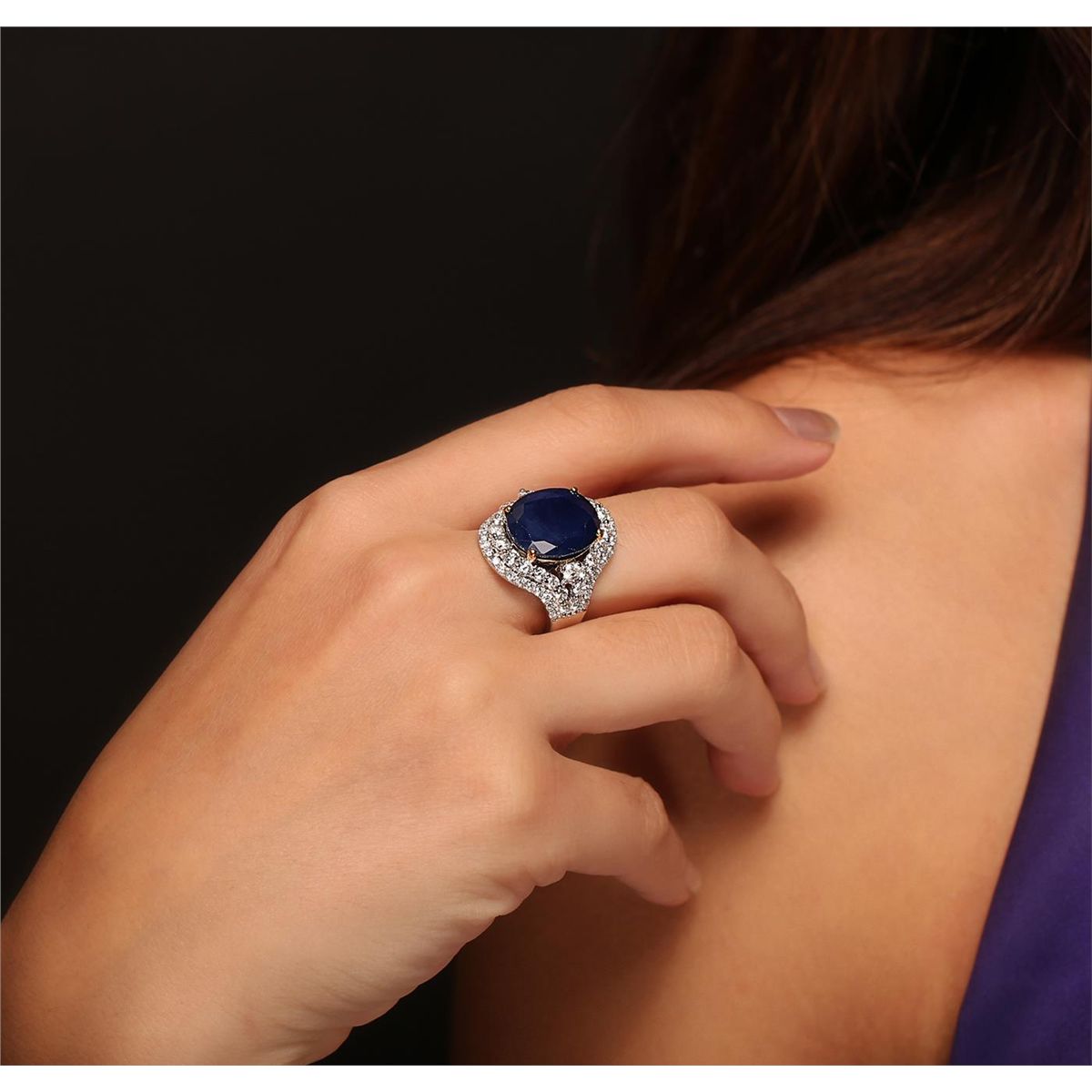 One electronically tested 14KT yellow and white gold Ladies combination cast & assembled ring with a bright polish finish. Condition is new. Identified with markings of "14K". Containing: Thirty-Eight prong set round brilliant cut diamonds, measuring 1.50 - 1.50 x 0.90mm (depth est.) approximate. Total Weight of 38 Stones = 1.00ct. Clarity: I-1 to I-2. Color: G - H, Cut is Good. Twenty-Six prong set round brilliant cut diamonds, measuring 1.90 - 1.90 x 1.14mm (depth est.) approximate. Total Weight of 26 Stones = 0.85ct. Clarity: I-1 to I-2. Color: G - H, Cut is Good. Two prong set round brilliant cut diamonds, measuring 2.70 - 2.70 x 1.62mm (depth est.) approximate. Total Weight of 2 Stones = 0.14ct. Clarity: I-1. Color: G - H, Cut is Good. One prong set oval modified brilliant cut natural blue sapphire, measuring 14.00 x 12.00 x 6.60mm, approximate weight of 10.10ct., clarity is heavily included, type II, medium dark, moderately strong, blue color, (GIA B 6/4), cut is good. Colored gemstones are presumed to have been subjected to commonly used color/clarity enhancement processes. Total Weight of Colored Stones 10.10ct. Total Weight of Diamonds 1.99ct. Total Weight of Ring 9.20 grams. GGL Appraised at $9,775.00.